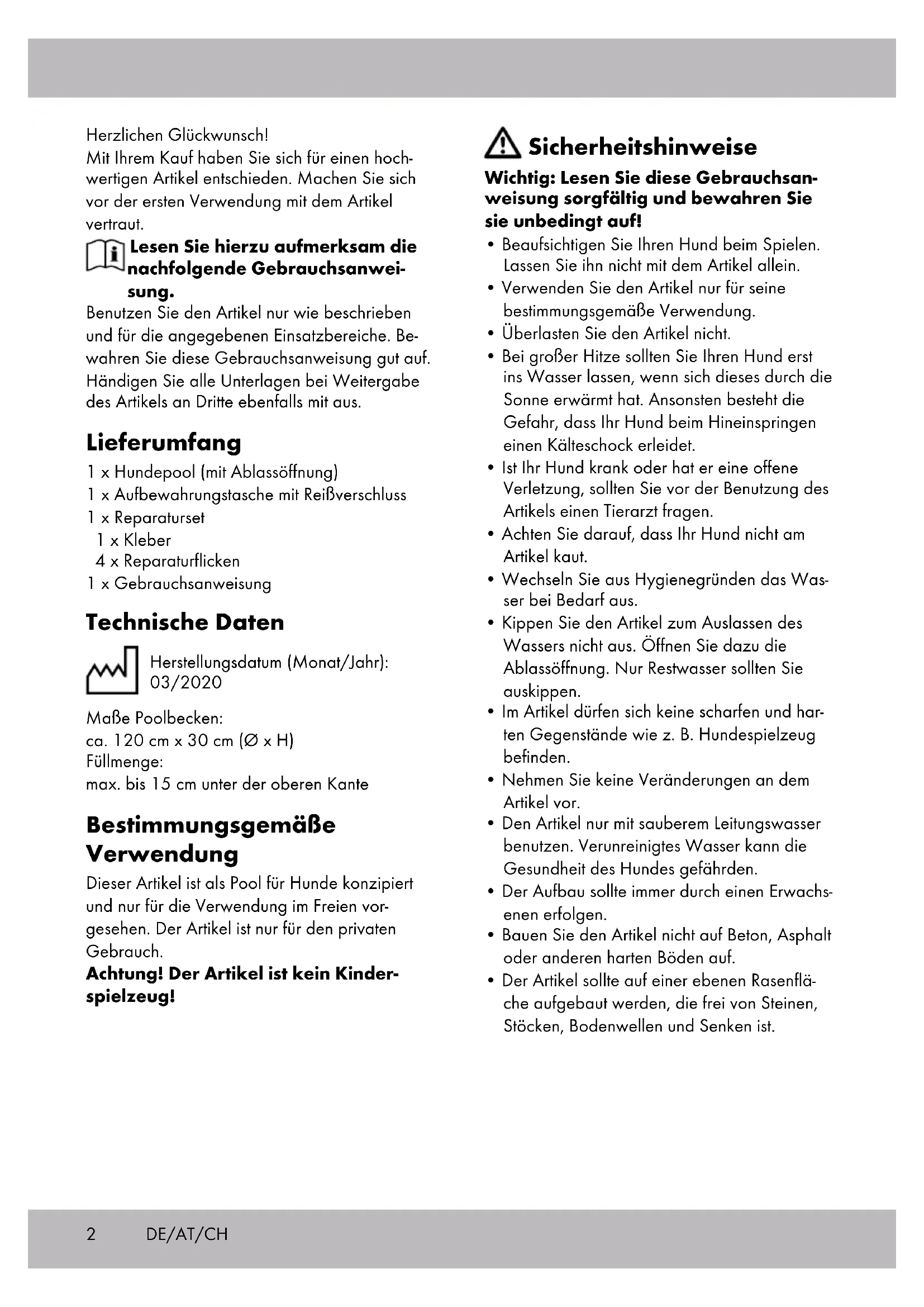 Návod k použití2 Herzlichen Glückwunsch! Mit Ihrem Kauf haben Sie sich für einen hoch- wertigen Artikel entschieden. Machen Sie sich vor der ersten Verwendung mit dem Artikel vertraut. Lesen Sie hierzu aufmerksam die nachfolgende Gebrauchsanwei- sung. Benutzen Sie den Artikel nur wie beschrieben und für die angegebenen Einsatzbereiche. Be- wahren Sie diese Gebrauchsanweisung gut auf. Händigen Sie alle Unterlagen bei Weitergabe des Artikels an Dritte ebenfalls mit aus. Lieferumfang 1 x Hundepool (mit Ablassöffnung) 1 x Aufbewahrungstasche mit Reißverschluss 1 x Reparaturset 1 x Kleber 4 x Reparaturflicken 1 x Gebrauchsanweisung Technische Daten Herstellungsdatum (Monat/Jahr): 03/2020 Maße Poolbecken: ca. 120 cm x 30 cm (Ø x H) Füllmenge: max. bis 15 cm unter der oberen Kante Bestimmungsgemäße Verwendung Dieser Artikel ist als Pool für Hunde konzipiert und nur für die Verwendung im Freien vor- gesehen. Der Artikel ist nur für den privaten Gebrauch. Achtung! Der Artikel ist kein Kinder- spielzeug! Sicherheitshinweise Wichtig: Lesen Sie diese Gebrauchsan- weisung sorgfältig und bewahren Sie sie unbedingt auf!