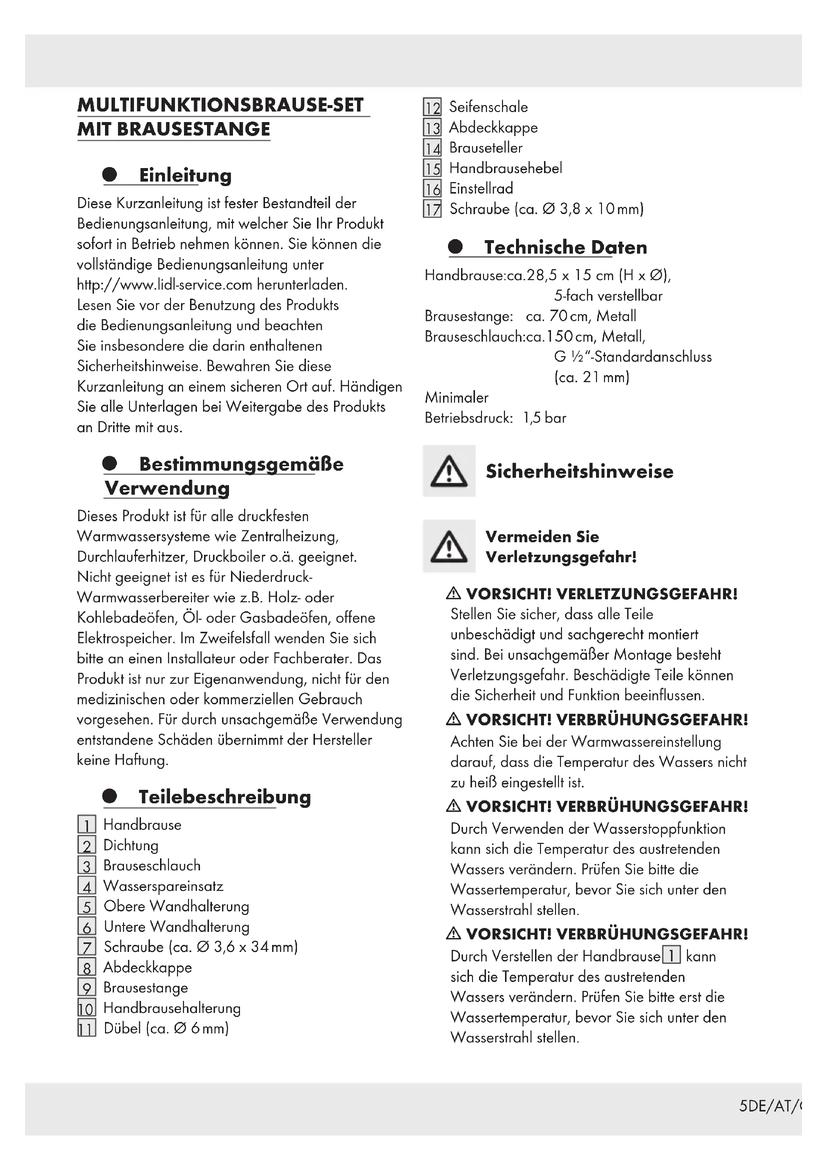 155DE/AT/CH MULTIFUNKTIONSBRAUSE-SET MIT BRAUSESTANGE Einleitung Diese Kurzanleitung ist fester Bestandteil der Bedienungsanleitung, mit welcher Sie Ihr Produkt sofort in Betrieb nehmen können. Sie können die vollständige Bedienungsanleitung unter http://www.lidl-service.com herunterladen. Lesen Sie vor der Benutzung des Produkts die Bedienungsanleitung und beachten Sie insbesondere die darin enthaltenen Sicherheitshinweise. Bewahren Sie diese Kurzanleitung an einem sicheren Ort auf. Händigen Sie alle Unterlagen bei Weitergabe des Produkts an Dritte mit aus. Bestimmungsgemäße Verwendung Dieses Produkt ist für alle druckfesten Warmwassersysteme wie Zentralheizung, Durchlauferhitzer, Druckboiler o.ä. geeignet. Nicht geeignet ist es für Niederdruck- Warmwasserbereiter wie z.B. Holz- oder Kohlebadeöfen, Öl- oder Gasbadeöfen, offene Elektrospeicher. Im Zweifelsfall wenden Sie sich bitte an einen Installateur oder Fachberater. Das Produkt ist nur zur Eigenanwendung, nicht für den medizinischen oder kommerziellen Gebrauch vorgesehen. Für durch unsachgemäße Verwendung entstandene Schäden übernimmt der Hersteller keine Haftung. Teilebeschreibung