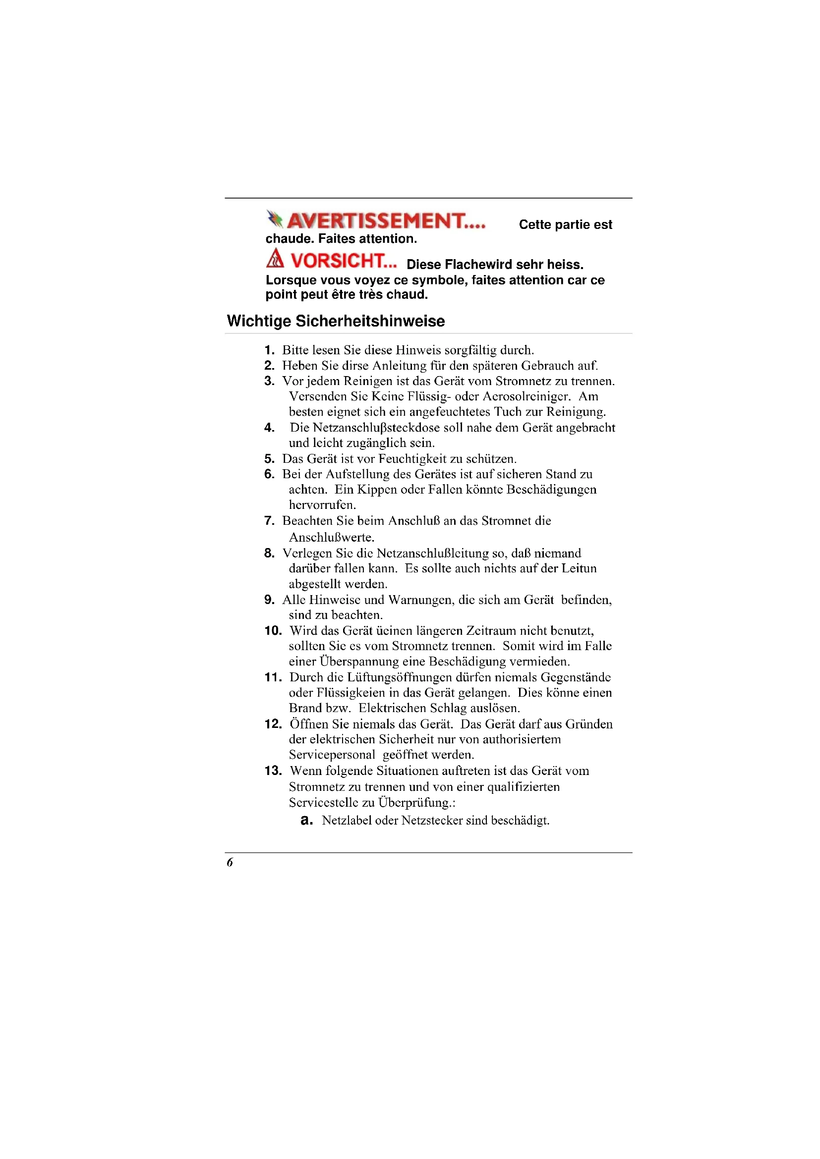 6. Bei der Aufstellung des Gerätes ist auf sicheren Stand zu