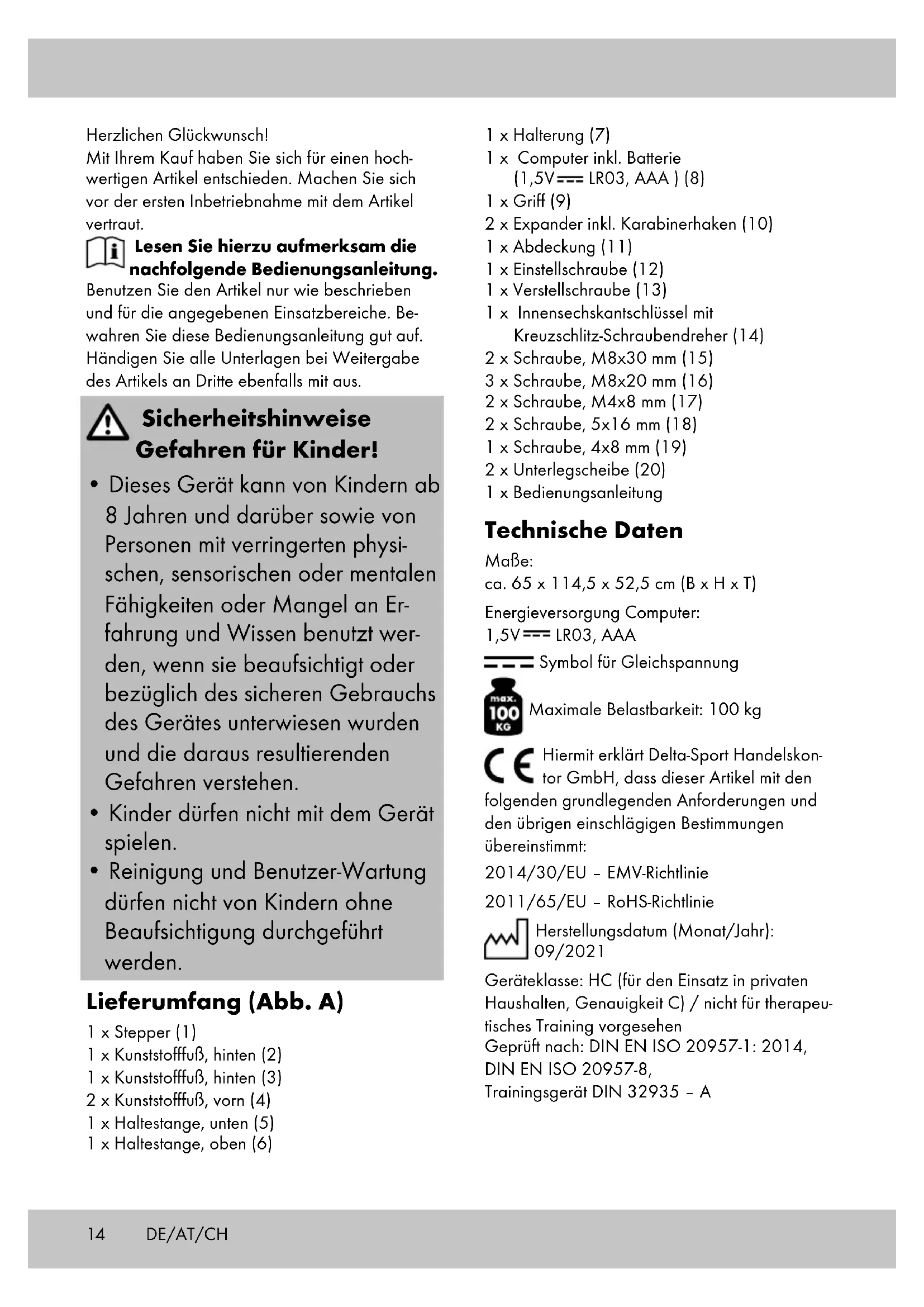 - Reinigung und Benutzer-Wartung dürfen nicht von Kindern ohne Beaufsichtigung durchgeführt werden. Lieferumfang (Abb. A) 1 x Stepper (1) 1 x Kunststofffuß, hinten (2) 1 x Kunststofffuß, hinten (3) 2 x Kunststofffuß, vorn (4) 1 x Haltestange, unten (5) 1 x Haltestange, oben (6) 1 x Halterung (7) 1 x Computer inkl. Batterie (1,5V LR03, AAA ) (8) 1 x Griff (9) 2 x Expander inkl. Karabinerhaken (10) 1 x Abdeckung (11) 1 x Einstellschraube (12) 1 x Verstellschraube (13) 1 x Innensechskantschlüssel mit Kreuzschlitz-Schraubendreher (14) 2 x Schraube, M8x30 mm (15) 3 x Schraube, M8x20 mm (16) 2 x Schraube, M4x8 mm (17) 2 x Schraube, 5x16 mm (18) 1 x Schraube, 4x8 mm (19) 2 x Unterlegscheibe (20) 1 x Bedienungsanleitung Technische Daten Maße: ca. 65 x 114,5 x 52,5 cm (B x H x T) Energieversorgung Computer: 1,5V LR03, AAA Symbol für Gleichspannung Maximale Belastbarkeit: 100 kg Hiermit erklärt Delta-Sport Handelskon- tor GmbH, dass dieser Artikel mit den folgenden grundlegenden Anforderungen und den übrigen einschlägigen Bestimmungen übereinstimmt: 2014/30/EU – EMV-Richtlinie 2011/65/EU – RoHS-Richtlinie Herstellungsdatum (Monat/Jahr): 09/2021 Geräteklasse: HC (für den Einsatz in privaten Haushalten, Genauigkeit C) / nicht für therapeu- tisches Training vorgesehen Geprüft nach: DIN EN ISO 20957-1: 2014, DIN EN ISO 20957-8, Trainingsgerät DIN 32935 – A DE/AT/CH15