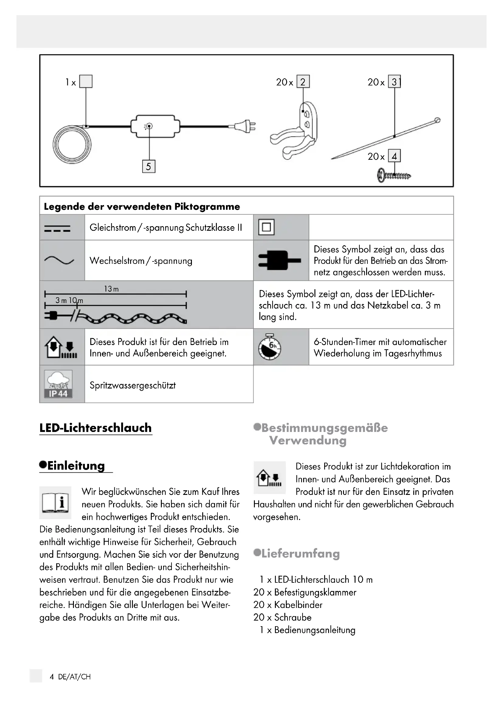 Wskazówki dotyczące obsługi i bezpieczeństwa IAN 349664_2001DE / AT / CH Bedienungs- und Sicherheitshinweise Seite 3 GB / IE Operation and safety notes Page 9 FR / BE Instructions d‘utilisation et consignes de sécurité Page 15 NL / BE Bedienings- en veiligheidsinstructies Pagina 22 PL Wskazówki dotyczące obsługi i bezpieczeństwa Strona 28 CZ Pokyny pro obsluhu a bezpečnostní pokyny Strana 34 SK Pokyny pre obsluhu a bezpečnostné pokyny Strana 403 DE/AT/CH Legende der verwendeten Piktogramme ........................................................Seite 4 Einleitung ......................................................................................................................................Seite 4 Bestimmungsgemäße Verwendung .................................................................................................Seite 4 Lieferumfang .....................................................................................................................................Seite 4 Teilebeschreibung ............................................................................................................................ Seite 5 Technische Daten ............................................................................................................................. Seite 5 Sicherheitshinweise .............................................................................................................Seite 5 Sicherheitshinweise zur Montage ................................................................................................... Seite 6 Montage ........................................................................................................................................Seite 6 Anwendung ...............................................................................................................................Seite 7 Timer verwenden .................................................................................................................. Seite 7 Reinigung und Pflege .........................................................................................................Seite 7 Lagerung ......................................................................................................................................Seite 7 Entsorgung .................................................................................................................................. Seite 7 Garantie ........................................................................................................................................ Seite 8 Abwicklung im Garantiefall .............................................................................................................Seite 8 Service ..............................................................................................................................................Seite 84 DE/AT/CH Legende der verwendeten Piktogramme Gleichstrom / -spannung Schutzklasse II Wechselstrom / -spannung Dieses Symbol zeigt an, dass das Produkt für den Betrieb an das Strom- netz angeschlossen werden muss. 13 m 3 m 10 m Dieses Symbol zeigt an, dass der LED-Lichter- schlauch ca. 13 m und das Netzkabel ca. 3 m lang sind. Dieses Produkt ist für den Betrieb im Innen- und Außenbereich geeignet. 6-Stunden-Timer mit automatischer Wiederholung im Tagesrhythmus Spritzwassergeschützt LED-Lichterschlauch Einleitung Wir beglückwünschen Sie zum Kauf Ihres neuen Produkts. Sie haben sich damit für ein hochwertiges Produkt entschieden. Die Bedienungsanleitung ist Teil dieses Produkts. Sie enthält wichtige Hinweise für Sicherheit, Gebrauch und Entsorgung. Machen Sie sich vor der Benutzung des Produkts mit allen Bedien- und Sicherheitshin- weisen vertraut. Benutzen Sie das Produkt nur wie beschrieben und für die angegebenen Einsatzbe- reiche. Händigen Sie alle Unterlagen bei Weiter- gabe des Produkts an Dritte mit aus. Bestimmungsgemäße Verwendung Dieses Produkt ist zur Lichtdekoration im Innen- und Außenbereich geeignet. Das Produkt ist nur für den Einsatz in privaten Haushalten und nicht für den gewerblichen Gebrauch vorgesehen. Lieferumfang 1 x LED-Lichterschlauch 10 m 20 x Befestigungsklammer 20 x Kabelbinder 20 x Schraube 1 x Bedienungsanleitung