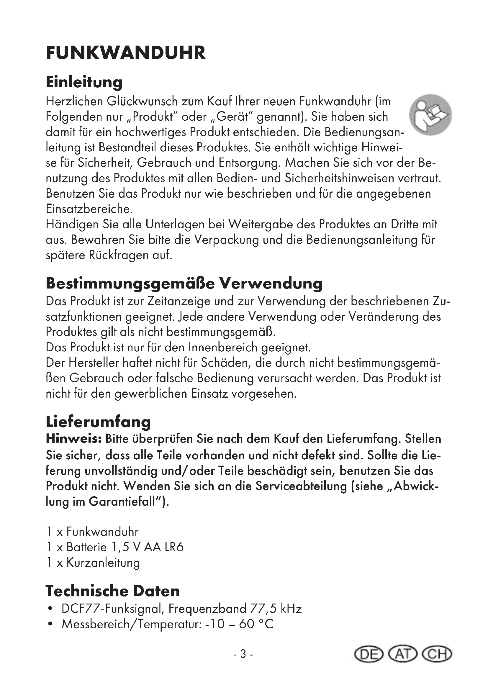 Üzemeltetési és biztonsági utasításokDE|AT|CH Bedienungs- und Sicherheitshinweise 1 FR|BE|CH Instructions d‘utilisation et de sécurité 18 GB|IE|NI|CY|MT Operating and safety instructions 36 NL|BE Bedienings- en veiligheidsinstructies 52 PL Instrukcja obsługi i bezpieczeństwa 68 CZ Provozní a bezpečnostní pokyny 85 SK Prevádzkové a bezpečnostné pokyny 100 ES Instrucciones de uso y seguridad 116 DK Betjenings- og sikkerhedsinstruktioner 132 IT|MT|CH Istruzioni per l‘uso e la sicurezza 147 HU Üzemeltetési és biztonsági utasítások 163- 1 - DE|AT|CH Bedienungs- und Sicherheitshinweise Inhaltsverzeichnis Inhaltsverzeichnis 1 Einleitung 3 Bestimmungsgemäße Verwendung 3 Lieferumfang 3 Technische Daten 3 Erklärung der Signalwörter 4 Zeichenerklärung 4 Wichtige Sicherheitshinweise 6 Sicherheitshinweise für Benutzer 6 Sicherheitshinweise zu der Batterie 7 Das Produkt sicher aufhängen 8 Rückseite und Bedienfelder 9 Inbetriebnahme 9 Empfangsstörung 10 Manuelle Einstellung 10 Manueller Start des Funksignals 10 Zurücksetzen (RESET) 10 Thermometer 11 Hygrometer 11 Batteriewechsel 11 Reinigungshinweis 11 Lagerung 11 Entsorgung 12 Entsorgung des Elektrogeräts 12 Entsorgung der Batterien 13 Vereinfachte EU-Konformitätserklärung 14 Garantie der digi-tech gmbh 15- 2 - Garantiebedingungen 15 Garantiezeit und gesetzliche Mängelansprüche 15 Garantieumfang 15 Abwicklung im Garantiefall 16 Service 17 Lieferant 17- 3 - FUNKWANDUHR Einleitung Herzlichen Glückwunsch zum Kauf Ihrer neuen Funkwanduhr (im Folgenden nur „Produkt“ oder „Gerät“ genannt) Sie haben sich damit für ein hochwertiges Produkt entschieden Die Bedienungsan- leitung ist Bestandteil dieses Produktes Sie enthält wichtige Hinwei- se für Sicherheit, Gebrauch und Entsorgung Machen Sie sich vor der Be- nutzung des Produktes mit allen Bedien- und Sicherheitshinweisen vertraut Benutzen Sie das Produkt nur wie beschrieben und für die angegebenen Einsatzbereiche Händigen Sie alle Unterlagen bei Weitergabe des Produktes an Dritte mit aus Bewahren Sie bitte die Verpackung und die Bedienungsanleitung für spätere Rückfragen auf Bestimmungsgemäße Verwendung Das Produkt ist zur Zeitanzeige und zur Verwendung der beschriebenen Zu- satzfunktionen geeignet Jede andere Verwendung oder Veränderung des Produktes gilt als nicht bestimmungsgemäß Das Produkt ist nur für den Innenbereich geeignet Der Hersteller haftet nicht für Schäden, die durch nicht bestimmungsgemä- ßen Gebrauch oder falsche Bedienung verursacht werden Das Produkt ist nicht für den gewerblichen Einsatz vorgesehen Lieferumfang Hinweis: Bitte überprüfen Sie nach dem Kauf den Lieferumfang. Stellen Sie sicher, dass alle Teile vorhanden und nicht defekt sind. Sollte die Lie- ferung unvollständig und/oder Teile beschädigt sein, benutzen Sie das Produkt nicht. Wenden Sie sich an die Serviceabteilung (siehe „Abwick- lung im Garantiefall“). 1 x Funkwanduhr 1 x Batterie 1,5 V AA LR6 1 x Kurzanleitung Technische Daten