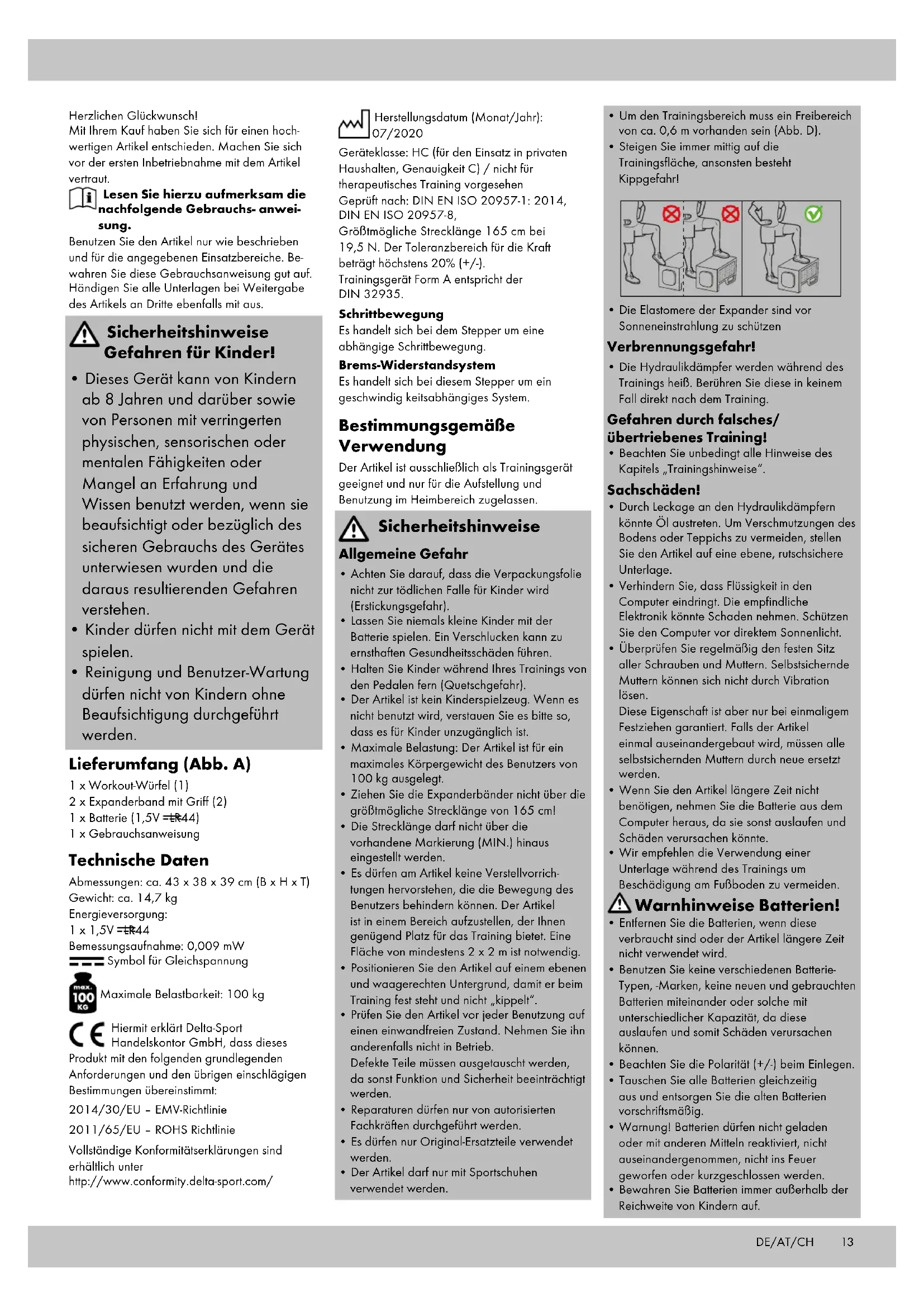 - Reinigung und Benutzer-Wartung dürfen nicht von Kindern ohne Beaufsichtigung durchgeführt werden. Lieferumfang (Abb. A) 1 x Workout-Würfel (1) 2 x Expanderband mit Griff (2) 1 x Batterie (1,5V LR44) 1 x Gebrauchsanweisung Technische Daten Abmessungen: ca. 43 x 38 x 39 cm (B x H x T) Gewicht: ca. 14,7 kg Energieversorgung: 1 x 1,5V LR44 Bemessungsaufnahme: 0,009 mW Symbol für Gleichspannung Maximale Belastbarkeit: 100 kg Hiermit erklärt Delta-Sport Handelskontor GmbH, dass dieses Produkt mit den folgenden grundlegenden Anforderungen und den übrigen einschlägigen Bestimmungen übereinstimmt: 2014/30/EU – EMV-Richtlinie 2011/65/EU – ROHS Richtlinie Vollständige Konformitätserklärungen sind erhältlich unter http://www.conformity.delta-sport.com/ Herstellungsdatum (Monat/Jahr): 07/2020 Geräteklasse: HC (für den Einsatz in privaten Haushalten, Genauigkeit C) / nicht für therapeutisches Training vorgesehen Geprüft nach: DIN EN ISO 20957-1: 2014, DIN EN ISO 20957-8, Größtmögliche Strecklänge 165 cm bei 19,5 N. Der Toleranzbereich für die Kraft beträgt höchstens 20% (+/-). Trainingsgerät Form A entspricht der DIN 32935. Schrittbewegung Es handelt sich bei dem Stepper um eine abhängige Schrittbewegung. Brems-Widerstandsystem Es handelt sich bei diesem Stepper um ein geschwindig keitsabhängiges System. Bestimmungsgemäße Verwendung Der Artikel ist ausschließlich als Trainingsgerät geeignet und nur für die Aufstellung und Benutzung im Heimbereich zugelassen. Sicherheitshinweise Allgemeine Gefahr