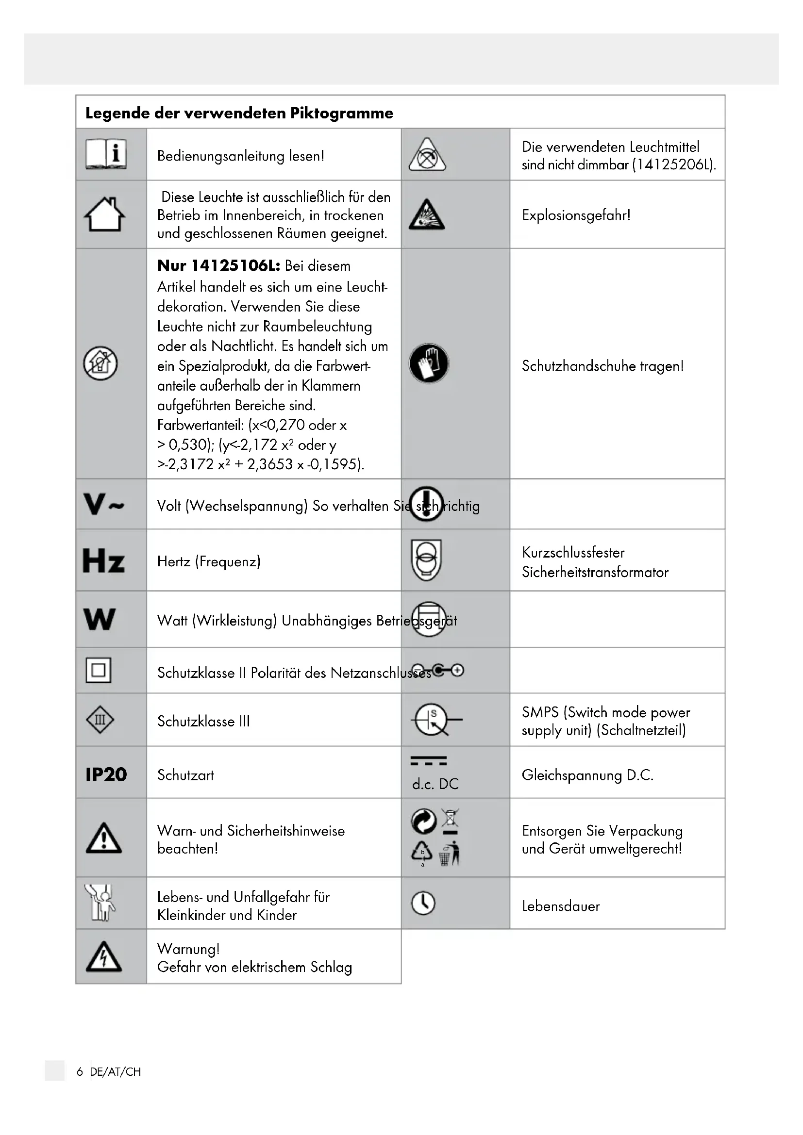 KINDER! Lassen Sie Kinder niemals unbeaufsichtigt mit dem Verpackungsmaterial. Es besteht Erstickungsge- fahr durch Verpackungsmaterial. Kinder unter- schätzen häufig die Gefahren. Halten Sie Kinder stets vom Produkt fern. Dieses Gerät kann von Kindern ab 8 Jahren und darüber sowie von Personen mit verringerten physischen, sensorischen oder mentalen Fähig- keiten oder Mangel an Erfahrung und Wissen benutzt werden, wenn sie beaufsichtigt oder bezüglich des sicheren Gebrauchs des Gerätes unterwiesen wurden und die daraus resultieren- den Gefahren verstehen. Kinder dürfen nicht mit dem Gerät spielen. Reinigung und Benutzer- wartung dürfen nicht von Kindern ohne Beauf- sichtigung durchgeführt werden. Vermeiden Sie Lebensgefahr durch elektrischen Schlag Überprüfen Sie vor jedem Gebrauch das LED- Band auf etwaige Beschädigungen. Benutzen Sie Ihr LED-Band niemals, wenn Sie irgendwelche Beschädigungen feststellen. Eine beschädigte Netzanschlussleitung bedeutet Lebensgefahr durch elektrischen Schlag. Wenden Sie sich bei Beschädigungen, Reparaturen oder anderen Problemen an die Servicestelle oder eine Elektrofachkraft. Die Netzanschlussleitung dieses Gerätes kann nicht ersetzt werden. Bei Beschädigung der Leitung ist das Gerät zu ver- schrotten. Das Gerät enthält keine Teile, welche vom Verbraucher gewartet werden können. Vergewissern Sie sich vor der Benutzung, dass die vorhandene Netzspannung mit der benötigten Betriebsspannung des Artikels übereinstimmt (siehe „Technische Daten“). Vermeiden Sie unbedingt die Berührung der netzspannungsführenden Leitungen und Kon- takte mit Wasser oder anderen Flüssigkeiten. Öffnen Sie niemals eines der elektrischen Betriebs- mittel oder stecken irgendwelche Gegenstände Einleitung / Sicherheit Sicherheit9 DE/AT/CH Einleitung / Sicherheit in dieselben. Derartige Eingriffe bedeuten Lebens- gefahr durch elektrischen Schlag. Benutzen Sie das LED Band nicht, wenn es mit Gegenständen abgedeckt oder in eine Ober- fläche eingelegt ist. Montieren Sie die Leuchte nicht auf feuchten oder leitenden Untergründen. Dieses LED-Band darf mit einem anderen LED- Band nicht elektrisch verbunden werden. Schützen Sie das Produkt vor scharfen Kanten, mechanischen Belastungen und heißen Ober- flächen (siehe Abb. F). Nicht mit scharfen Klammern oder Nägeln befestigen. Ziehen Sie immer den Netzstecker vor der Montage, Demontage oder Reinigung aus der Steckdose. Fassen Sie niemals den Netzstecker oder das LED-Band mit nassen Händen an. Verwenden Sie ausschließlich die mitgelieferten Einzelteile, ansonsten erlöschen alle Gewähr- leistungsansprüche. Dieser Artikel darf nicht mit dem Stromnetz ver- bunden werden, während er in der Verpackung ist, sofern nicht die Verpackung für Ausstellungs- zwecke angepasst wurde. Legen Sie den Artikel vollständig aus, bevor Sie ihn an das Stromnetz anschließen. Modell 14125106L Bei manchen Personen kann es zu epileptischen Anfällen oder Bewusstseinsstörungen kommen, wenn Sie bestimmten Blitzlichtern oder Licht- effekten ausgesetzt werden. Suchen Sie bei epileptischen Symptomen umgehend einen Arzt auf. Vermeiden Sie Brand- und Verletzungsgefahr Dieser Artikel enthält keine Teile, die vom Verbraucher gewartet werden können. Die LEDs können nicht ausgetauscht werden. Sollten die LEDs am Ende ihrer Lebensdauer ausfallen, muss der ganze Artikel ersetzt werden. Die verbauten LEDs sind nicht geeig- net für Dimmer und elektronische Schalter (14125206L). Bei Betrieb nicht aus kurzem Abstand in die LED schauen. Die LED nicht mit einem optischen Instrument (z. B. Lupe) betrachten. So verhalten Sie sich richtig Montieren Sie das LED-Band so, dass es vor Verschmutzung und zu starker Erwärmung ge- schützt ist. Seien Sie stets aufmerksam! Achten Sie immer darauf was Sie tun und gehen Sie stets mit Vernunft vor. Verwenden Sie das LED-Band in keinem Fall, wenn Sie unkonzentriert sind oder sich unwohl fühlen. Machen Sie sich vor der Verwendung mit allen Anweisungen und Abbildungen in dieser Anlei- tung sowie mit dem LED-Band selbst vertraut. Um das LED-Band vollständig von der Strom- versorgung zu trennen, muss der Netzadapter aus der Steckdose gezogen werden. Sicherheitshinweise für Batterien / Akkus BATTERIEN AUSSERHALB