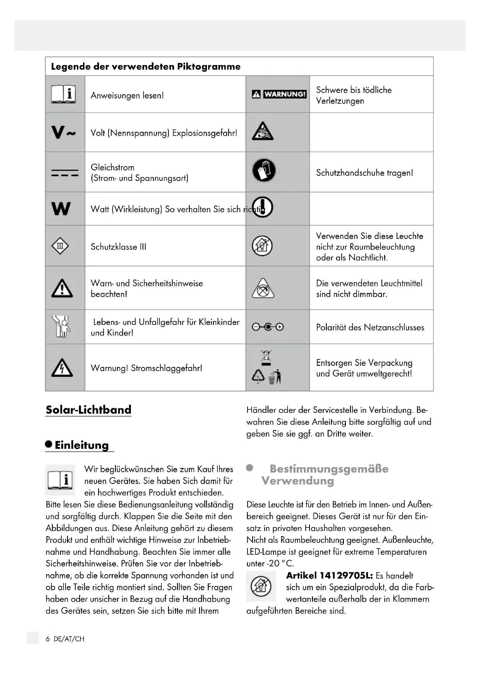 Entsorgen Sie Verpackung und Gerät umweltgerecht! Solar-Lichtband Einleitung Wir beglückwünschen Sie zum Kauf Ihres neuen Gerätes. Sie haben Sich damit für ein hochwertiges Produkt entschieden. Bitte lesen Sie diese Bedienungsanleitung vollständig und sorgfältig durch. Klappen Sie die Seite mit den Abbildungen aus. Diese Anleitung gehört zu diesem Produkt und enthält wichtige Hinweise zur Inbetrieb- nahme und Handhabung. Beachten Sie immer alle Sicherheitshinweise. Prüfen Sie vor der Inbetrieb- nahme, ob die korrekte Spannung vorhanden ist und ob alle Teile richtig montiert sind. Sollten Sie Fragen haben oder unsicher in Bezug auf die Handhabung des Gerätes sein, setzen Sie sich bitte mit Ihrem Händler oder der Servicestelle in Verbindung. Be- wahren Sie diese Anleitung bitte sorgfältig auf und geben Sie sie ggf. an Dritte weiter. Bestimmungsgemäße Verwendung Diese Leuchte ist für den Betrieb im Innen- und Außen- bereich geeignet. Dieses Gerät ist nur für den Ein- satz in privaten Haushalten vorgesehen. Nicht als Raumbeleuchtung geeignet. Außenleuchte, LED-Lampe ist geeignet für extreme Temperaturen unter -20 °C. Artikel 14129705L: Es handelt sich um ein Spezialprodukt, da die Farb- wertanteile außerhalb der in Klammern aufgeführten Bereiche sind.7 DE/AT/CH Farbwertanteil: (x <0,270 oder x >0,530); (y <-2,172 x² oder y >-2,3172 x² + 2,3653 x -0,1595). Lieferumfang Kontrollieren Sie unmittelbar nach dem Auspacken immer den Lieferumfang auf Vollständigkeit sowie den einwandfreien Zustand des Gerätes. 1 Solar-Lichtband, Modell 14129705L und 14129805L mit Dämmerungsssensor 1 Solarpanel 4 Silikonringe 1 Standrohr 1 Erdspieß 1 Klebestreifen 1 Bedienungsanleitung Teilebeschreibung