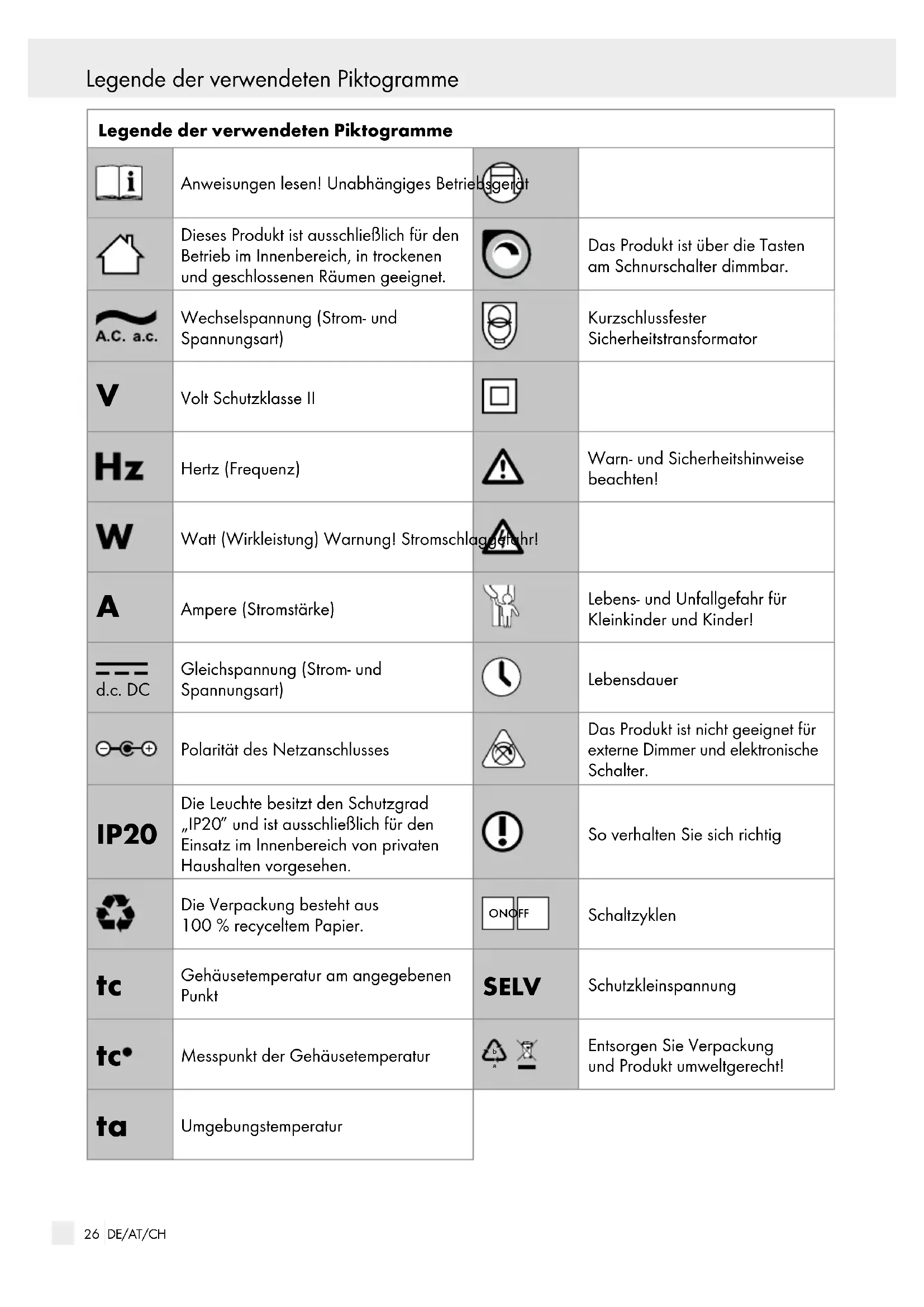 Ampere (Stromstärke) Lebens- und Unfallgefahr für Kleinkinder und Kinder! d.c. DC Gleichspannung (Strom- und Spannungsart) Lebensdauer Polarität des Netzanschlusses Das Produkt ist nicht geeignet für externe Dimmer und elektronische Schalter. IP20 Die Leuchte besitzt den Schutzgrad „IP20″ und ist ausschließlich für den Einsatz im Innenbereich von privaten Haushalten vorgesehen. So verhalten Sie sich richtig Die Verpackung besteht aus 100 % recyceltem Papier. ON OFF Schaltzyklen