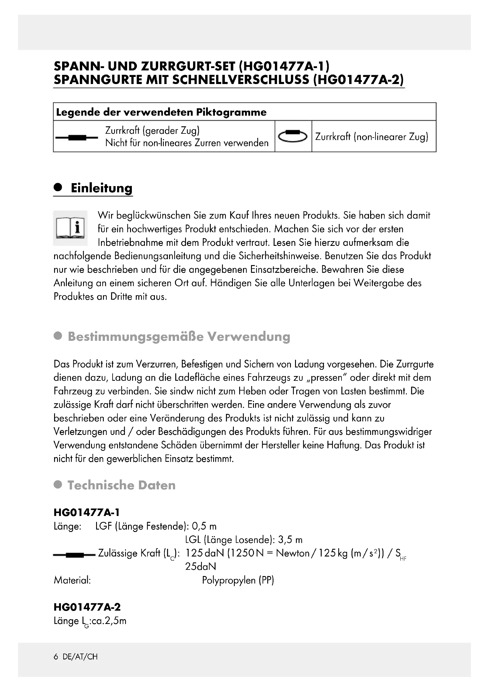 Lieferumfang Kontrollieren Sie unmittelbar nach dem Auspacken den Lieferumfang auf Vollständigkeit sowie den einwandfreien Zustand des Produkts und aller Teile. 2 x Zurrgurt mit Spannratsche und S-Haken, ca. 0,5 m (HG01477A-1) 2 x Zurrgurt mit S-Haken, ca. 3,5 m (HG01477A-1) 2 x Zurrgurte mit Klemmschloss ca. 2,5 m (HG01477A-2) 1 x Bedienungsanleitung