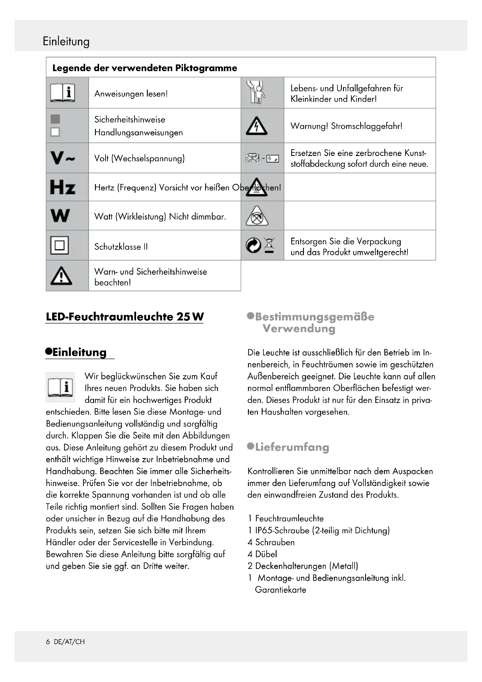 65 DE/AT/CH Legende der verwendeten Piktogramme ........................................................... Seite 6 Einleitung ......................................................................................................................................... Seite 6 Bestimmungsgemäße Verwendung ....................................................................................................Seite 6 Lieferumfang ........................................................................................................................................ Seite 6 Teilebeschreibung ...............................................................................................................................Seite 7 Technische Daten ................................................................................................................................Seite 7 Sicherheit ......................................................................................................................................... Seite 7 Sicherheitshinweise .............................................................................................................................Seite 7 Vorbereitung ................................................................................................................................Seite 8 Benötigtes Werkzeug und Material ...................................................................................................Seite 8 Vor der Installation .................................................................................................................Seite 8 Inbetriebnahme ......................................................................................................................... Seite 8 Leuchte montieren ...............................................................................................................................Seite 8 Leuchte ein- / ausschalten ...................................................................................................................Seite 9 Wartung und Reinigung .....................................................................................................Seite 9 Entsorgung .....................................................................................................................................Seite 9 Konformitätserklärung .......................................................................................................Seite 9 Garantie und Service ............................................................................................................Seite 9 Garantie ..............................................................................................................................................Seite 9 Serviceadresse ....................................................................................................................................Seite 10 Garantiekarte ......................................................................................................................................Seite 10 Inhaltsverzeichnis6 DE/AT/CH Einleitung LED-Feuchtraumleuchte 25 W Einleitung Wir beglückwünschen Sie zum Kauf Ihres neuen Produkts. Sie haben sich damit für ein hochwertiges Produkt entschieden. Bitte lesen Sie diese Montage- und Bedienungsanleitung vollständig und sorgfältig durch. Klappen Sie die Seite mit den Abbildungen aus. Diese Anleitung gehört zu diesem Produkt und enthält wichtige Hinweise zur Inbetriebnahme und Handhabung. Beachten Sie immer alle Sicherheits- hinweise. Prüfen Sie vor der Inbetriebnahme, ob die korrekte Spannung vorhanden ist und ob alle Teile richtig montiert sind. Sollten Sie Fragen haben oder unsicher in Bezug auf die Handhabung des Produkts sein, setzen Sie sich bitte mit Ihrem Händler oder der Servicestelle in Verbindung. Bewahren Sie diese Anleitung bitte sorgfältig auf und geben Sie sie ggf. an Dritte weiter. Bestimmungsgemäße Verwendung Die Leuchte ist ausschließlich für den Betrieb im In- nenbereich, in Feuchträumen sowie im geschützten Außenbereich geeignet. Die Leuchte kann auf allen normal entflammbaren Oberflächen befestigt wer- den. Dieses Produkt ist nur für den Einsatz in priva- ten Haushalten vorgesehen. Lieferumfang Kontrollieren Sie unmittelbar nach dem Auspacken immer den Lieferumfang auf Vollständigkeit sowie den einwandfreien Zustand des Produkts. 1 Feuchtraumleuchte 1 IP65-Schraube (2-teilig mit Dichtung) 4 Schrauben 4 Dübel 2 Deckenhalterungen (Metall) 1 Montage- und Bedienungsanleitung inkl. Garantiekarte Legende der verwendeten Piktogramme Anweisungen lesen! Lebens- und Unfallgefahren für Kleinkinder und Kinder! Sicherheitshinweise Handlungsanweisungen Warnung! Stromschlaggefahr! Volt (Wechselspannung) Ersetzen Sie eine zerbrochene Kunst- stoffabdeckung sofort durch eine neue. Hertz (Frequenz) Vorsicht vor heißen Oberflächen! Watt (Wirkleistung) Nicht dimmbar. Schutzklasse II Entsorgen Sie die Verpackung und das Produkt umweltgerecht! Warn- und Sicherheitshinweise beachten! Einleitung / Sicherheit7 DE/AT/CH Einleitung Teilebeschreibung