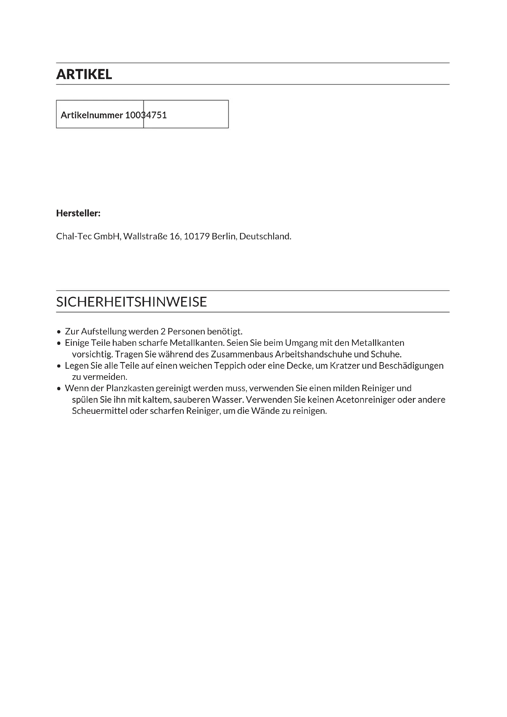 - Wenn der Planzkasten gereinigt werden muss, verwenden Sie einen milden Reiniger und spülen Sie ihn mit kaltem, sauberen Wasser. Verwenden Sie keinen Acetonreiniger oder andere Scheuermittel oder scharfen Reiniger, um die Wände zu reinigen. Hersteller: Chal-Tec GmbH, Wallstraße 16, 10179 Berlin, Deutschland.ZUSAMMENBAU Benötigtes Werkzeug