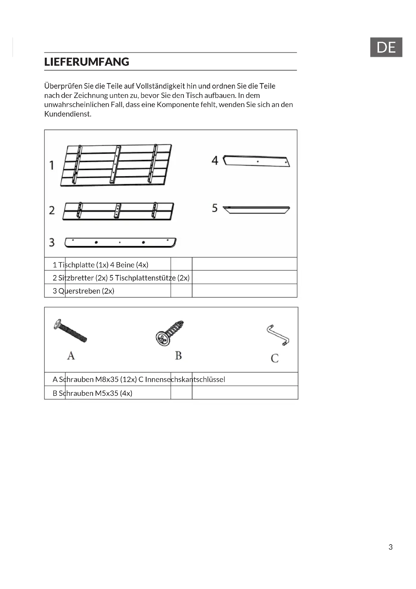 LIEFERUMFANG Überprüfen Sie die Teile auf Vollständigkeit hin und ordnen Sie die Teile nach der Zeichnung unten zu, bevor Sie den Tisch aufbauen. In dem unwahrscheinlichen Fall, dass eine Komponente fehlt, wenden Sie sich an den Kundendienst. 1 Tischplatte (1x) 4 Beine (4x) 2 Sitzbretter (2x) 5 Tischplattenstütze (2x) 3 Querstreben (2x) A Schrauben M8x35 (12x) C Innensechskantschlüssel B Schrauben M5x35 (4x)4
