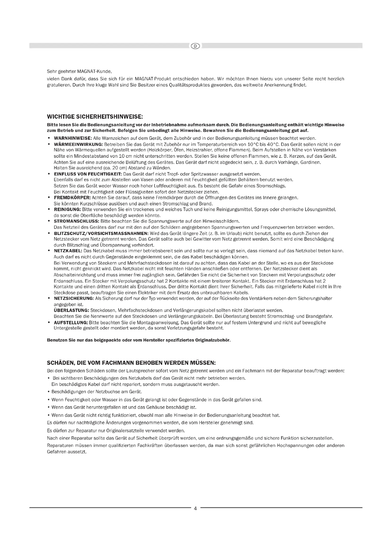 Sehr geehrter MAGNAT-Kunde, vielen Dank dafür, dass Sie sich für ein MAGNAT-Produkt entschieden haben. Wir möchten Ihnen hierzu von unserer Seite recht herzlich gratulieren. Durch Ihre kluge Wahl sind Sie Besitzer eines Qualitätsproduktes geworden, das weltweite Anerkennung ndet. WICHTIGE SICHERHEITSHINWEISE: Bitte lesen Sie die Bedienungsanleitung vor der Inbetriebnahme aufmerksam durch. Die Bedienungsanleitung enthält wichtige Hinweise zum Betrieb und zur Sicherheit. Befolgen Sie unbedingt alle Hinweise. Bewahren Sie die Bedienungsanleitung gut auf.
