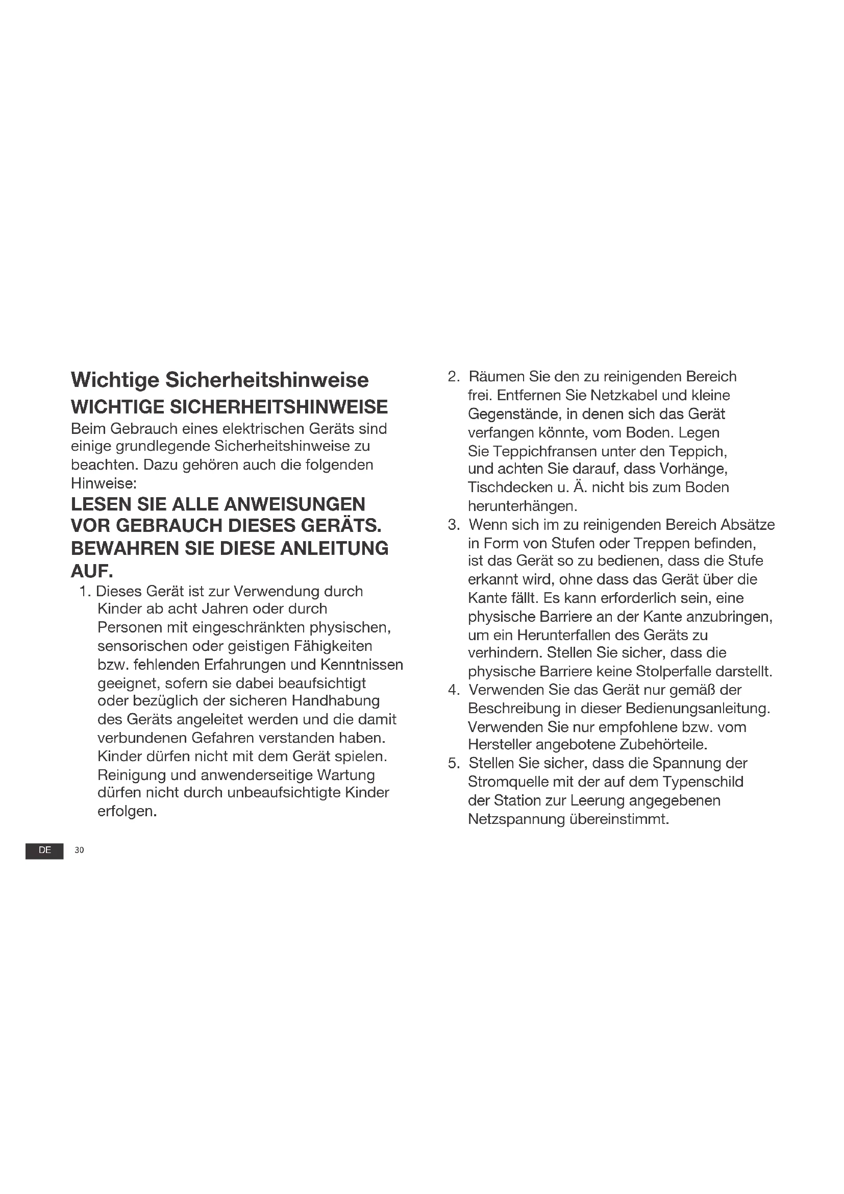 frei. Entfernen Sie Netzkabel und kleine Gegenstände, in denen sich das Gerät verfangen könnte, vom Boden. Legen Sie Teppichfransen unter den Teppich, und achten Sie darauf, dass Vorhänge, Tischdecken u.Ä. nicht bis zum Boden herunterhängen.