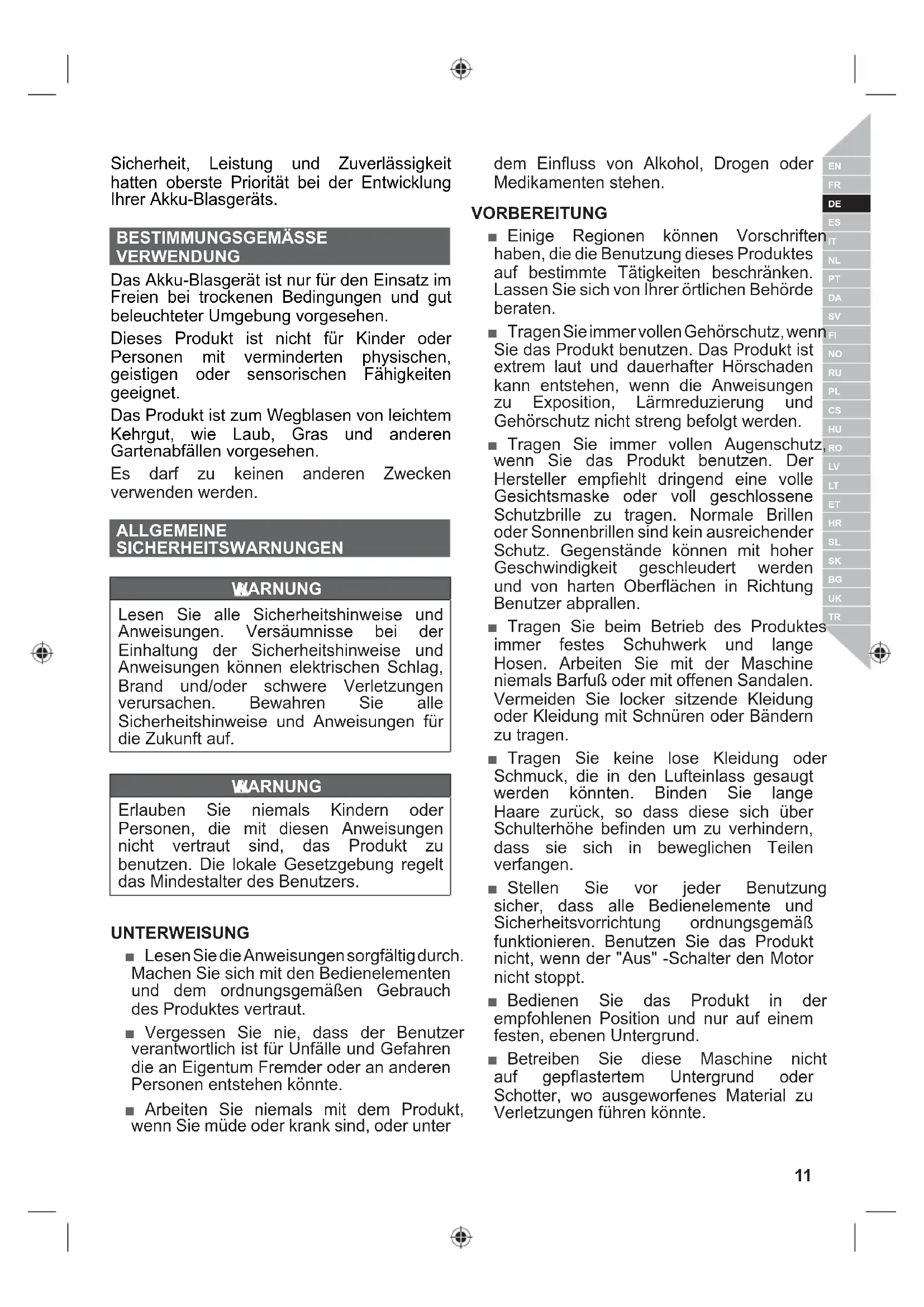 Sicherheit, Leistung und Zuverlässigkeit hatten oberste Priorität bei der Entwicklung Ihrer Akku-Blasgeräts. BESTIMMUNGSGEMÄSSE VERWENDUNG Das Akku-Blasgerät ist nur für den Einsatz im Freien bei trockenen Bedingungen und gut beleuchteter Umgebung vorgesehen. Dieses Produkt ist nicht für Kinder oder Personen mit verminderten physischen, geistigen oder sensorischen Fähigkeiten geeignet. Das Produkt ist zum Wegblasen von leichtem Kehrgut, wie Laub, Gras und anderen Gartenabfällen vorgesehen. Es darf zu keinen anderen Zwecken verwenden werden. ALLGEMEINE SICHERHEITSWARNUNGEN WARNUNG Lesen Sie alle Sicherheitshinweise und Anweisungen. Versäumnisse bei der Einhaltung der Sicherheitshinweise und Anweisungen können elektrischen Schlag, Brand und/oder schwere Verletzungen verursachen. Bewahren Sie alle Sicherheitshinweise und Anweisungen für die Zukunft auf. WARNUNG Erlauben Sie niemals Kindern oder Personen, die mit diesen Anweisungen nicht vertraut sind, das Produkt zu benutzen. Die lokale Gesetzgebung regelt das Mindestalter des Benutzers. UNTERWEISUNG ■ Lesen Sie die Anweisungen sorgfältig durch. Machen Sie sich mit den Bedienelementen und dem ordnungsgemäßen Gebrauch des Produktes vertraut. ■ Vergessen Sie nie, dass der Benutzer verantwortlich ist für Unfälle und Gefahren die an Eigentum Fremder oder an anderen Personen entstehen könnte. ■ Arbeiten Sie niemals mit dem Produkt, wenn Sie müde oder krank sind, oder unter dem Einfluss von Alkohol, Drogen oder Medikamenten stehen. VORBEREITUNG ■ Einige Regionen können Vorschriften haben, die die Benutzung dieses Produktes auf bestimmte Tätigkeiten beschränken. Lassen Sie sich von Ihrer örtlichen Behörde beraten. ■ Tragen Sie immer vollen Gehörschutz, wenn Sie das Produkt benutzen. Das Produkt ist extrem laut und dauerhafter Hörschaden kann entstehen, wenn die Anweisungen zu Exposition, Lärmreduzierung und Gehörschutz nicht streng befolgt werden. ■ Tragen Sie immer vollen Augenschutz, wenn Sie das Produkt benutzen. Der Hersteller empfiehlt dringend eine volle Gesichtsmaske oder voll geschlossene Schutzbrille zu tragen. Normale Brillen oder Sonnenbrillen sind kein ausreichender Schutz. Gegenstände können mit hoher Geschwindigkeit geschleudert werden und von harten Oberflächen in Richtung Benutzer abprallen. ■ Tragen Sie beim Betrieb des Produktes immer festes Schuhwerk und lange Hosen. Arbeiten Sie mit der Maschine niemals Barfuß oder mit offenen Sandalen. Vermeiden Sie locker sitzende Kleidung oder Kleidung mit Schnüren oder Bändern zu tragen. ■ Tragen Sie keine lose Kleidung oder Schmuck, die in den Lufteinlass gesaugt werden könnten. Binden Sie lange Haare zurück, so dass diese sich über Schulterhöhe befinden um zu verhindern, dass sie sich in beweglichen Teilen verfangen. ■ Stellen Sie vor jeder Benutzung sicher, dass alle Bedienelemente und Sicherheitsvorrichtung ordnungsgemäß funktionieren. Benutzen Sie das Produkt nicht, wenn der "Aus" -Schalter den Motor nicht stoppt. ■ Bedienen Sie das Produkt in der empfohlenen Position und nur auf einem festen, ebenen Untergrund. ■ Betreiben Sie diese Maschine nicht auf gepflastertem Untergrund oder Schotter, wo ausgeworfenes Material zu Verletzungen führen könnte.12 | Deutsch