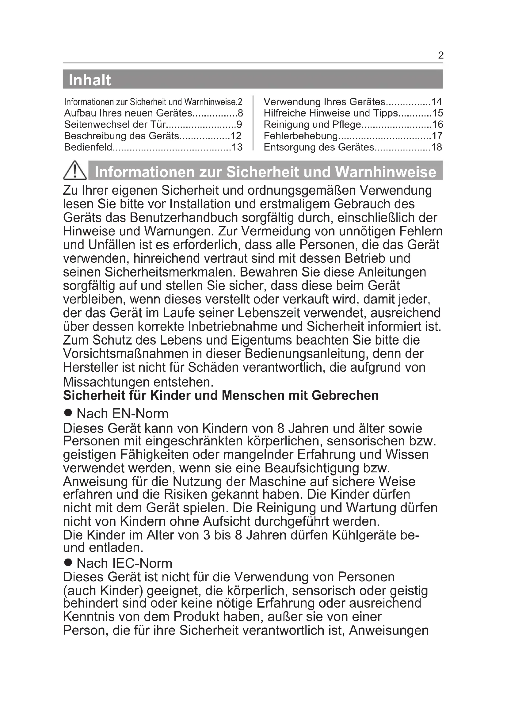 - Entsorgung des Gerätes Informationen zur Sicherheit und Warnhinweise Nach EN-Norm Dieses Gerät kann von Kindern von 8 Jahren und älter sowie Personen mit eingeschränkten körperlichen, sensorischen bzw. geistigen Fähigkeiten oder mangelnder Erfahrung und Wissen verwendet werden, wenn sie eine Beaufsichtigung bzw. Anweisung für die Nutzung der Maschine auf sichere Weise erfahren und die Risiken gekannt haben. Die Kinder dürfen nicht mit dem Gerät spielen. Die Reinigung und Wartung dürfen nicht von Kindern ohne Aufsicht durchgeführt werden. Die Kinder im Alter von 3 bis 8 Jahren dürfen Kühlgeräte be- und entladen. Nach IEC-Norm Dieses Gerät ist nicht für die Verwendung von Personen (auch Kinder) geeignet, die körperlich, sensorisch oder geistig behindert sind oder keine nötige Erfahrung oder ausreichend Kenntnis von dem Produkt haben, außer sie von einer Person, die für ihre Sicherheit verantwortlich ist, Anweisungen Zu Ihrer eigenen Sicherheit und ordnungsgemäßen Verwendung lesen Sie bitte vor Installation und erstmaligem Gebrauch des Geräts das Benutzerhandbuch sorgfältig durch, einschließlich der Hinweise und Warnungen. Zur Vermeidung von unnötigen Fehlern und Unfällen ist es erforderlich, dass alle Personen, die das Gerät verwenden, hinreichend vertraut sind mit dessen Betrieb und seinen Sicherheitsmerkmalen. Bewahren Sie diese Anleitungen sorgfältig auf und stellen Sie sicher, dass diese beim Gerät verbleiben, wenn dieses verstellt oder verkauft wird, damit jeder, der das Gerät im Laufe seiner Lebenszeit verwendet, ausreichend über dessen korrekte Inbetriebnahme und Sicherheit informiert ist. Zum Schutz des Lebens und Eigentums beachten Sie bitte die Vorsichtsmaßnahmen in dieser Bedienungsanleitung, denn der Hersteller ist nicht für Schäden verantwortlich, die aufgrund von Missachtungen entstehen. Sicherheit für Kinder und Menschen mit Gebrechen p. 18