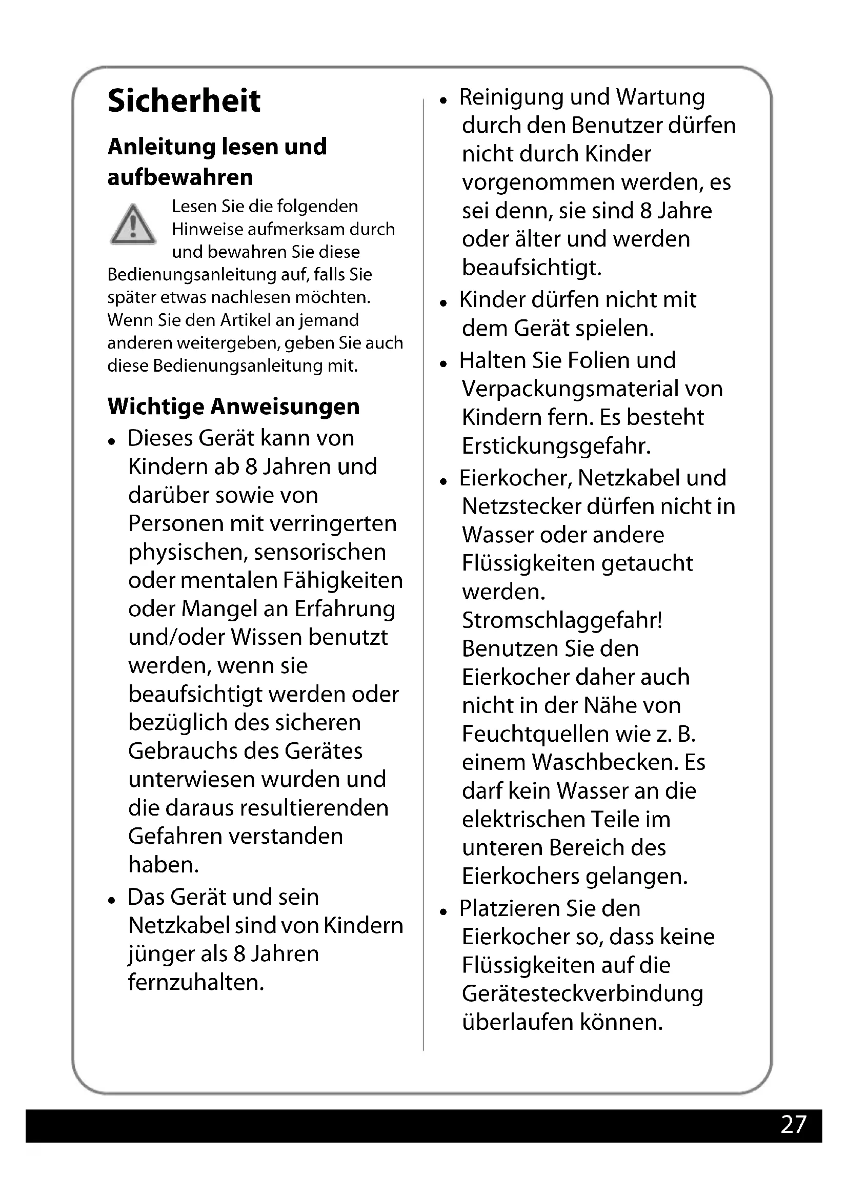 - Entsorgen Lieferumfang Eierkocher Messbecher Pochierschalen (2x) Bedienungsanleitung Garantie-Urkunde Druckbuch Eierkocher BEL.book Seite 26 Dienstag, 6. Oktober 2020 3:32 1527 Sicherheit Anleitung lesen und aufbewahren Lesen Sie die folgenden Hinweise aufmerksam durch und bewahren Sie diese Bedienungsanleitung auf, falls Sie später etwas nachlesen möchten. Wenn Sie den Artikel an jemand anderen weitergeben, geben Sie auch diese Bedienungsanleitung mit. Wichtige Anweisungen Dieses Gerät kann von Kindern ab 8 Jahren und darüber sowie von Personen mit verringerten physischen, sensorischen oder mentalen Fähigkeiten oder Mangel an Erfahrung und/oder Wissen benutzt werden, wenn sie beaufsichtigt werden oder bezüglich des sicheren Gebrauchs des Gerätes unterwiesen wurden und die daraus resultierenden Gefahren verstanden haben. Das Gerät und sein Netzkabel sind von Kindern jünger als 8 Jahren fernzuhalten. Reinigung und Wartung durch den Benutzer dürfen nicht durch Kinder vorgenommen werden, es sei denn, sie sind 8 Jahre oder älter und werden beaufsichtigt. Kinder dürfen nicht mit dem Gerät spielen. Halten Sie Folien und Verpackungsmaterial von Kindern fern. Es besteht Erstickungsgefahr. Eierkocher, Netzkabel und Netzstecker dürfen nicht in Wasser oder andere Flüssigkeiten getaucht werden. Stromschlaggefahr! Benutzen Sie den Eierkocher daher auch nicht in der Nähe von Feuchtquellen wie z. B. einem Waschbecken. Es darf kein Wasser an die elektrischen Teile im unteren Bereich des Eierkochers gelangen. Platzieren Sie den Eierkocher so, dass keine Flüssigkeiten auf die Gerätesteckverbindung überlaufen können. Druckbuch Eierkocher BEL.book Seite 27 Dienstag, 6. Oktober 2020 3:32 1528 Wenn das Netzkabel dieses Gerätes beschädigt wird, muss es durch den Hersteller oder seinen Kundendienst oder Kundenservice ersetzt werden, um Gefährdungen zu vermeiden. Das Gerät darf nicht an eine Zeitschaltuhr, einen Dämmerungsschalter oder an ein sonstiges Fernwirksystem angeschlossen werden. Bedienen Sie das Gerät nur so, wie in dieser Anleitung beschrieben. Ansonsten besteht Verletzungsgefahr! Bestimmungsgemäßer Gebrauch Dieser Eierkocher dient ausschließlich zum Zubereiten von Hühnereiern. Das Gerät ist für die Verwendung im Privathaushalt und die dort üblicherweise anfallenden Mengen konzipiert. Für eine gewerbliche oder haushaltsähnliche Benutzung in Küchen für Mitarbeiter in Läden, Büros und anderen gewerblichen Bereichen, in landwirtschaftlichen Anwesen, durch Kunden in Hotels, Motels oder anderen Wohneinrichtungen oder in Frühstückspensionen ist der Eierkocher ungeeignet. Bei fehlerhaftem Umgang mit dem Gerät kann es zu schweren Verbrennungen und Verbrühungen kommen. Gefahr durch Elektrizität Bedienen Sie das Gerät nicht mit nassen Händen. Betreiben Sie das Gerät nicht im Freien. Schließen Sie das Gerät an eine ordnungsgemäß installierte Steckdose mit Schutzkontakten an, deren Spannung den „Technischen Daten“ entspricht. Achten Sie darauf, dass die Steckdose gut zugänglich ist, damit Sie im Bedarfsfall schnell den Netzstecker ziehen können. Schalten Sie den Eierkocher immer aus, bevor Sie Wasser einfüllen. Betreiben Sie den Eierkocher nicht unbeaufsichtigt. Benutzen Sie das Gerät nicht: – wenn der Eierkocher oder Teile beschädigt sind, – wenn das Netzkabel oder der Neztstecker beschädigt sind, Druckbuch Eierkocher BEL.book Seite 28 Dienstag, 6. Oktober 2020 3:32 1529 – wenn der Eierkocher heruntergefallen ist. Wickeln Sie das Netzkabel vor jedem Gebrauch vollständig ab. Achten Sie darauf, dass das Netzkabel nicht durch scharfe Kanten oder heiße Gegenstände beschädigt wird. Ziehen Sie den Stecker aus der Steckdose: – wenn Sie den Eierkocher nicht benutzen, –nach jedem Gebrauch, – bevor Sie das Gerät reinigen oder wegstellen, – wenn während des Betriebs offensichtlich eine Störung auftritt, – bei Gewitter. – Ziehen Sie dabei immer am Netzstecker, nicht am Kabel. Nehmen Sie keine Veränderungen an dem Gerät oder am Netzkabel vor. Lassen Sie Reparaturen nur von einer Fachwerkstatt durchführen, da nicht fachgerecht reparierte Geräte den Benutzer gefährden. Beachten Sie auch die beiliegenden Garantiebedingungen. Verwenden Sie kein Verlängerungskabel. Gefahr von Verbrennungen/ Verbrühungen und Brand Aus der Dampfaustrittsöffnung des Deckels tritt während des Gebrauchs heißer Dampf aus. Meiden Sie den Kontakt mit dem heißen Dampf. Verbrühungsgefahr! Berühren Sie die heißen Teile des Eierkochers während des Betriebes nicht mit bloßen Händen. Benutzen Sie stets wärmeisolierte Kochhandschuhe oder Topflappen zum Anfassen des Eierkochers sowie der Zubehörteile. Weisen Sie auch andere Benutzer auf die Gefahren hin. Beachten Sie, dass aus dem Eierkocher auch nach dem Abschalten heißer Dampf entweichen kann bzw. dass einzelne Teile noch heiß sein können. Lassen Sie den Eierkocher immer vollständig abkühlen, bevor Sie ihn reinigen oder wegstellen. Achten Sie nach dem Ertönen des Signals auf heißen Dampf, wenn Sie den Deckel abnehmen und den Eierträger entnehmen. Tragen Sie möglichst Küchenhandschuhe o. ä. Warnung - Verletzungsgefahr Seien Sie vorsichtig, wenn Sie Eier anstechen oder den Messbecher reinigen. Der Ei-Anstecher ist sehr spitz. Hinweis - Sachschäden Füllen Sie beim Gebrauch Wasser in die Heizschale, aber niemals Flüssigkeit in den Eierkocher. Stellen Sie das Gerät auf einen stabilen, ebenen Untergrund. Achten Sie dabei auf einen ausreichend großen Abstand zu starken Wärmequellen wie Herdplatten, Heizungsrohren u. ä. Das Netzkabel muss sicher in der Kabelaussparung des Sockels liegen, damit der Sockel sicher steht. Druckbuch Eierkocher BEL.book Seite 29 Dienstag, 6. Oktober 2020 3:32 1530 Stellen Sie das Gerät so auf, dass der beim Gebrauch auftretende heiße Wasserdampf gut abziehen kann. Stellen Sie den Eierkocher nicht unter einen Hängeschrank oder ein Regal. Halten Sie auch Abstand zu l