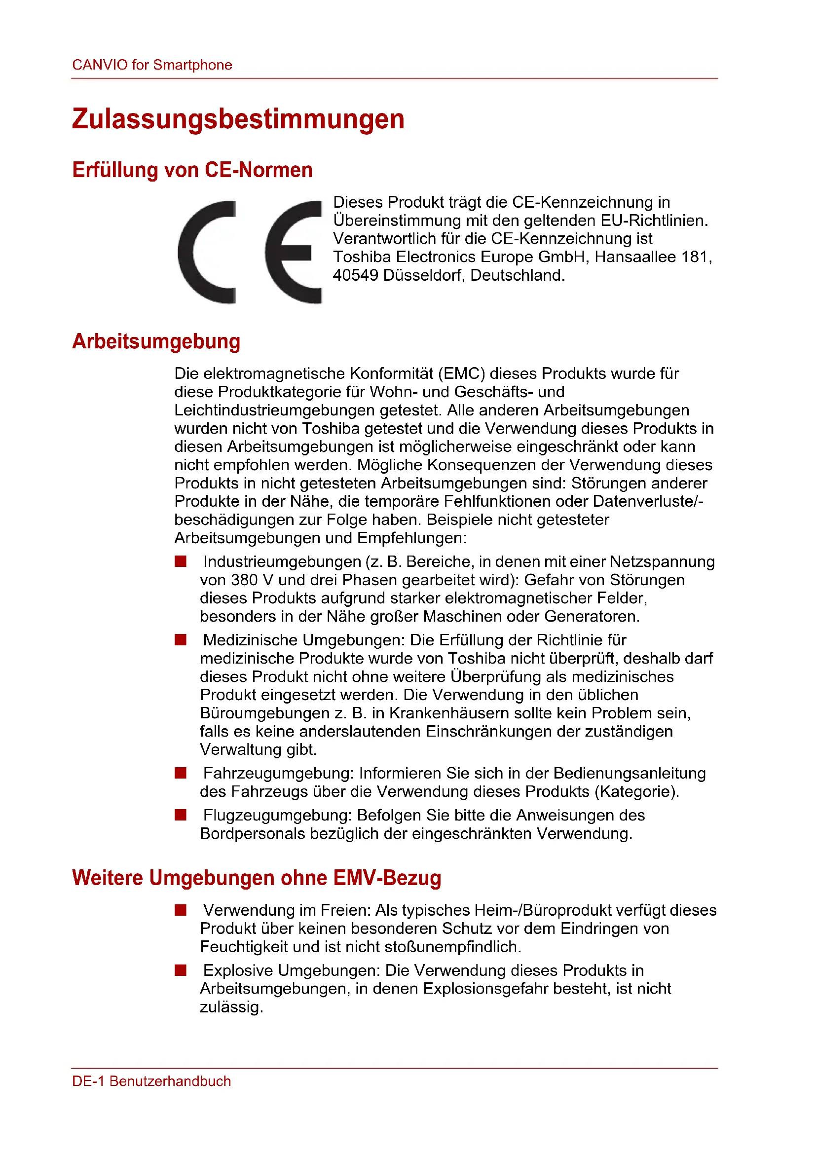 je registrovaná obchodní známka společnosti Microsoft Corporation ve Spojených státech a/nebo v dalších zemích. USB Type-C™ je obchodní známka fóra USB Implementers Forum. Ostatní obchodní známky zmíněné nebo uvedené v tomto dokumentu jsou vlastnictvím svých příslušných vlastníků. Chyby a opomenutí jsou vyhrazeny.DE-1 Benutzerhandbuch CANVIO for Smartphone Benutzerhandbuch Zulassungsbestimmungen Erfüllung von CE-Normen Dieses Produkt trägt die CE-Kennzeichnung in Übereinstimmung mit den geltenden EU-Richtlinien. Verantwortlich für die CE-Kennzeichnung ist Toshiba Electronics Europe GmbH, Hansaallee 181, 40549 Düsseldorf, Deutschland. Arbeitsumgebung Die elektromagnetische Konformität (EMC) dieses Produkts wurde für diese Produktkategorie für Wohn- und Geschäfts- und Leichtindustrieumgebungen getestet. Alle anderen Arbeitsumgebungen wurden nicht von Toshiba getestet und die Verwendung dieses Produkts in diesen Arbeitsumgebungen ist möglicherweise eingeschränkt oder kann nicht empfohlen werden. Mögliche Konsequenzen der Verwendung dieses Produkts in nicht getesteten Arbeitsumgebungen sind: Störungen anderer Produkte in der Nähe, die temporäre Fehlfunktionen oder Datenverluste/- beschädigungen zur Folge haben. Beispiele nicht getesteter Arbeitsumgebungen und Empfehlungen: ■ Industrieumgebungen (z. B. Bereiche, in denen mit einer Netzspannung von 380 V und drei Phasen gearbeitet wird): Gefahr von Störungen dieses Produkts aufgrund starker elektromagnetischer Felder, besonders in der Nähe großer Maschinen oder Generatoren. ■ Medizinische Umgebungen: Die Erfüllung der Richtlinie für medizinische Produkte wurde von Toshiba nicht überprüft, deshalb darf dieses Produkt nicht ohne weitere Überprüfung als medizinisches Produkt eingesetzt werden. Die Verwendung in den üblichen Büroumgebungen z. B. in Krankenhäusern sollte kein Problem sein, falls es keine anderslautenden Einschränkungen der zuständigen Verwaltung gibt. ■ Fahrzeugumgebung: Informieren Sie sich in der Bedienungsanleitung des Fahrzeugs über die Verwendung dieses Produkts (Kategorie). ■ Flugzeugumgebung: Befolgen Sie bitte die Anweisungen des Bordpersonals bezüglich der eingeschränkten Verwendung. Weitere Umgebungen ohne EMV-Bezug ■ Verwendung im Freien: Als typisches Heim-/Büroprodukt verfügt dieses Produkt über keinen besonderen Schutz vor dem Eindringen von Feuchtigkeit und ist nicht stoßunempfindlich. ■ Explosive Umgebungen: Die Verwendung dieses Produkts in Arbeitsumgebungen, in denen Explosionsgefahr besteht, ist nicht zulässig.Benutzerhandbuch DE-2 CANVIO for Smartphone Die folgenden Informationen gelten nur für die Mitgliedstaaten der EU: REACH - Konformitätserklärung Am 1. Juni 2007 trat die neue Chemikalienverordnung der Europäischen Union (EU), REACH, in Kraft. REACH steht für Registration, Evaluation, Authorization and Restriction of Chemicals (Registrierung, Bewertung, Zulassung und Beschränkung von Chemikalien). Toshiba erfüllt alle REACH-Anforderungen und ist verpflichtet, den Kunden gemäß REACH-Verordnung über die chemischen Substanzen in Toshiba- Produkten zu informieren. Entsorgung von Produkten Dieses Symbol zeigt an, dass dieses Produkt nicht als normaler Hausmüll behandelt werden darf. Indem Sie dafür sorgen, dass dieses Produkt korrekt entsorgt wird, tragen Sie dazu bei, negative Folgen für die Umwelt und Gesundheitsrisiken zu vermeiden, welche durch die falsche Entsorgung des Produkts verursacht werden könnten. Wenn Sie ausführliche Informationen zum Recycling dieses Produkts wünschen, wenden Sie sich bitte an die örtlichen zuständigen Behörden oder den Händler, bei dem Sie dieses Produkt erworben haben.DE-3 Benutzerhandbuch CANVIO for Smartphone Sicherheitssymbole Dieses Handbuch enthält Sicherheitshinweise, die befolgt werden müssen, um potenzielle Risiken zu vermeiden, die zu Verletzungen, Sachschäden oder Datenverlust führen können. Die Sicherheitshinweise wurden nach Schweregrad des Risikos unterteilt und entsprechend mit Symbolen gekennzeichnet: Andere verwendete Symbole Zusätzliche Symbole weisen auf hilfreiche oder erklärende Informationen hin: Signalwort Bedeutung Weist auf eine drohende gefährliche Situation hin, die zum Tod oder zu schweren Verletzungen führen kann. Weist auf eine möglicherweise gefährliche Situation hin, die zum Tod oder zu schweren Verletzungen führen kann. Weist auf eine möglicherweise gefährliche Situation hin, die zu leichteren oder mittelschweren Verletzungen führen kann, wenn sie nicht vermieden wird. Weist auf Vorgehensweisen hin, die Sachschäden und andere Probleme verursachen können, aber keine Personenschäden. Gibt wichtige Informationen an *Schwere Verletzungen umfassen Blindheit, Wunden, Verbrennungen (niedrige und hohe Temperatur), elektrische Schläge, Knochenbrüche, Vergiftungen usw., die lang andauernde Auswirkungen haben oder einen Krankenhausaufenthalt und/oder längere Behandlung erfordern. *Leichte oder mittelschwere Verletzungen umfassen Wunden, Verbrennungen, elektrische Schläge usw., die keinen Krankenhausaufenthalt und/oder längere Behandlung erfordern. *Sachschäden sind Beschädigungen des Geräts. GEFAHR WARNUNG VORSICHT HINWEIS INFORMATION TECHNISCHER HINWEIS: Dieses Symbol weist auf technische Informationen über das Gerät hin. TIPP: Dieses Symbol weist auf nützliche Tipps und Hinweise hin. DEFINITION: Dieses Symbol weist auf die Definition eines im Text verwendeten Begriffs hin.Benutzerhandbuch DE-4 CANVIO for Smartphone Inhaltsverzeichnis Einführung ............................................................................................ DE-5 Überblick......................................................................................... DE-5 Merkmale ........................................................................................ DE-5 Kapitel 1 1-1 Lieferumfang überprüfen .............................................