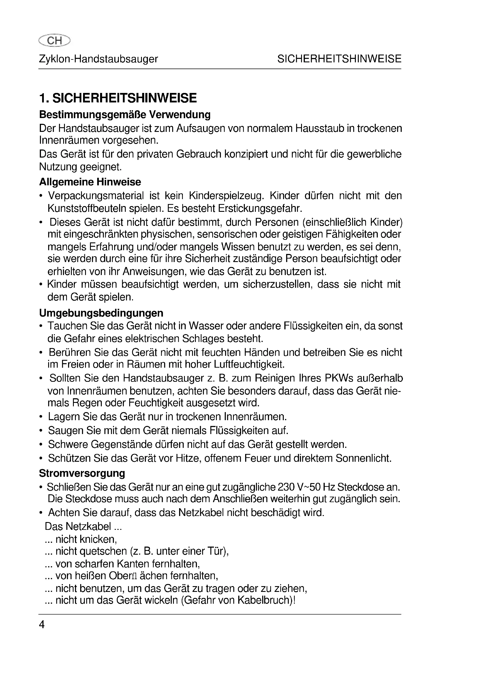 Bestimmungsgemäße Verwendung Der Handstaubsauger ist zum Aufsaugen von normalem Hausstaub in trockenen Innenräumen vorgesehen. Das Gerät ist für den privaten Gebrauch konzipiert und nicht für die gewerbliche Nutzung geeignet. Allgemeine Hinweise