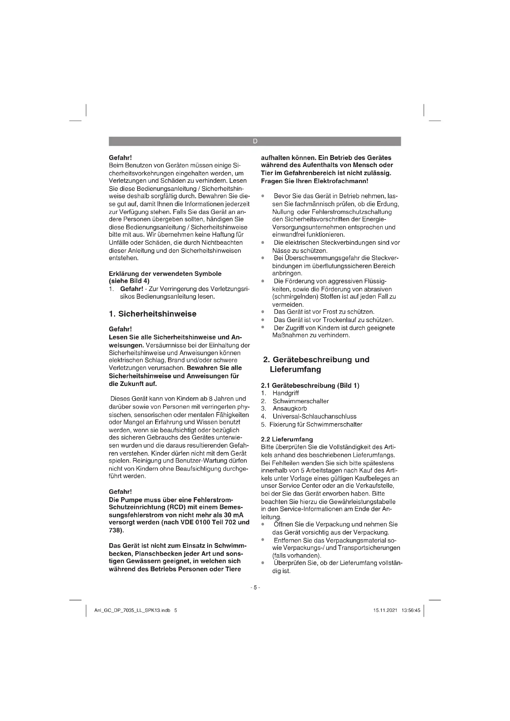 Gefahr! Lesen Sie alle Sicherheitshinweise und An- weisungen. Versäumnisse bei der Einhaltung der Sicherheitshinweise und Anweisungen können elektrischen Schlag, Brand und/oder schwere Verletzungen verursachen. Bewahren Sie alle Sicherheitshinweise und Anweisungen für die Zukunft auf. Dieses Gerät kann von Kindern ab 8 Jahren und darüber sowie von Personen mit verringerten phy- sischen, sensorischen oder mentalen Fähigkeiten oder Mangel an Erfahrung und Wissen benutzt werden, wenn sie beaufsichtigt oder bezüglich des sicheren Gebrauchs des Gerätes unterwie- sen wurden und die daraus resultierenden Gefah- ren verstehen. Kinder dürfen nicht mit dem Gerät spielen. Reinigung und Benutzer-Wartung dürfen nicht von Kindern ohne Beaufsichtigung durchge- führt werden. Gefahr! Die Pumpe muss über eine Fehlerstrom- Schutzeinrichtung (RCD) mit einem Bemes- sungsfehlerstrom von nicht mehr als 30 mA versorgt werden (nach VDE 0100 Teil 702 und 738). Das Gerät ist nicht zum Einsatz in Schwimm- becken, Planschbecken jeder Art und sons- tigen Gewässern geeignet, in welchen sich während des Betriebs Personen oder Tiere aufhalten können. Ein Betrieb des Gerätes während des Aufenthalts von Mensch oder Tier im Gefahrenbereich ist nicht zulässig. Fragen Sie Ihren Elektrofachmann!