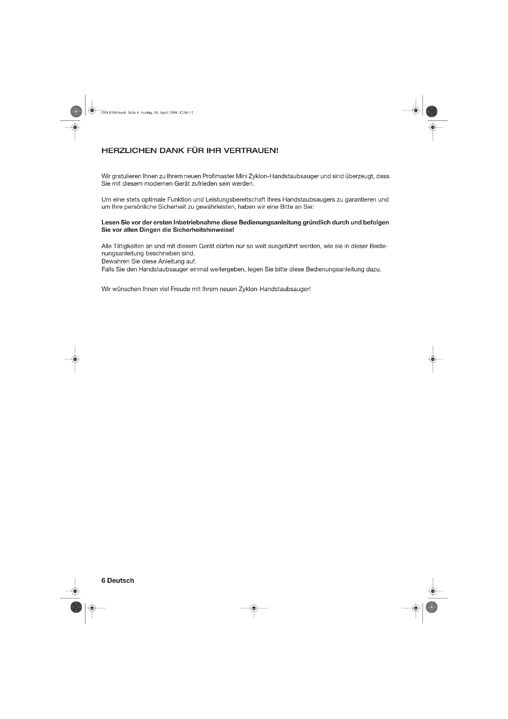 - 13. GARANTIEKARTE ZHS 8100.book Seite 5 Freitag, 18. April 2008 12:06 126 Deutsch HERZLICHEN DANK FÜR IHR VERTRAUEN! Wir gratulieren Ihnen zu Ihrem neuen Profimaster Mini Zyklon-Handstaubsauger und sind überzeugt, dass Sie mit diesem modernen Gerät zufrieden sein werden. Um eine stets optimale Funktion und Leistungsbereitschaft Ihres Handstaubsaugers zu garantieren und um Ihre persönliche Sicherheit zu gewährleisten, haben wir eine Bitte an Sie: Lesen Sie vor der ersten Inbetriebnahme diese Bedienungsanleitung gründlich durch und befolgen Sie vor allen Dingen die Sicherheitshinweise! Alle Tätigkeiten an und mit diesem Gerät dürfen nur so weit ausgeführt werden, wie sie in dieser Bedie- nungsanleitung beschrieben sind. Bewahren Sie diese Anleitung auf. Falls Sie den Handstaubsauger einmal weitergeben, legen Sie bitte diese Bedienungsanleitung dazu. Wir wünschen Ihnen viel Freude mit Ihrem neuen Zyklon-Handstaubsauger! ZHS 8100.book Seite 6 Freitag, 18. April 2008 12:06 12Deutsch 7 p. 17