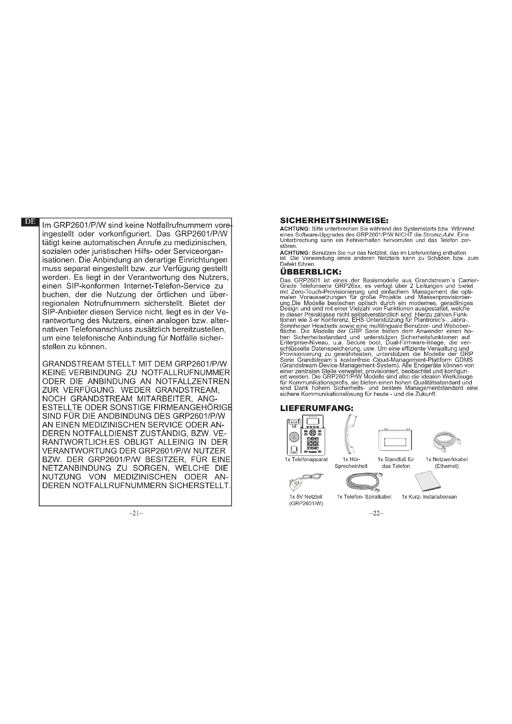 GRANDSTREAM STELLT MIT DEM GRP2601/P/W KEINE VERBINDUNG ZU NOTFALLRUFNUMMER ODER DIE ANBINDUNG AN NOTFALLZENTREN ZUR VERFUGUNG. WEDER GRANDSTREAM, NOCH GRANDSTREAM MITARBEITER, ANGE-STELLTE ODER SONSTIGE FIRMEANGEHORIGE SIND FÜR DIE ANDBINDUNG DES GRP2601/P/W AN EINEN MEDizinISCHEN SERVICE ODER ANDEREN NOTFALLDIENST ZUSTÄNDIG, BZW. VERANTWORTHICH.ES OBLIGT ALLEINIG IN DER VERANTWORTUNG DER GRP2601/P/W NUTZER BZW. DER GRP2601/P/W BESITZER, FÜR EINE NETZANBINDUNG ZU SORGEN, WELCHE DIE NUTZUNG VON MEDizinISCHEN ODER ANDEREN NOTFALLRUFNUMMERN SICHERSTELLT.