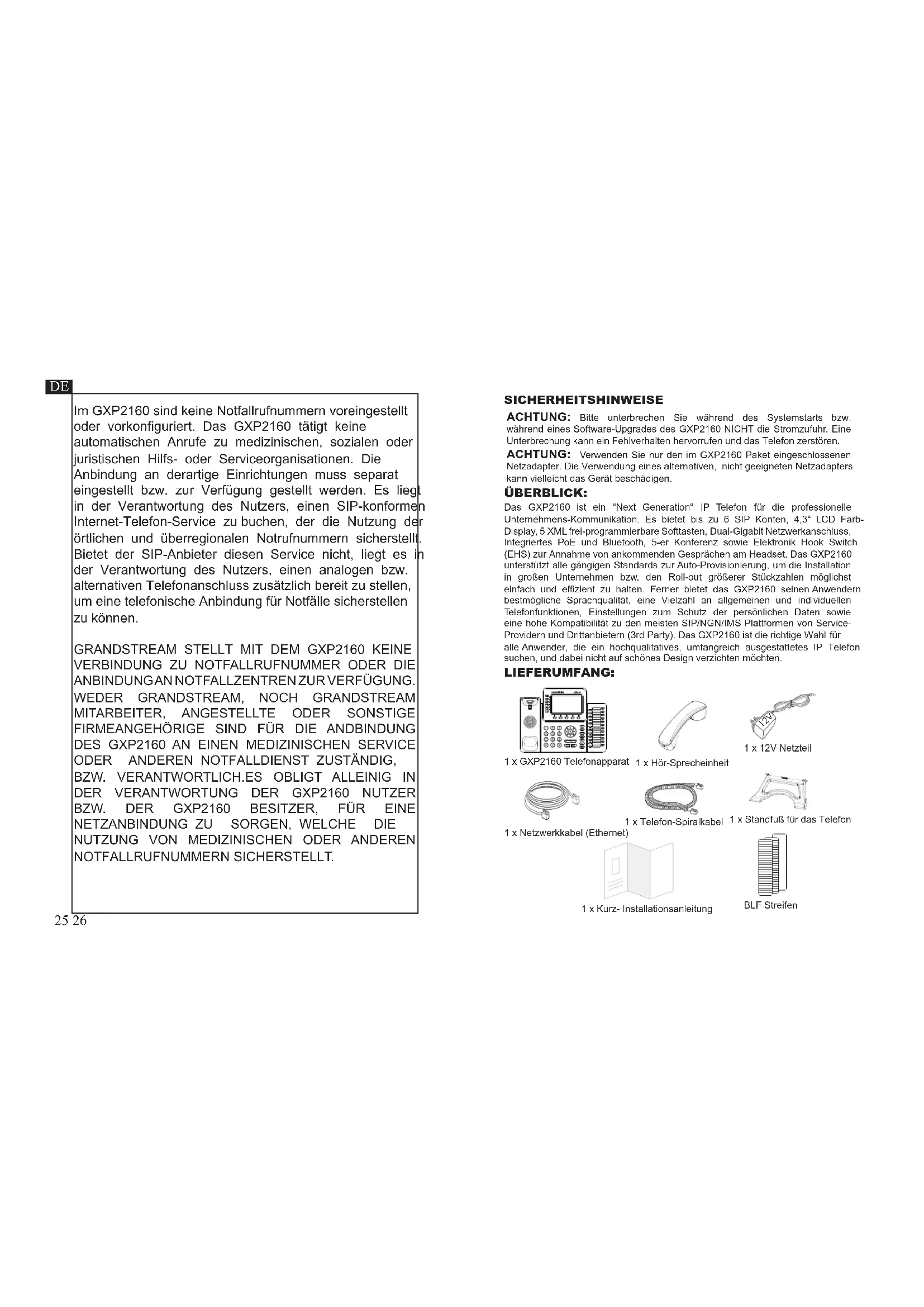 Im GXP2160 sind keine Notfallrufnummern voreingestellt oder vorkonguriert. Das GXP2160 tätigt keine automatischen Anrufe zu medizinischen, sozialen oder juristischen Hilfs- oder Serviceorganisationen. Die Anbindung an derartige Einrichtungen muss separat eingestellt bzw. zur Verfügung gestellt werden. Es liegt in der Verantwortung des Nutzers, einen SIP-konformen Internet-Telefon-Service zu buchen, der die Nutzung der örtlichen und überregionalen Notrufnummern sicherstellt. Bietet der SIP-Anbieter diesen Service nicht, liegt es in der Verantwortung des Nutzers, einen analogen bzw. alternativen Telefonanschluss zusätzlich bereit zu stellen, um eine telefonische Anbindung für Notfälle sicherstellen zu können.