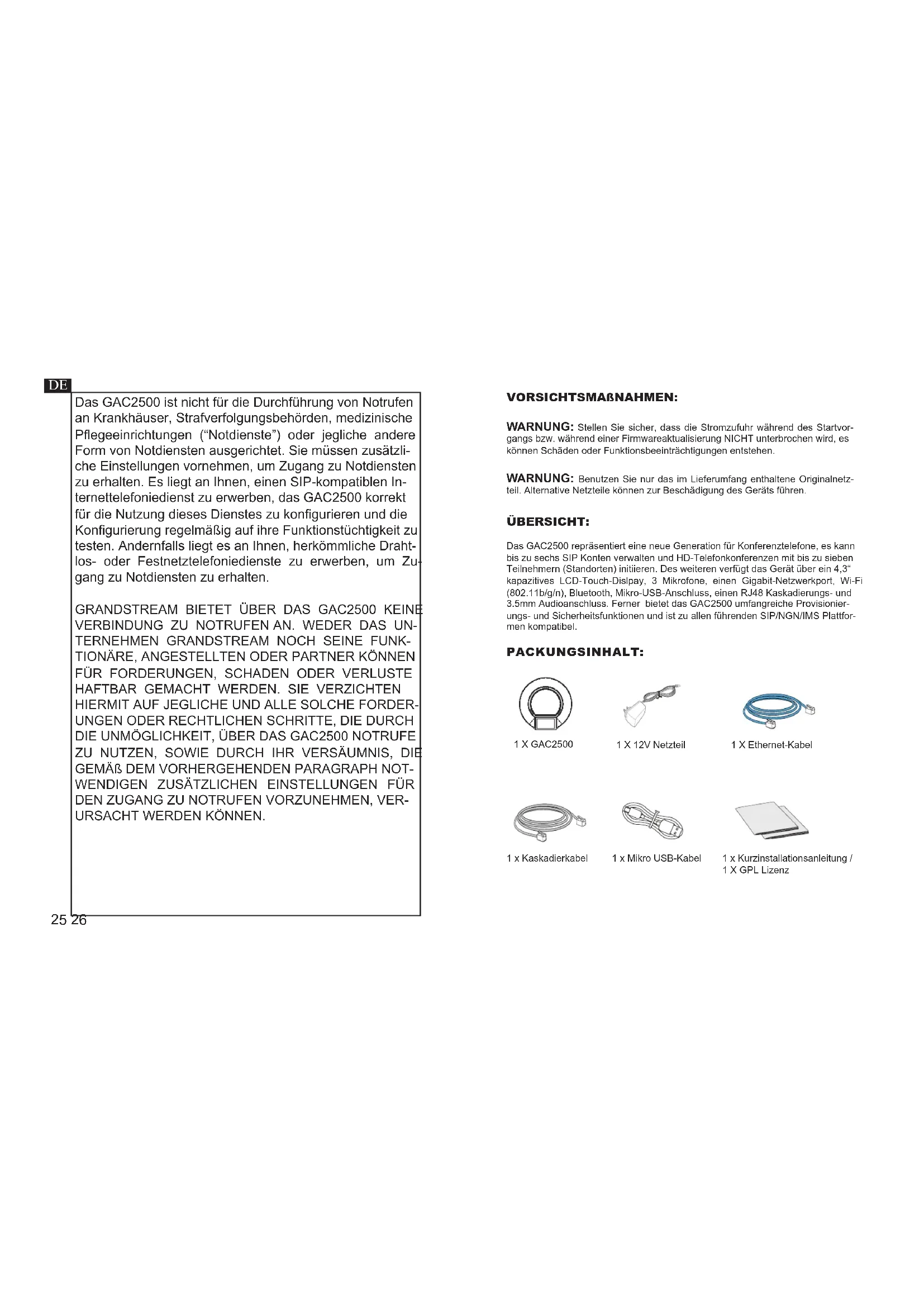 contacter votre FAI (Fournisseur d’Accès à Internet) pour des paramètres supplé- mentaires qui pourront être nécessaires pour la conguration de l’appareil. CONFIGURATION DE L’APPAREIL: Congurer le GAC2500 Via le Navigateur Web: Congurer le GAC2500 Via l’Ecran Tactile:25 26 Das GAC2500 ist nicht für die Durchführung von Notrufen an Krankhäuser, Strafverfolgungsbehörden, medizinische Pegeeinrichtungen (“Notdienste”) oder jegliche andere Form von Notdiensten ausgerichtet. Sie müssen zusätzli- che Einstellungen vornehmen, um Zugang zu Notdiensten zu erhalten. Es liegt an Ihnen, einen SIP-kompatiblen In- ternettelefoniedienst zu erwerben, das GAC2500 korrekt für die Nutzung dieses Dienstes zu kongurieren und die Kongurierung regelmäßig auf ihre Funktionstüchtigkeit zu testen. Andernfalls liegt es an Ihnen, herkömmliche Draht- los- oder Festnetztelefoniedienste zu erwerben, um Zu- gang zu Notdiensten zu erhalten.