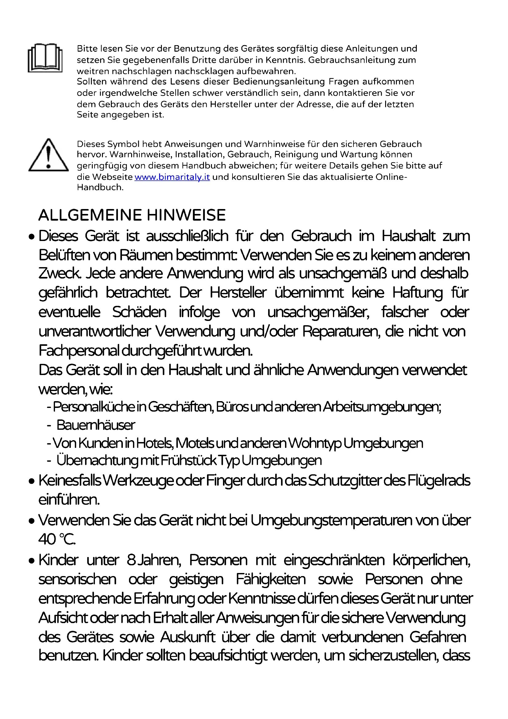 Dieses Symbol hebt Anweisungen und Warnhinweise für den sicheren Gebrauch hervor. Warnhinweise, Installation, Gebrauch, Reinigung und Wartung können geringfügig von diesem Handbuch abweichen; für weitere Details gehen Sie bitte auf die Webseite www.bimaritaly.it und konsultieren Sie das aktualisierte Online- Handbuch. ALLGEMEINE HINWEISE