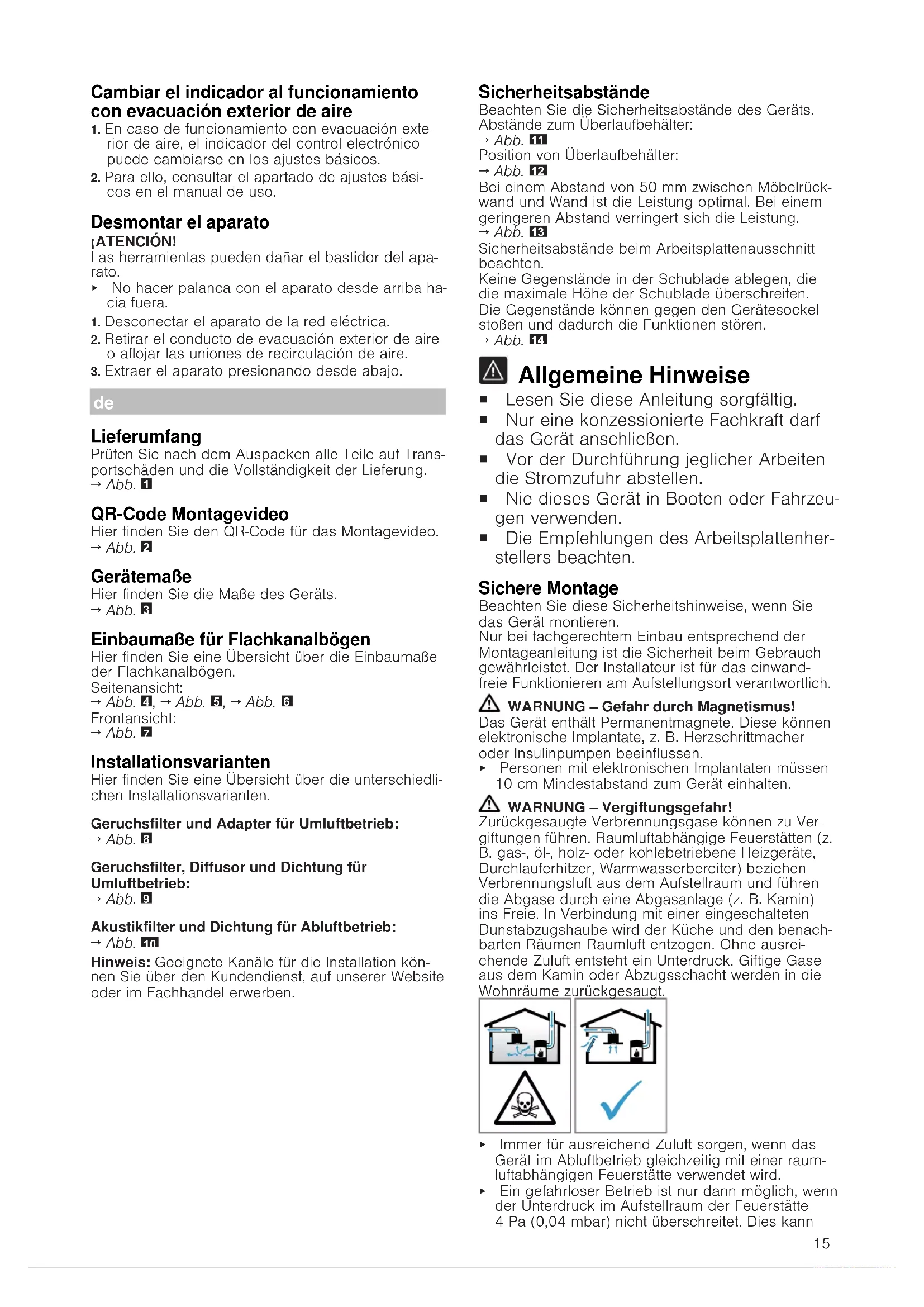 Allgemeine Hinweise ¡ Lesen Sie diese Anleitung sorgfältig. ¡ Nur eine konzessionierte Fachkraft darf das Gerät anschließen. ¡ Vor der Durchführung jeglicher Arbeiten die Stromzufuhr abstellen. ¡ Nie dieses Gerät in Booten oder Fahrzeu- gen verwenden. ¡ Die Empfehlungen des Arbeitsplattenher- stellers beachten. Sichere Montage Beachten Sie diese Sicherheitshinweise, wenn Sie das Gerät montieren. Nur bei fachgerechtem Einbau entsprechend der Montageanleitung ist die Sicherheit beim Gebrauch gewährleistet. Der Installateur ist für das einwand- freie Funktionieren am Aufstellungsort verantwortlich. WARNUNG‒Gefahr durch Magnetismus! Das Gerät enthält Permanentmagnete. Diese können elektronische Implantate, z.B. Herzschrittmacher oder Insulinpumpen beeinflussen. ▶ Personen mit elektronischen Implantaten müssen 10cm Mindestabstand zum Gerät einhalten. WARNUNG‒Vergiftungsgefahr! Zurückgesaugte Verbrennungsgase können zu Ver- giftungen führen. Raumluftabhängige Feuerstätten (z. B. gas-, öl-, holz- oder kohlebetriebene Heizgeräte, Durchlauferhitzer, Warmwasserbereiter) beziehen Verbrennungsluft aus dem Aufstellraum und führen die Abgase durch eine Abgasanlage (z. B. Kamin) ins Freie. In Verbindung mit einer eingeschalteten Dunstabzugshaube wird der Küche und den benach- barten Räumen Raumluft entzogen. Ohne ausrei- chende Zuluft entsteht ein Unterdruck. Giftige Gase aus dem Kamin oder Abzugsschacht werden in die Wohnräume zurückgesaugt. ▶ Immer für ausreichend Zuluft sorgen, wenn das Gerät im Abluftbetrieb gleichzeitig mit einer raum- luftabhängigen Feuerstätte verwendet wird. ▶ Ein gefahrloser Betrieb ist nur dann möglich, wenn der Unterdruck im Aufstellraum der Feuerstätte 4Pa(0,04mbar) nicht überschreitet. Dies kann16 erreicht werden, wenn durch nicht verschließbare Öffnungen, z. B. in Türen, Fenstern, in Verbindung mit einem Zuluft- / Abluftmauerkasten oder durch andere technische Maßnahmen, die zur Verbren- nung benötigte Luft nachströmen kann. Ein Zu- luft-/Abluftmauerkasten allein stellt die Einhaltung des Grenzwerts nicht sicher. ▶ Ziehen Sie in jedem Fall den Rat des zuständigen Schornsteinfegermeisters hinzu, der den gesam- ten Lüftungsverbund des Hauses beurteilen kann und Ihnen die passende Maßnahme zur Belüftung vorschlägt. ▶ Wird das Gerät ausschließlich im Umluftbetrieb eingesetzt, ist der Betrieb ohne Einschränkung möglich. WARNUNG‒Brandgefahr! Die Fettablagerungen im Fettfilter können sich ent- zünden. ▶ In der Nähe des Gerätes nie mit offener Flamme arbeiten (z.B. flambieren). ▶ Gerät nur dann in der Nähe einer Feuerstätte für feste Brennstoffe (z.B. Holz oder Kohle) installie- ren, wenn eine geschlossene, nicht abnehmbare Abdeckung vorhanden ist. Es darf keinen Funken- flug geben. WARNUNG‒Verletzungsgefahr! Veränderungen am elektrischen oder mechanischen Aufbau sind gefährlich und können zu Fehlfunktio- nen führen. ▶ Keine Veränderungen am elektrischen oder me- chanischen Aufbau durchführen. Teile, die während der Montage zugänglich sind, können scharfkantig sein und zu Schnittverletzungen führen. ▶ Schutzhandschuhe tragen. Das Gerät ist schwer. ▶ Zum Bewegen des Gerätes sind 2 Personen erfor- derlich. ▶ Nur geeignete Hilfsmittel verwenden. WARNUNG‒Erstickungsgefahr! Kinder können sich Verpackungsmaterial über den Kopf ziehen oder sich darin einwickeln und ersti- cken. ▶ Verpackungsmaterial von Kindern fernhalten. ▶ Kinder nicht mit Verpackungsmaterial spielen las- sen. WARNUNG‒Vergiftungsgefahr! Zurückgesaugte Verbrennungsgase können zu Ver- giftungen führen. ▶ Die Abluft nicht in einen Rauchkamin oder einen Abgaskamin abgeben, der in Betrieb ist. ▶ Die Abluft nicht in einen Schacht abgeben, der zur Entlüftung von Aufstellungsräumen von Feuerstät- ten dient. ▶ Soll die Abluft in einen Rauchkamin oder Abgas- kamin geführt werden, der nicht in Betrieb ist, muss die Zustimmung des zuständigen Schorn- steinfegermeisters eingeholt werden. Zurückgesaugte Verbrennungsgase können zu Ver- giftungen führen. ▶ Wenn eine Dunstabzugshaube mit einer raumluft- abhängigen Feuerstätte installiert wird, muss die Stromzuführung der Dunstabzugshaube mit einer geeigneten Sicherheitsschaltung versehen wer- den. Hinweise zum elektrischen Anschluss Um das Gerät sicher elektrisch anschließen zu kön- nen, beachten Sie diese Hinweise. WARNUNG‒Stromschlaggefahr! Die Trennung des Geräts vom Stromnetz muss je- derzeit möglich sein. Das Gerät darf nur an eine vor- schriftsmäßig installierte Anschlussdose angeschlos- sen werden. ▶ In der festverlegten elektrischen Installation muss eine allpolige Trennvorrichtung nach den Bedin- gungen der Überspannungskategorie III und nach den Errichtungsbestimmungen eingebaut werden. ▶ Nur eine Elektrofachkraft darf die festverlegte elek- trische Installation ausführen. Wir empfehlen einen Fehlerstromschutzschalter (FI-Schalter) im Strom- kreis der Geräteversorgung zu installieren. ¡ Das Anschlusskabel nicht knicken oder einklem- men und von scharfen Kanten fernhalten. ¡ Das Anschlusskabel so verlegen, dass es nicht das heiße Gerätegehäuse berührt. ¡ Nur das mit dem Gerät mitgelieferte oder vom technischen Kundendienst gelieferte Anschlusska- bel verwenden. ¡ Dieses Gerät entspricht den EG-Funkentstörbe- stimmungen. ¡ Das Gerät entspricht der Schutzklasse 1. Daher das Gerät nur mit Schutzleiter-Anschluss verwen- den. ¡ Der Hersteller übernimmt keine Verantwortung für Betriebsstörungen oder mögliche Schäden, die auf eine fehlerhafte elektrische Installation zurück- zuführen sind. Elektrischen Anschluss vorbereiten Voraussetzung:Nur der dafür ausgebildete Kunden- dienst darf Arbeiten am Geräteinneren durchführen oder das Netzkabel tauschen.