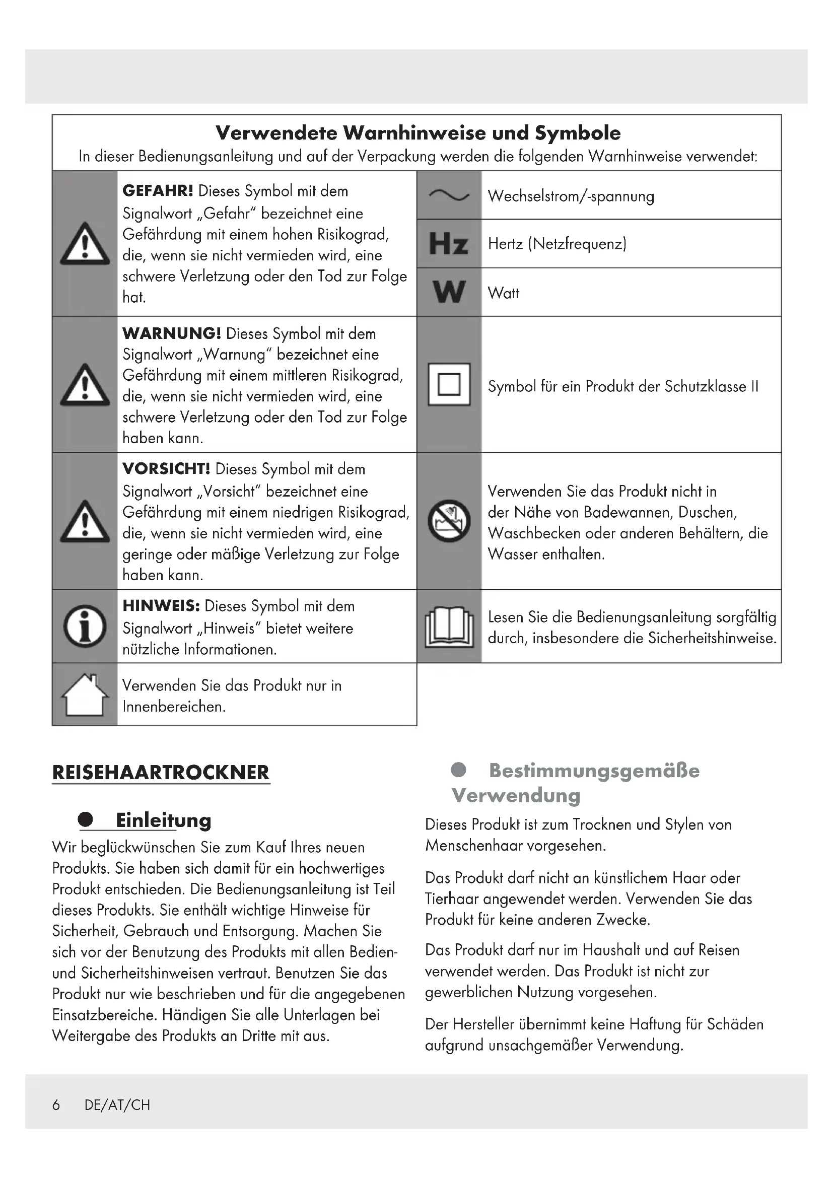 DE/AT/CH Verwendete Warnhinweise und Symbole............................... Seite 6 Einleitung .................................................................... Seite 6 Bestimmungsgemäße Verwendung ................................................. Seite 6 Lieferumfang................................................................... Seite 7 Teilebeschreibung .............................................................. Seite 7 Technische Daten ............................................................... Seite 7 Sicherheitshinweise ........................................................ Seite 7 Vor der ersten Verwendung............................................... Seite 10 Bedienung ................................................................... Seite 10 Haare trocknen ................................................................ Seite 10 Haare stylen................................................................... Seite 11 Reinigung und Pflege ...................................................... Seite 11 Gehäuse, Lufteinlass und schmale Stylingdüse reinigen ................................. Seite 11 Lagerung .................................................................... Seite 11 Entsorgung .................................................................. Seite 11 Garantie ..................................................................... Seite 126 DE/AT/CH Verwendete Warnhinweise und Symbole In dieser Bedienungsanleitung und auf der Verpackung werden die folgenden Warnhinweise verwendet: GEFAHR! Dieses Symbol mit dem Signalwort „Gefahr“ bezeichnet eine Gefährdung mit einem hohen Risikograd, die, wenn sie nicht vermieden wird, eine schwere Verletzung oder den Tod zur Folge hat. Wechselstrom/-spannung Hertz (Netzfrequenz) Watt WARNUNG! Dieses Symbol mit dem Signalwort „Warnung“ bezeichnet eine Gefährdung mit einem mittleren Risikograd, die, wenn sie nicht vermieden wird, eine schwere Verletzung oder den Tod zur Folge haben kann. Symbol für ein Produkt der Schutzklasse II VORSICHT! Dieses Symbol mit dem Signalwort „Vorsicht“ bezeichnet eine Gefährdung mit einem niedrigen Risikograd, die, wenn sie nicht vermieden wird, eine geringe oder mäßige Verletzung zur Folge haben kann. Verwenden Sie das Produkt nicht in der Nähe von Badewannen, Duschen, Waschbecken oder anderen Behältern, die Wasser enthalten. HINWEIS: Dieses Symbol mit dem Signalwort „Hinweis“ bietet weitere nützliche Informationen. Lesen Sie die Bedienungsanleitung sorgfältig durch, insbesondere die Sicherheitshinweise. Verwenden Sie das Produkt nur in Innenbereichen. REISEHAARTROCKNER Einleitung Wir beglückwünschen Sie zum Kauf Ihres neuen Produkts. Sie haben sich damit für ein hochwertiges Produkt entschieden. Die Bedienungsanleitung ist Teil dieses Produkts. Sie enthält wichtige Hinweise für Sicherheit, Gebrauch und Entsorgung. Machen Sie sich vor der Benutzung des Produkts mit allen Bedien- und Sicherheitshinweisen vertraut. Benutzen Sie das Produkt nur wie beschrieben und für die angegebenen Einsatzbereiche. Händigen Sie alle Unterlagen bei Weitergabe des Produkts an Dritte mit aus. Bestimmungsgemäße Verwendung Dieses Produkt ist zum Trocknen und Stylen von Menschenhaar vorgesehen. Das Produkt darf nicht an künstlichem Haar oder Tierhaar angewendet werden. Verwenden Sie das Produkt für keine anderen Zwecke. Das Produkt darf nur im Haushalt und auf Reisen verwendet werden. Das Produkt ist nicht zur gewerblichen Nutzung vorgesehen. Der Hersteller übernimmt keine Haftung für Schäden aufgrund unsachgemäßer Verwendung.7 DE/AT/CH Lieferumfang Überprüfen Sie nach dem Auspacken des Produkts, ob die Lieferung vollständig ist und alle Teile in ordnungsgemäßem Zustand sind. Entfernen Sie vor der Verwendung sämtliche Verpackungsmaterialien. 1x Reisehaartrockner 1x Schmale Stylingdüse 1x Bedienungsanleitung Teilebeschreibung [1] Lufteinlass [2] Luftauslass [3] Schmale Stylingdüse [4] Griff [5] Schalter O / I / II – Ein/aus – Luftströmung – Wärmesteuerung [6] Anschlussleitung und Netzstecker [7] Aufhängeöse [8] Dualer Spannungs-Wahlschalter [9] Klappbares Gelenk Technische Daten Eingangsspannung: 100–127 V