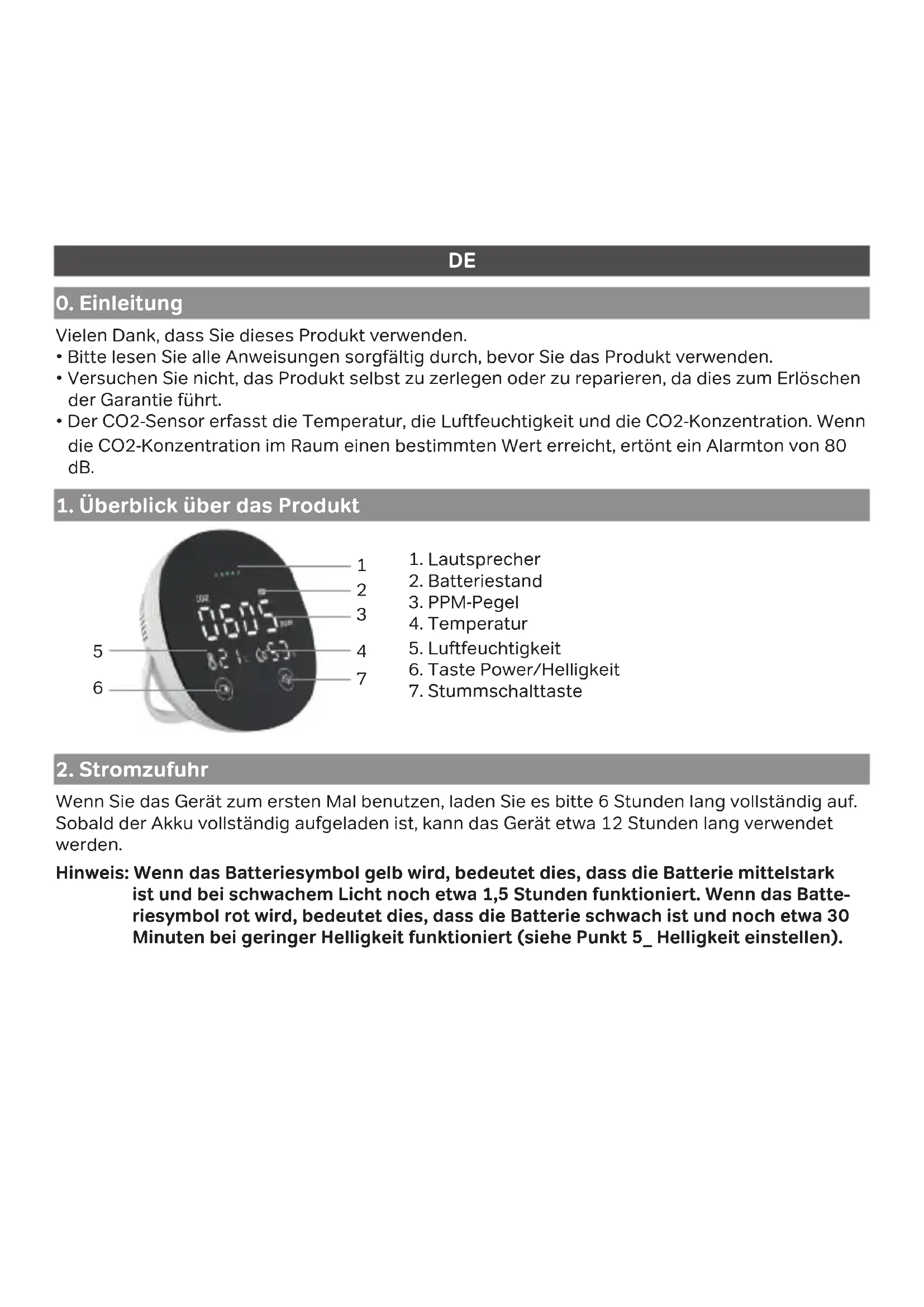 - Der CO2-Sensor erfasst die Temperatur, die Luftfeuchtigkeit und die CO2-Konzentration. Wenn die CO2-Konzentration im Raum einen bestimmten Wert erreicht, ertönt ein Alarmton von 80 dB. Wenn Sie das Gerät zum ersten Mal benutzen, laden Sie es bitte 6 Stunden lang vollständig auf. Sobald der Akku vollständig aufgeladen ist, kann das Gerät etwa 12 Stunden lang verwendet werden.