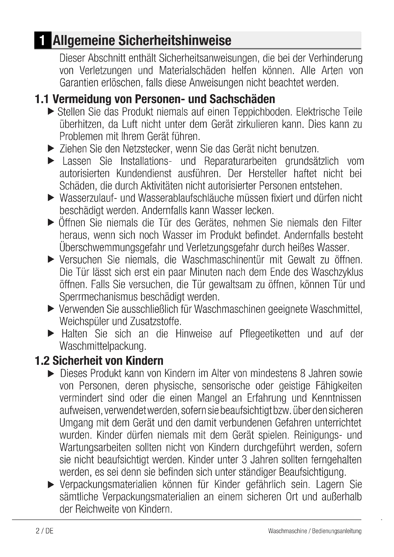 Washing machine2 / DE Waschmaschine / Bedienungsanleitung 1 Allgemeine Sicherheitshinweise Dieser Abschnitt enthält Sicherheitsanweisungen, die bei der Verhinderung von Verletzungen und Materialschäden helfen können. Alle Arten von Garantien erlöschen, falls diese Anweisungen nicht beachtet werden.