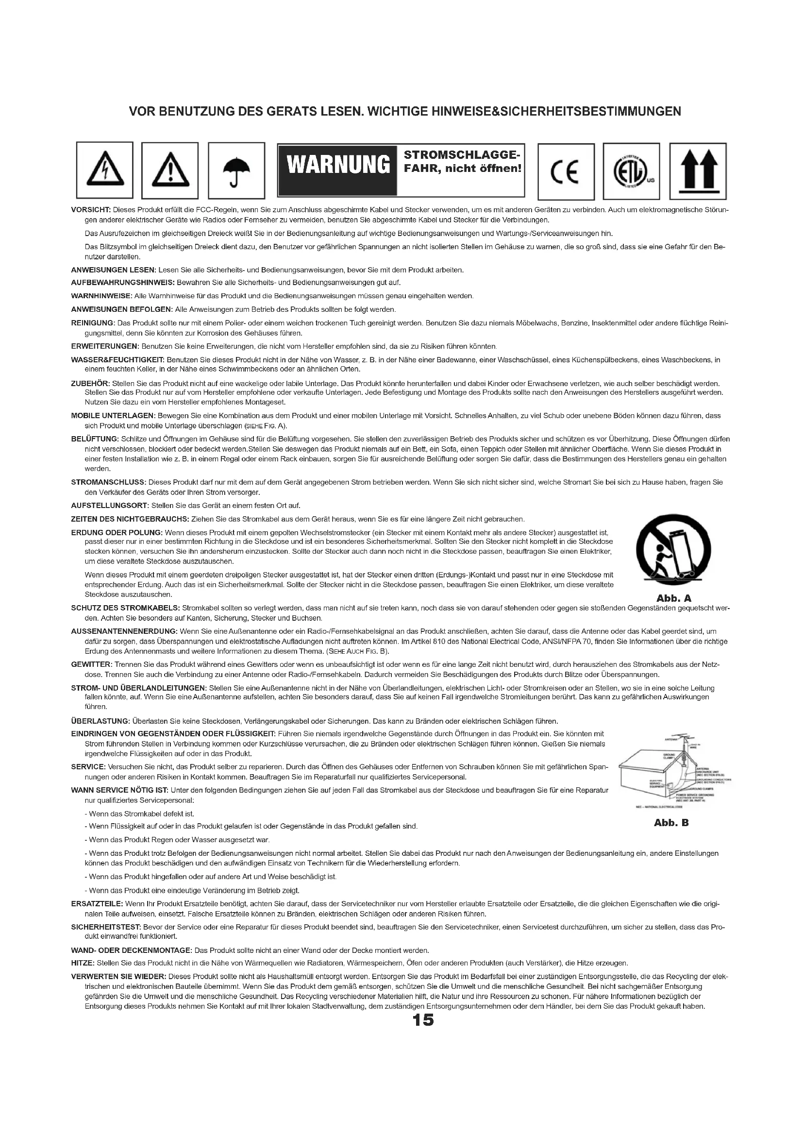COMPATIBILITE :VORSICHT: Dieses Produkt erfüllt die FCC-Regeln, wenn Sie zum Anschluss abgeschirmte Kabel und Stecker verwenden, um es mit anderen Geräten zu verbinden. Auch um elektromagnetische Störun- gen anderer elektrischer Geräte wie Radios oder Fernseher zu vermeiden, benutzen Sie abgeschirmte Kabel und Stecker für die Verbindungen. Das Ausrufezeichen im gleichseitigen Dreieck weißt Sie in der Bedienungsanleitung auf wichtige Bedienungsanweisungen und Wartungs-/ Service anweisungen hin. Das Blitzsymbol im gleichseitigen Dreieck dient dazu, den Benutzer vor gefähr lichen Spannungen an nicht isolierten Stellen im Gehäuse zu warnen, die so groß sind, dass sie eine Gefahr für den Be- nutzer darstellen. ANWEISUNGEN LESEN: Lesen Sie alle Sicherheits- und Bedienungsanweisungen, bevor Sie mit dem Produkt arbeiten. AUFBEWAHRUNGSHINWEIS: Bewahren Sie alle Sicherheits- und Bedienungs an weis ungen gut auf. WARNHINWEISE: Alle Warnhinweise für das Produkt und die Bedienungsan weis ungen müssen genau eingehalten werden. ANWEISUNGEN BEFOLGEN: Alle Anweisungen zum Betrieb des Produkts sollten be folgt werden. REINIGUNG: Das Produkt sollte nur mit einem Polier- oder einem weichen trockenen Tuch gereinigt werden. Benutzen Sie dazu niemals Möbelwachs, Benzine, In sekten mittel oder andere flüchtige Reini- gungsmittel, denn Sie könnten zur Korrosion des Gehäuses führen. ERWEITERUNGEN: Benutzen Sie keine Erweiterungen, die nicht vom Hersteller empfohlen sind, da sie zu Risiken führen könnten. WASSER&FEUCHTIGKEIT: Benutzen Sie dieses Produkt nicht in der Nähe von Was ser, z. B. in der Nähe einer Badewanne, einer Waschschüssel, eines Küchenspül beckens, eines Waschbeckens, in einem feuchten Keller, in der Nähe eines Schwimmbeckens oder an ähnlichen Orten. ZUBEHÖR: Stellen Sie das Produkt nicht auf eine wackelige oder labile Unterlage. Das Produkt könnte herunterfallen und dabei Kinder oder Erwachsene verletzen, wie auch selber beschädigt werden. Stellen Sie das Produkt nur auf vom Hersteller empfohlene oder verkaufte Unterlagen. Jede Befestigung und Montage des Produkts sollte nach den Anweisungen des Herstellers ausgeführt werden. Nutzen Sie dazu ein vom Hersteller empfohlenes Montageset. MOBILE UNTERLAGEN: Bewegen Sie eine Kombination aus dem Produkt und einer mobilen Unterlage mit Vorsicht. Schnelles Anhalten, zu viel Schub oder unebene Böden können dazu führen, dass sich Produkt und mobile Unterlage überschlagen (SIEHE FIG. A). BELÜFTUNG: Schlitze und Öffnungen im Gehäuse sind für die Belüftung vorgesehen. Sie stellen den zuverlässigen Betrieb des Produkts sicher und schützen es vor Überhitzung. Diese Öffnungen dürfen nicht verschlossen, blockiert oder bedeckt werden.Stellen Sie deswegen das Produkt niemals auf ein Bett, ein Sofa, einen Teppich oder Stellen mit ähnlicher Oberfläche. Wenn Sie dieses Produkt in einer festen Installation wie z. B. in einem Regal oder einem Rack einbauen, sorgen Sie für ausreichende Belüftung oder sorgen Sie dafür, dass die Bestimmungen des Herstellers genau ein ge halten werden. STROMANSCHLUSS: Dieses Produkt darf nur mit dem auf dem Gerät angegebenen Strom betrieben werden. Wenn Sie sich nicht sicher sind, welche Stromart Sie bei sich zu Hause haben, fragen Sie den Verkäufer des Geräts oder Ihren Strom versorger.AUFSTELLUNGSORT: Stellen Sie das Gerät an einem festen Ort auf. ZEITEN DES NICHTGEBRAUCHS: Ziehen Sie das Stromkabel aus dem Gerät heraus, wenn Sie es für eine längere Zeit nicht gebrauchen. ERDUNG ODER POLUNG: Wenn dieses Produkt mit einem gepolten Wechsel stromstecker (ein Stecker mit einem Kontakt mehr als andere Stecker) ausgestattet ist, passt dieser nur in einer bestimmten Richtung in die Steckdose und ist ein besonderes Sicherheitsmerkmal. Sollten Sie den Stecker nicht komplett in die Steckdose stecken können, versuchen Sie ihn andersherum einzustecken. Sollte der Stecker auch dann noch nicht in die Steckdose passen, beauftragen Sie einen Elektriker, um diese veraltete Steckdose auszutauschen. Wenn dieses Produkt mit einem geerdeten dreipoligen Stecker ausgestattet ist, hat der Stecker einen dritten (Erdungs-)Kontakt und passt nur in eine Steckdose mit entsprechender Erdung. Auch das ist ein Sicherheitsmerkmal. Sollte der Stecker nicht in die Steckdose passen, beauftragen Sie einen Elektriker, um diese veraltete Steckdose auszutauschen. SCHUTZ DES STROMKABELS: Stromkabel sollten so verlegt werden, dass man nicht auf sie treten kann, noch dass sie von darauf stehenden oder gegen sie stoßenden Gegenständen gequetscht wer- den. Achten Sie besonders auf Kanten, Sicherung, Stecker und Buchsen. AUSSENANTENNENERDUNG: Wenn Sie eine Außenantenne oder ein Radio-/Fernsehkabelsignal an das Produkt anschließen, achten Sie darauf, dass die Antenne oder das Kabel geerdet sind, um dafür zu sorgen, dass Überspannungen und elektrostatische Aufladungen nicht auftreten können. Im Artikel 810 des National Electrical Code, ANSI/NFPA 70, finden Sie Informationen über die richtige Erdung des Antennenmasts und weitere Informationen zu diesem Thema. (S IEHE AUCH FIG. B). GEWITTER: Trennen Sie das Produkt während eines Gewitters oder wenn es unbeaufsichtigt ist oder wenn es für eine lange Zeit nicht benutzt wird, durch herausziehen des Stromkabels aus der Netz- dose. Trennen Sie auch die Verbindung zu einer Antenne oder Radio-/Fernsehkabeln. Dadurch vermeiden Sie Beschädigungen des Produkts durch Blitze oder Überspannungen. STROM- UND ÜBERLANDLEITUNGEN: Stellen Sie eine Außenantenne nicht in der Nähe von Überlandleitungen, elektrischen Licht- oder Stromkreisen oder an Stellen, wo sie in eine solche Leitung fallen könnte, auf. Wenn Sie eine Außenantenne aufstellen, achten Sie besonders darauf, dass Sie auf keinen Fall irgendwelche Stromleitungen berührt. Das kann zu gefährlichen Auswirkungen führen. ÜBERLASTUNG: Überlasten Sie keine Steckdosen, Verlängerungskabel oder Sicherungen. Das kann zu Bränden