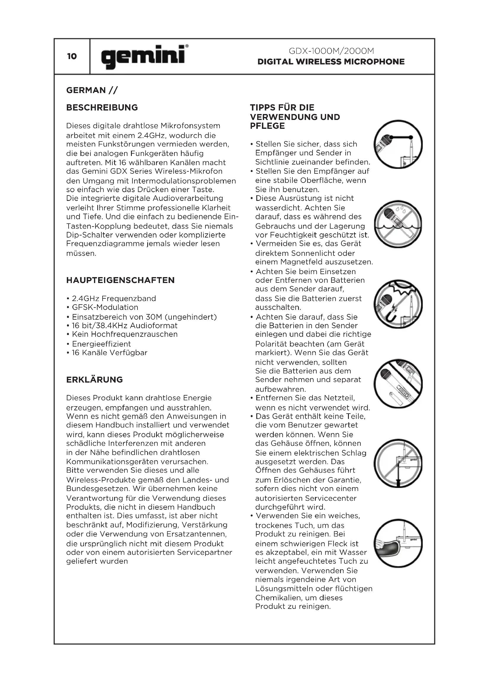 GERMAN // BESCHREIBUNG Dieses digitale drahtlose Mikrofonsystem arbeitet mit einem 2.4GHz, wodurch die meisten Funkstörungen vermieden werden, die bei analogen Funkgeräten häug auftreten. Mit 16 wählbaren Kanälen macht das Gemini GDX Series Wireless-Mikrofon den Umgang mit Intermodulationsproblemen so einfach wie das Drücken einer Taste. Die integrierte digitale Audioverarbeitung verleiht Ihrer Stimme professionelle Klarheit und Tiefe. Und die einfach zu bedienende Ein- Tasten-Kopplung bedeutet, dass Sie niemals Dip-Schalter verwenden oder komplizierte Frequenzdiagramme jemals wieder lesen müssen. HAUPTEIGENSCHAFTEN