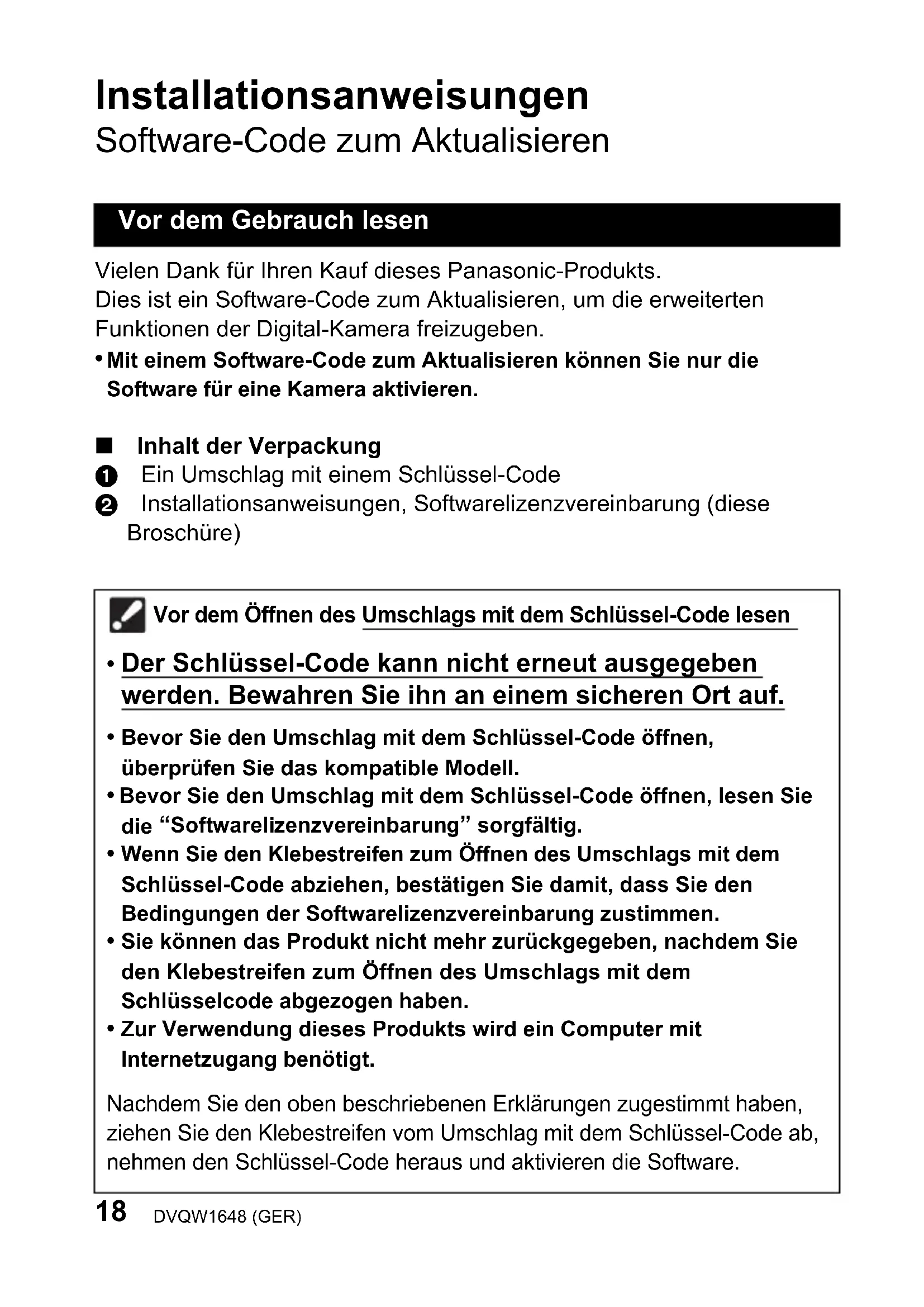 Mit einem Software-Code zum Aktualisieren können Sie nur die Software für eine Kamera aktivieren. ∫ Inhalt der Verpackung 1 Ein Umschlag mit einem Schlüssel-Code 2 Installationsanweisungen, Softwarelizenzvereinbarung (diese Broschüre) Vor dem Gebrauch lesen Vor dem Öffnen des Umschlags mit dem Schlüssel-Code lesen