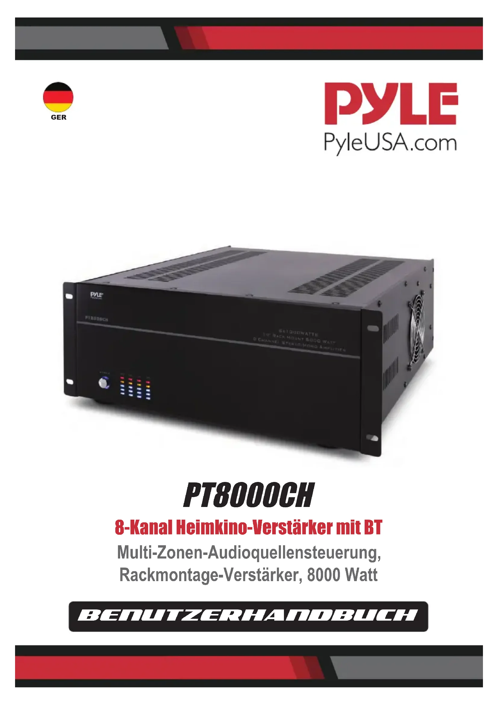 and enter your model numberPT8000CH BENUTZERHANDBUCH GER 8-Kanal Heimkino-Verstärker mit BT Multi-Zonen-Audioquellensteuerung, Rackmontage-Verstärker, 8000 WattDer PT8000CH zeichnet sich durch die hervorragende Leistung und Zuverlässigkeit aus, für die die Produkte von PYLEUSA bekannt sind. Der PT8000CH bietet die Flexibilität, die für anspruchsvolle kundenspezische Installationsanwendungen erforderlich ist. Er ist ideal für den Einsatz in Heimkino-, Stereo-, Mehrzimmer-, Mehrzonen- und gewerblichen Anwendungen geeignet. Für beste Leistung lesen Sie bitte sorgfältig die Anweisungen in diesem Handbuch. INHALTSVERZEICHNIS Merkmale Diagramm der Frontplatte Diagramm der Rückplatte Überlegungen zu Systemdesign und Betrieb Beispiele für Systemdesign Diagramm 4 - Installation in mehreren Räumen Diagramm 5 - Multi-Zonen-Installation #1 Diagramm 6 - Multi-Zonen-Installation #2 Diagramm 7 - Heimkino-/Mehrzimmer-Installation Installationsüberlegungen Installation Betrieb Fehlerbehebung Merkmale und technische Spezikationen. Lesen Sie dieses Benutzerhandbuch durch, bevor Sie das Produkt verwenden, um sicherzustellen, dass es korrekt verwendet wird. Bewahren Sie dieses Handbuch zur späteren Bezugnahme auf.MERKMALEE Audiophiles Design Das anspruchsvolle Design und die überlegenen internen Komponenten führen zu herausragender Klangqualität, Leistung und langfristiger Zuverlässigkeit. Erweiterter Schutz Jeder Kanal ist individuell geschützt. Sollte die Schaltung feststellen, dass ein Kanal aus Schutzgründen abgeschaltet werden muss, ein seltener Vorfall, wird nur der betroene Kanal abgeschaltet. Die anderen Kanäle werden weiterhin spielen. Sobald die Bedingungen wieder normal sind, wird der betroene Kanal wieder eingeschaltet und funktioniert wie gewohnt. Flexible Eingangsauswahl Jedem der 8 Kanäle können verschiedene Quelleneingänge zugewiesen werden. Ein spezieller Eingang kann jedem Kanal zugewiesen werden. Jeder Kanal kann auch so konguriert werden, dass er gemeinsame Signale von den Bus- oder Aux-Eingängen abspielt. Dies bietet die Flexibilität, die in anspruchsvollen kundenspezischen Audioinstallationen benötigt wird Brückenbildung Die Leistungsausgabe benachbarter Kanäle kann kombiniert werden, um bei Bedarf in bestimmten Bereichen zusätzliche Leistung zu bieten. Dies wird einfach durch Umlegen eines einzelnen Schalters erreicht. Individuelle Kanalpegel-Einstellungen Jeder Kanal verfügt über eine eigene Pegelanpassung. Dies ermöglicht es, die Lautstärke jedes Lautsprechers perfekt auf seinen Bereich abzustimmen.DIAGRAMM 1 - FRONTPLATTE