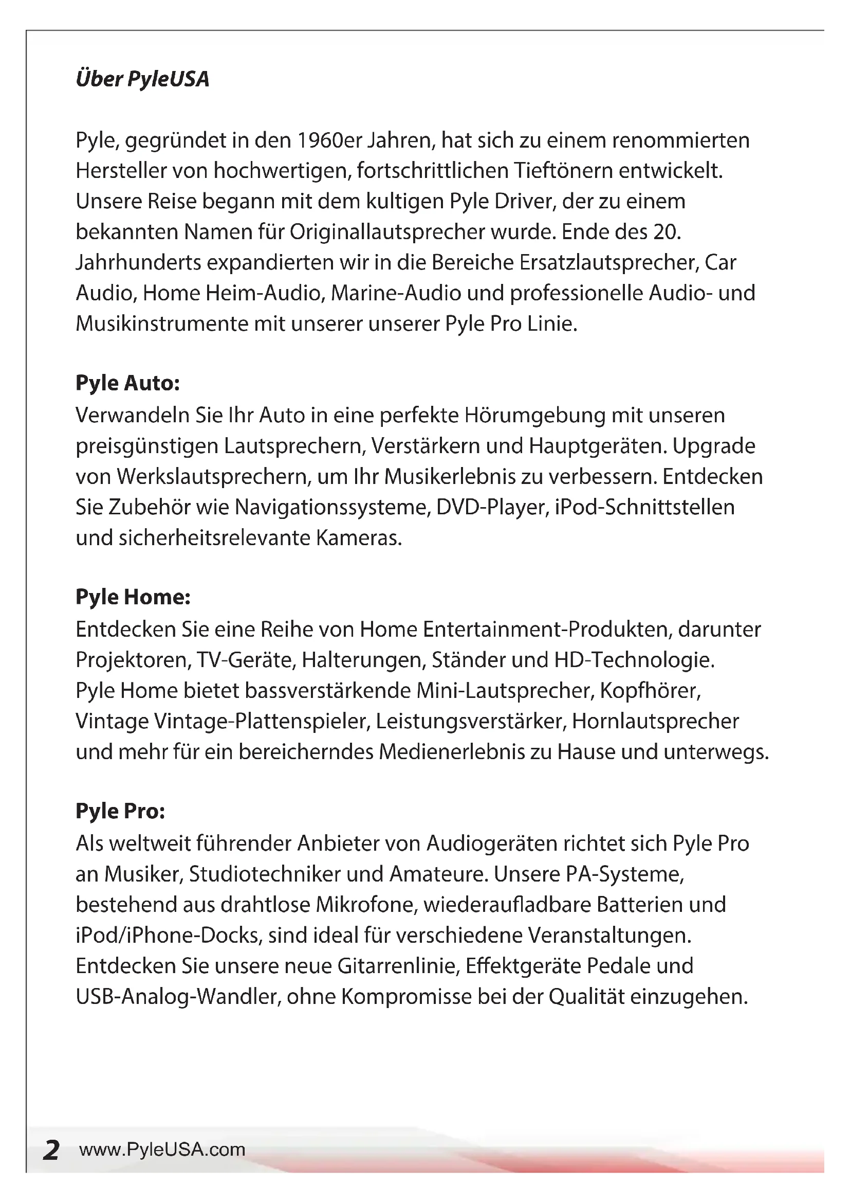 GERÜber PyleUSA Pyle, gegründet in den 1960er Jahren, hat sich zu einem renommierten Hersteller von hochwertigen, fortschrittlichen Tieftönern entwickelt. Unsere Reise begann mit dem kultigen Pyle Driver, der zu einem bekannten Namen für Originallautsprecher wurde. Ende des 20. Jahrhunderts expandierten wir in die Bereiche Ersatzlautsprecher, Car Audio, Home Heim-Audio, Marine-Audio und professionelle Audio- und Musikinstrumente mit unserer unserer Pyle Pro Linie. Pyle Auto: Verwandeln Sie Ihr Auto in eine perfekte Hörumgebung mit unseren preisgünstigen Lautsprechern, Verstärkern und Hauptgeräten. Upgrade von Werkslautsprechern, um Ihr Musikerlebnis zu verbessern. Entdecken Sie Zubehör wie Navigationssysteme, DVD-Player, iPod-Schnittstellen und sicherheitsrelevante Kameras. Pyle Home: Entdecken Sie eine Reihe von Home Entertainment-Produkten, darunter Projektoren, TV-Geräte, Halterungen, Ständer und HD-Technologie. Pyle Home bietet bassverstärkende Mini-Lautsprecher, Kopfhörer, Vintage Vintage-Plattenspieler, Leistungsverstärker, Hornlautsprecher und mehr für ein bereicherndes Medienerlebnis zu Hause und unterwegs. Pyle Pro: Als weltweit führender Anbieter von Audiogeräten richtet sich Pyle Pro an Musiker, Studiotechniker und Amateure. Unsere PA-Systeme, bestehend aus drahtlose Mikrofone, wiederauadbare Batterien und iPod/iPhone-Docks, sind ideal für verschiedene Veranstaltungen. Entdecken Sie unsere neue Gitarrenlinie, Eektgeräte Pedale und USB-Analog-Wandler, ohne Kompromisse bei der Qualität einzugehen. www.PyleUSA.com 2Bestimmt, den Benutzer auf das Vorhandensein von nicht isolierter „Gefährlicher Spannung“ innerhalb des Gerätegehäuses hinzuweisen, die stark genug sein kann, um ein Risiko eines elektrischen Schlags für eine Person zu schaen. Bestimmt, den Benutzer auf das Vorhandensein wichtiger Betriebs- und Wartungsanweisungen (Service) in der zum Produkt gehörenden Literatur hinzuweisen. SICHERHEITSANWEISUNGEN VORSICHT: Um das Risiko eines elektrischen Schlags zu verringern, VERSUCH- EN SIE NICHT, DEN VERSTÄRKER ZU ÖFFNEN ODER DIE ABDECKUNG ZU ENTFERNEN. Es gibt keine vom Benutzer zu wartenden Teile im Inneren. Bitte verwenden Sie einen qualizierten Techniker für alle Serviceleistungen. WARNUNG: Um einen elektrischen Schlag oder Brandgefahr zu vermeiden, sollte dieser Verstärker nicht Regen oder Feuchtigkeit ausgesetzt werden. Stellen Sie keine mit Flüssigkeit gefüllten Gegenstände, wie Vasen, auf den Verstärker. Bei der Verwendung von elektrischen Produkten sollte immer Vorsicht gebo- ten sein. Bitte lesen und bewahren Sie diese Sicherheitshinweise auf.