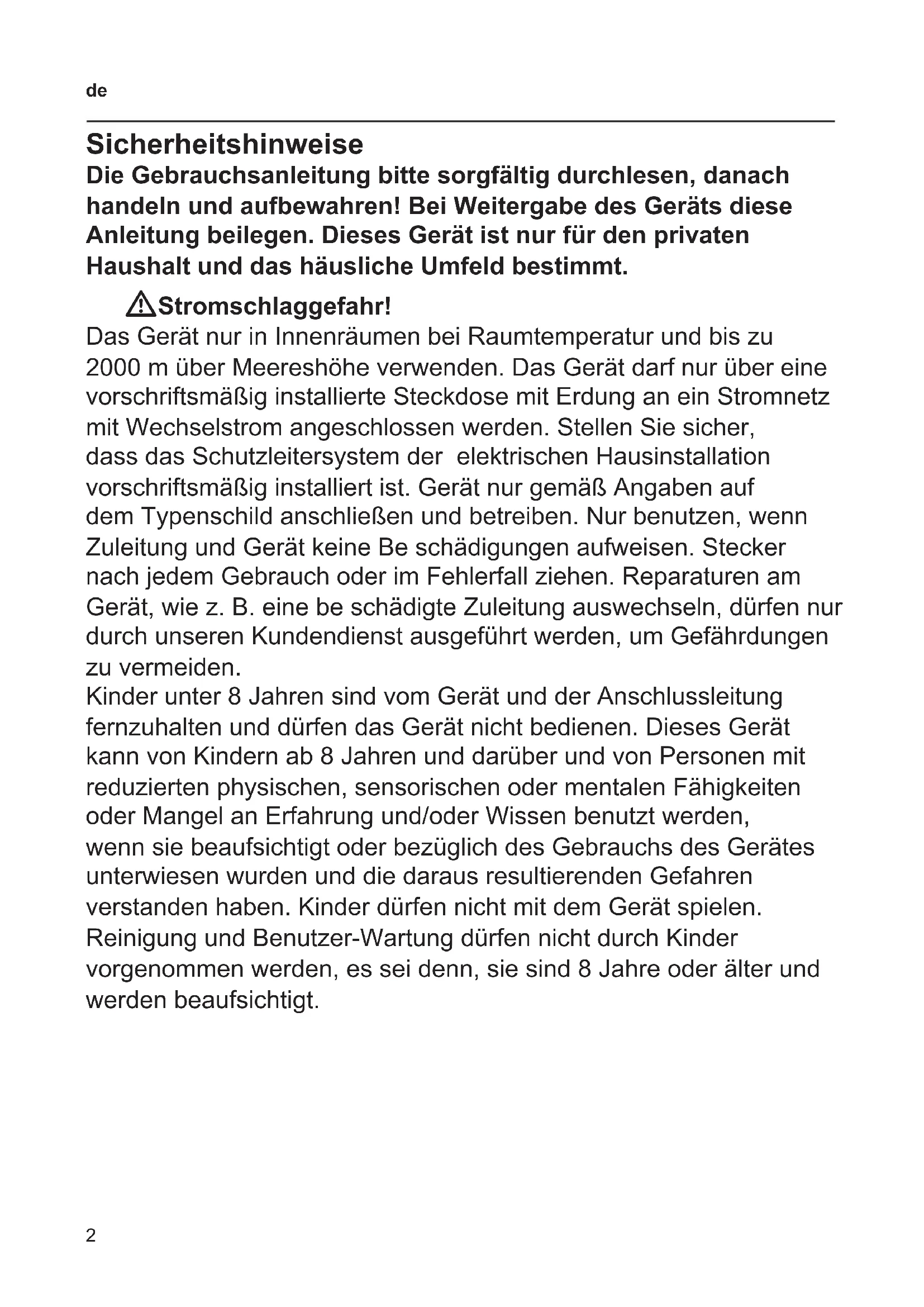 Sicherheitshinweise Die Gebrauchsanleitung bitte sorgfältig durchlesen, danach handeln und aufbewahren! Bei Weitergabe des Geräts diese Anleitung beilegen. Dieses Gerät ist nur für den privaten Haushalt und das häusliche Umfeld bestimmt. W Stromschlaggefahr! Das Gerät nur in Innenräumen bei Raumtemperatur und bis zu 2000 m über Meereshöhe verwenden. Das Gerät darf nur über eine vorschriftsmäßig installierte Steckdose mit Erdung an ein Stromnetz mit Wechselstrom angeschlossen werden. Stellen Sie sicher, dass das Schutzleitersystem der elektrischen Hausinstallation vorschriftsmäßig installiert ist. Gerät nur gemäß Angaben auf dem Typenschild anschließen und betreiben. Nur benutzen, wenn Zuleitung und Gerät keine Be schädigungen aufweisen. Stecker nach jedem Gebrauch oder im Fehlerfall ziehen. Reparaturen am Gerät, wie z. B. eine be schädigte Zuleitung auswechseln, dürfen nur durch unseren Kundendienst ausgeführt werden, um Gefährdungen zu vermeiden. Kinder unter 8 Jahren sind vom Gerät und der Anschlussleitung fernzuhalten und dürfen das Gerät nicht bedienen. Dieses Gerät kann von Kindern ab 8 Jahren und darüber und von Personen mit reduzierten physischen, sensorischen oder mentalen Fähigkeiten oder Mangel an Erfahrung und/oder Wissen benutzt werden, wenn sie beaufsichtigt oder bezüglich des Gebrauchs des Gerätes unterwiesen wurden und die daraus resultierenden Gefahren verstanden haben. Kinder dürfen nicht mit dem Gerät spielen. Reinigung und Benutzer-Wartung dürfen nicht durch Kinder vorgenommen werden, es sei denn, sie sind 8 Jahre oder älter und werden beaufsichtigt.3