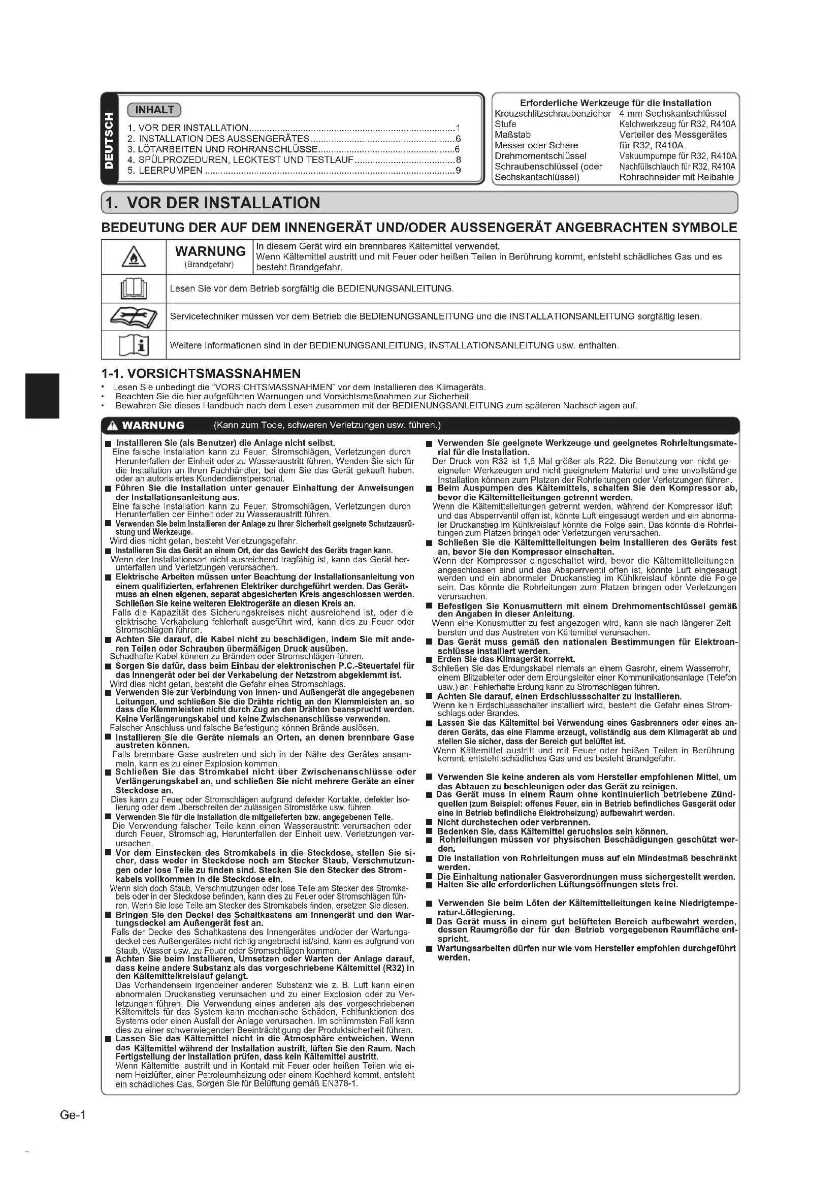 VG79A989H01_en.indd 9 2018/09/27 15:03:37Ge-1 Erforderliche Werkzeuge für die Installation Kreuzschlitzschraubenzieher Stufe Maßstab Messer oder Schere Drehmomentschlüssel Schraubenschlüssel (oder Sechskantschlüssel) 4 mm Sechskantschlüssel Kelchwerkzeug für R32, R410A Verteiler des Messgerätes für R32, R410A Vakuumpumpe für R32, R410A Nachfüllschlauch für R32, R410A Rohrschneider mit Reibahle DEUTSCH