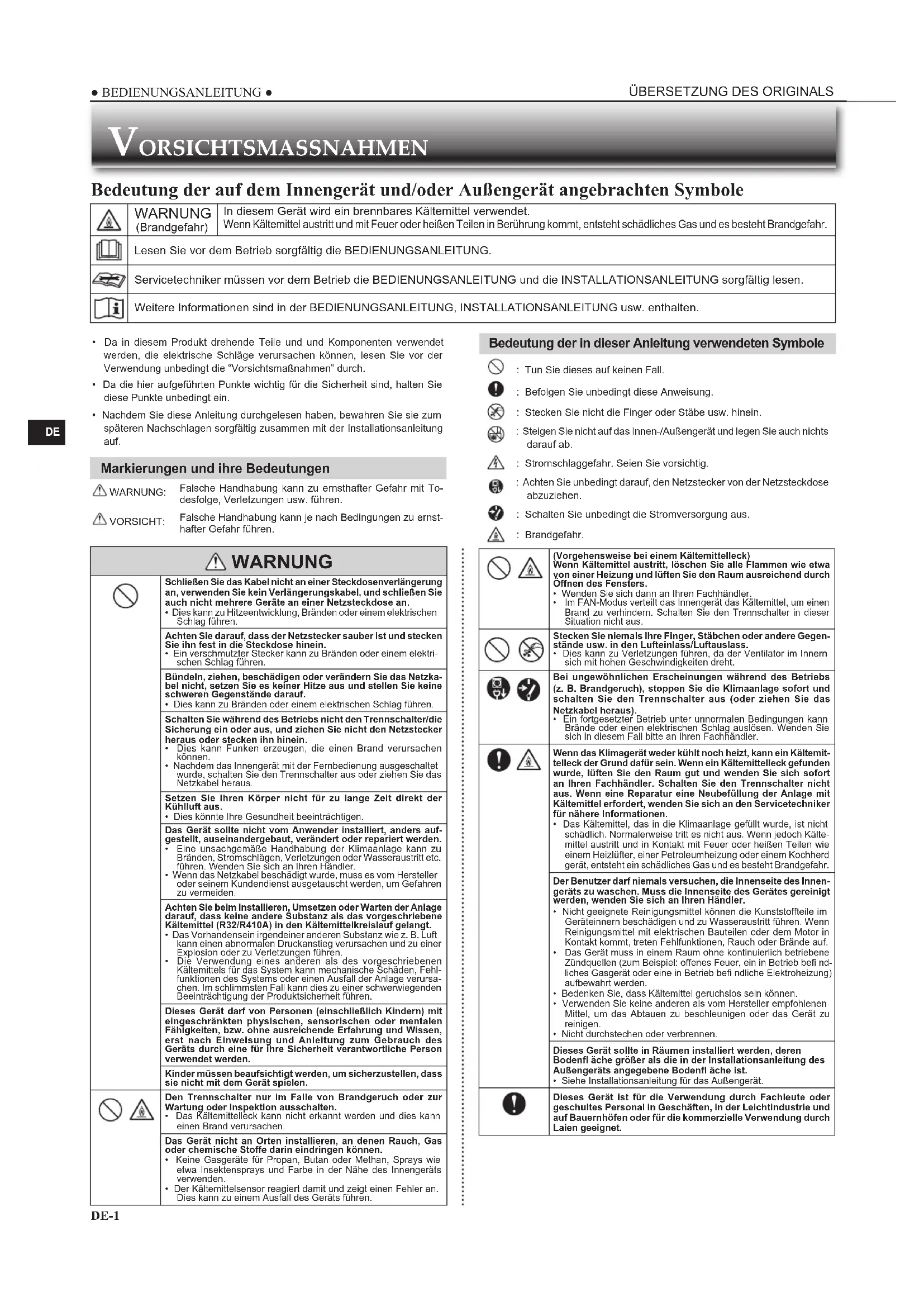 | A | WARNING (Brandgefahr) | In diesen Gerät wird ein brennbares Kältemittel verwendet. Wenn Kältemittel austritt und mit Feuer oder heißen Teilen in Berührung kommt, entstehen schädliches Gas und es besteht Brandgefahr. |