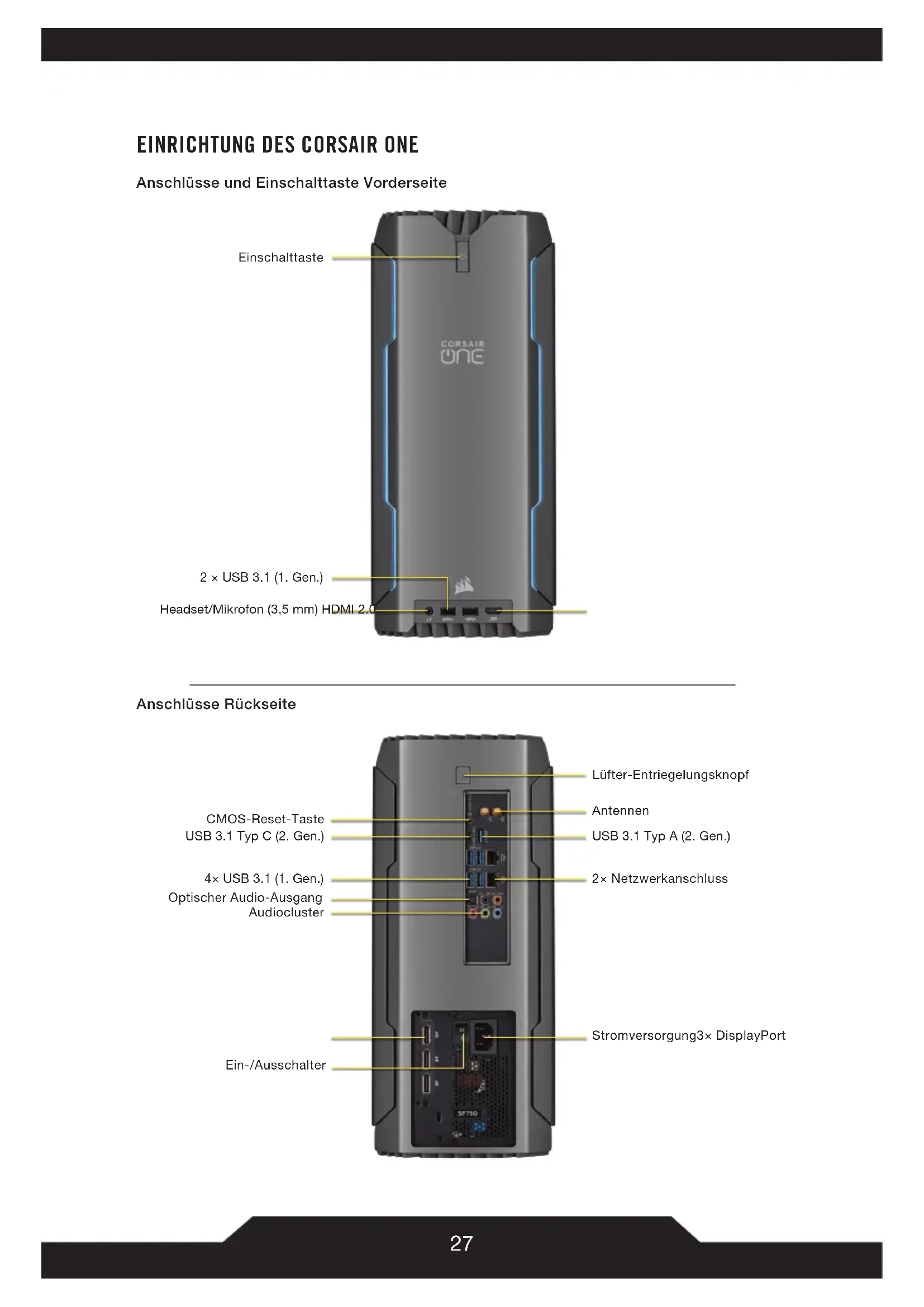 Anschlüsse und Einschalttaste Vorderseite Einschalttaste 2 × USB 3.1 (1.Gen.) Anschlüsse Rückseite Headset/Mikrofon (3,5mm) HDMI 2.0 Lüfter-Entriegelungsknopf CMOS-Reset-Taste 2× Netzwerkanschluss Stromversorgung3× DisplayPort Audiocluster Antennen 4× USB 3.1 (1.Gen.) Optischer Audio-Ausgang USB3.1 TypC (2.Gen.) Ein-/Ausschalter USB3.1 TypA (2.Gen.)28 Im Lieferumfang des CORSAIR ONE sind zwei Funkantennen enthalten. Schrauben Sie diese in die Anschlüsse auf der Rückseite des Geräts. Verbinden Sie das Stromkabel mit der Buchse auf der Rückseite des CORSAIR ONE, und stecken Sie den Stecker in eine Steckdose. Schieben Sie den Ein-/Ausschalter auf „EIN“.