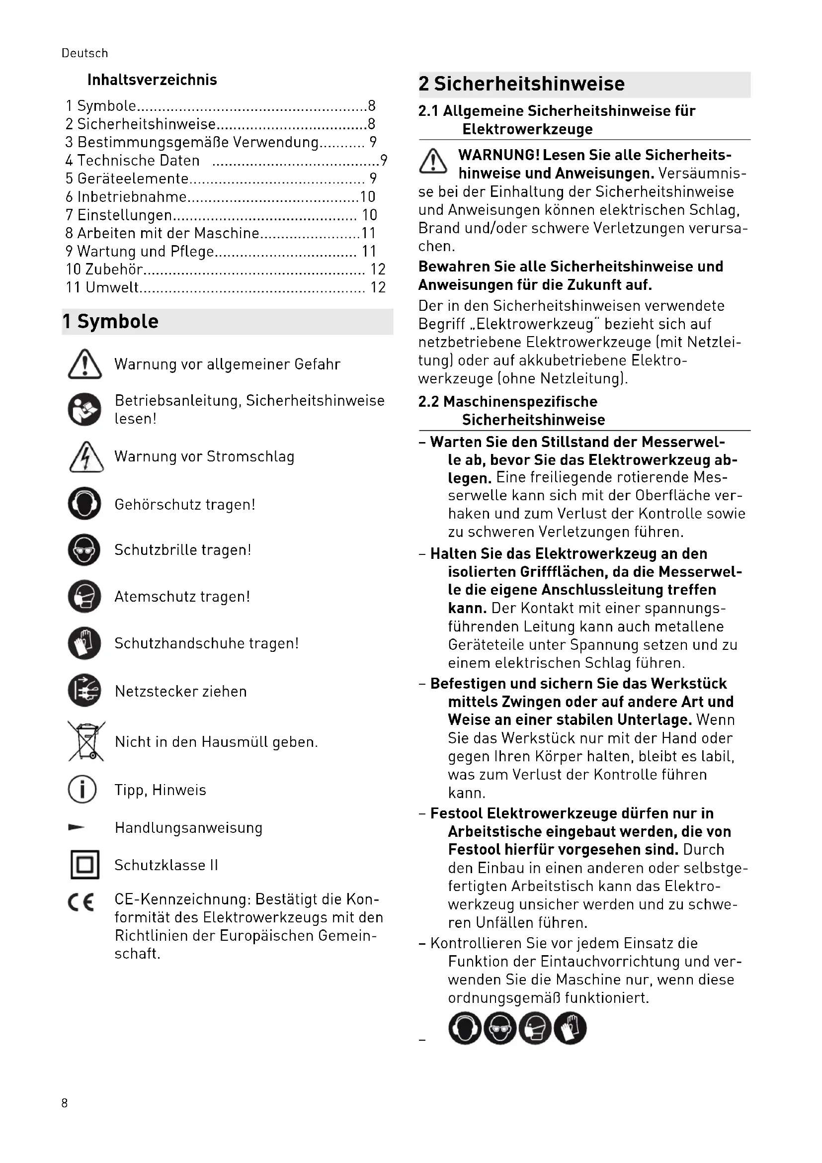 Zum Hobeln entlang einer Kante kann, nach Lösen der Klemmung [6-1] , mit dem Anschlag die Hobelbreite von 0 bis 65 mm eingestellt werden. 11 Umwelt Gerät nicht in den Hausmüll werfen! Geräte, Zubehör und Verpackungen ei ner umweltgerechten Wiederverwertung zuführen. Geltende nationale Vorschriften be achten. Nur EU: Gemäß Europäischer Richtlinie über Elektro- und Elektronik-Altgeräte und Umset zung in nationales Recht, müssen verbrauchte Elektrowerkzeuge getrennt gesammelt und ei ner umweltgerechten Wiederverwertung zuge führt werden. Informationen zur REACH: www.festool.com/ reach Deutsch 12Contents 1 Symbols.....................................................13 2 Safety warnings.........................................13 3 Intended use