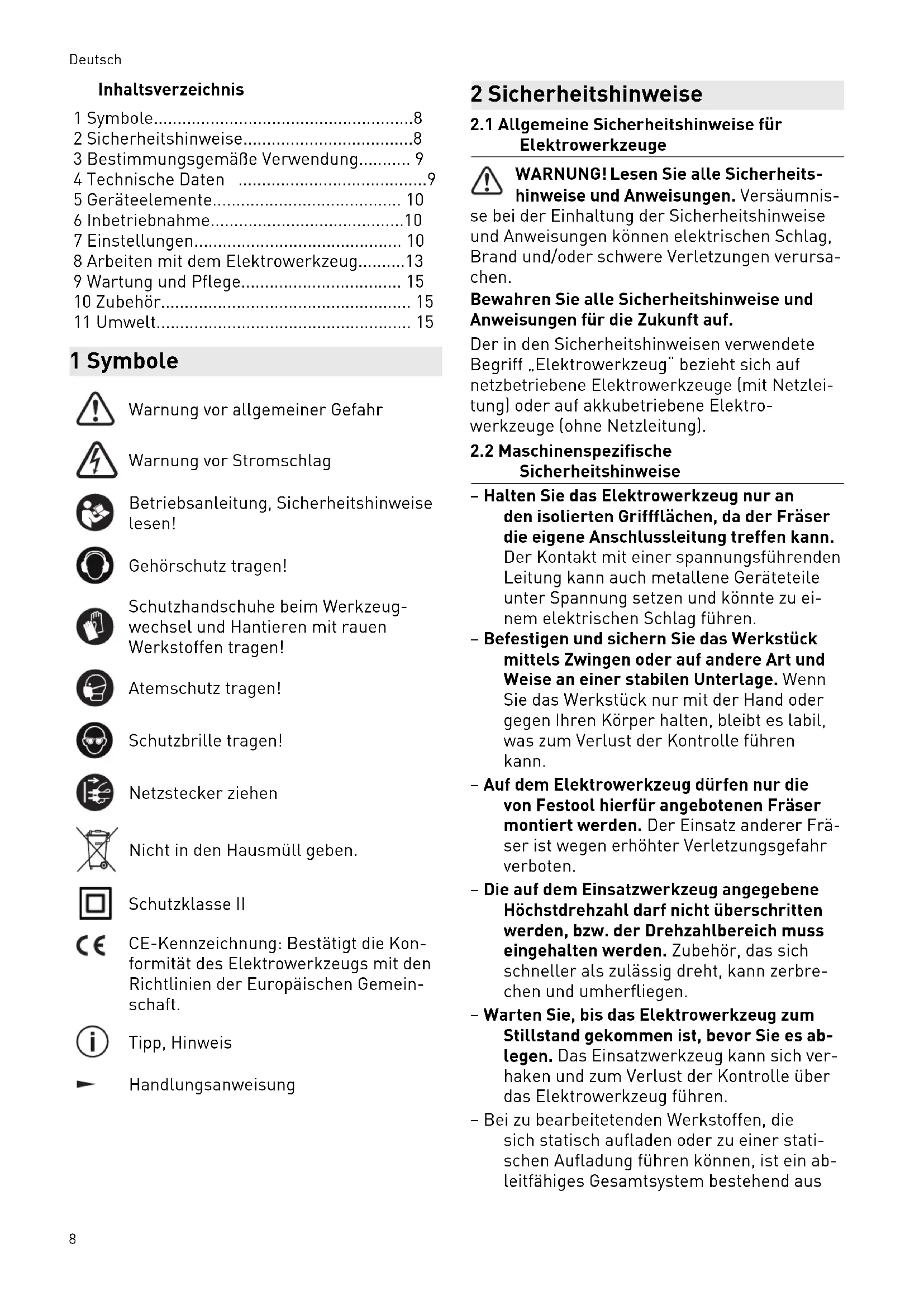 Das Gerät ist mit selbstabschaltbaren Spezial kohlen ausgerüstet. Sind diese abgenutzt, er folgt eine automatische Stromunterbrechung und das Gerät kommt zum Stillstand. Folgende Hinweise beachten: ► Wenn es nötig ist die Netzanschlussleitung des Elektrowerkzeugs auszutauschen, muss diese durch den Hersteller oder von einer autorisierten Kundendienstwerkstatt ausgetauscht werden, um Sicherheitsge fährdungen zu vermeiden. ► Beschädigte Schutzeinrichtungen und Teile müssen sachgemäß durch eine anerkannte Fachwerkstatt repariert oder ausgewech selt werden, soweit nichts anderes in der Betriebsanleitung angegeben ist. ► Zur Sicherung der Luftzirkulation die Kühl luftöffnungen im Gehäuse stets frei und sauber halten. 10 Zubehör Verwenden Sie nur Original Einsatzwerkzeuge und Zubehöre von Festool. Durch die Verwen dung von minderwertigen Einsatzwerkzeugen und Fremd-Zubehör kann es zu erhöhter Ver letzungsgefahr und erheblichen Unwuchten kommen, die die Qualität der Arbeitsergebnisse verschlechtern und den Verschleiß des Elektro werkzeugs erhöhen. Die Bestellnummern für Zubehör und Werkzeu ge finden Sie in Ihrem Festool Katalog oder im Internet unter www.festool.de. 11 Umwelt Gerät nicht in den Hausmüll werfen! Geräte, Zubehör und Verpackungen ei ner umweltgerechten Wiederverwertung zuführen. Geltende nationale Vorschriften be achten. Nur EU: Gemäß Europäischer Richtlinie über Elektro- und Elektronik-Altgeräte und Umset zung in nationales Recht, müssen verbrauchte Elektrowerkzeuge getrennt gesammelt und ei ner umweltgerechten Wiederverwertung zuge führt werden. Informationen zur REACH: www.festool.com/ reach Deutsch 15Contents 1 Symbols.....................................................16 2 Safety warnings.........................................16 3 Intended use