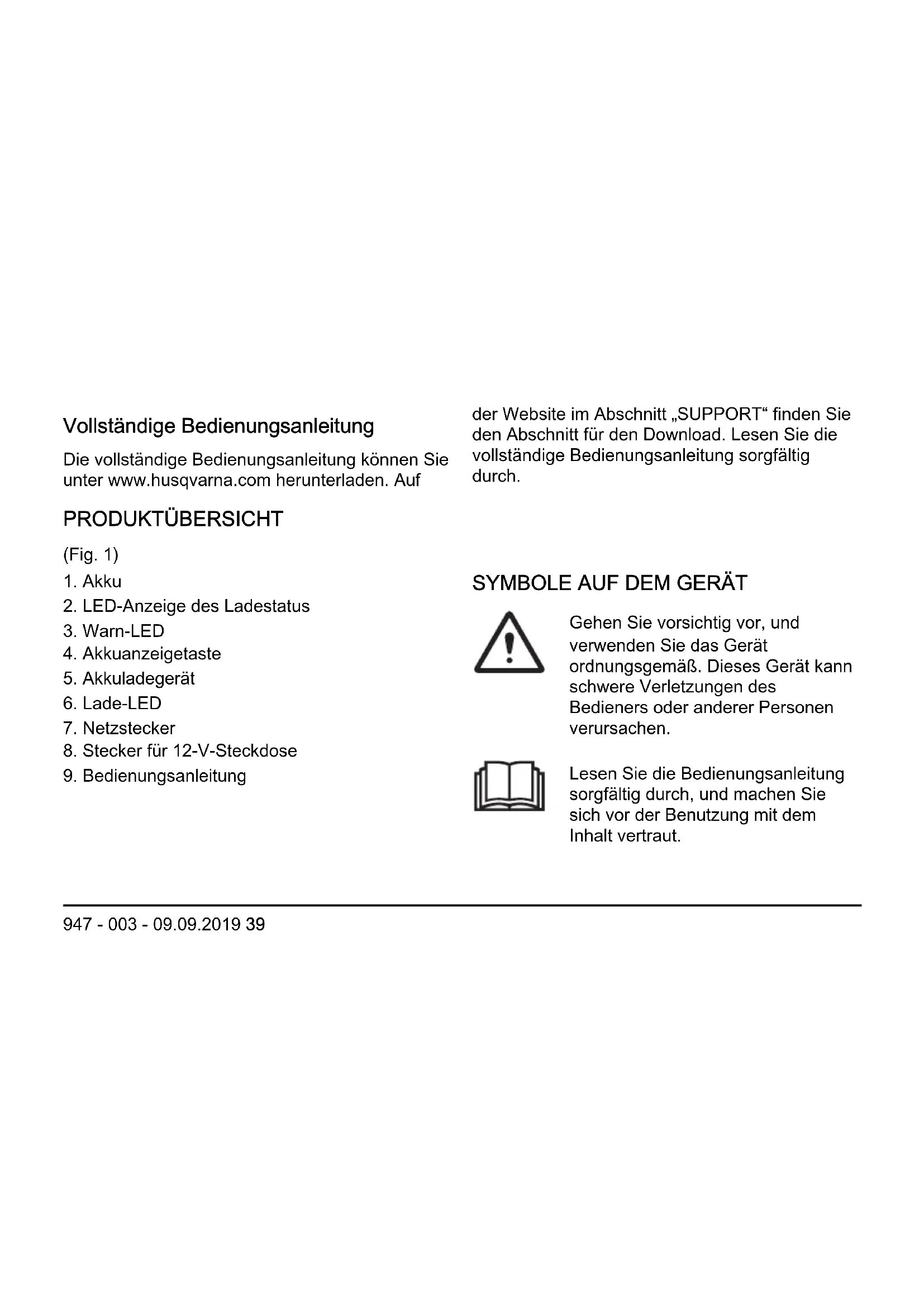 - Tal med din lokale Husqvarna-forhandler for yderligere oplysninger om, hvordan du genbruger og kasserer produktet. TEKNISKE DATA For tekniske data, se typeskiltet på batteriopladeren. 38 947 - 003 - 09.09.2019Vollständige Bedienungsanleitung Die vollständige Bedienungsanleitung können Sie unter www.husqvarna.com herunterladen. Auf der Website im Abschnitt „SUPPORT“ finden Sie den Abschnitt für den Download. Lesen Sie die vollständige Bedienungsanleitung sorgfältig durch. PRODUKTÜBERSICHT (Fig. 1)