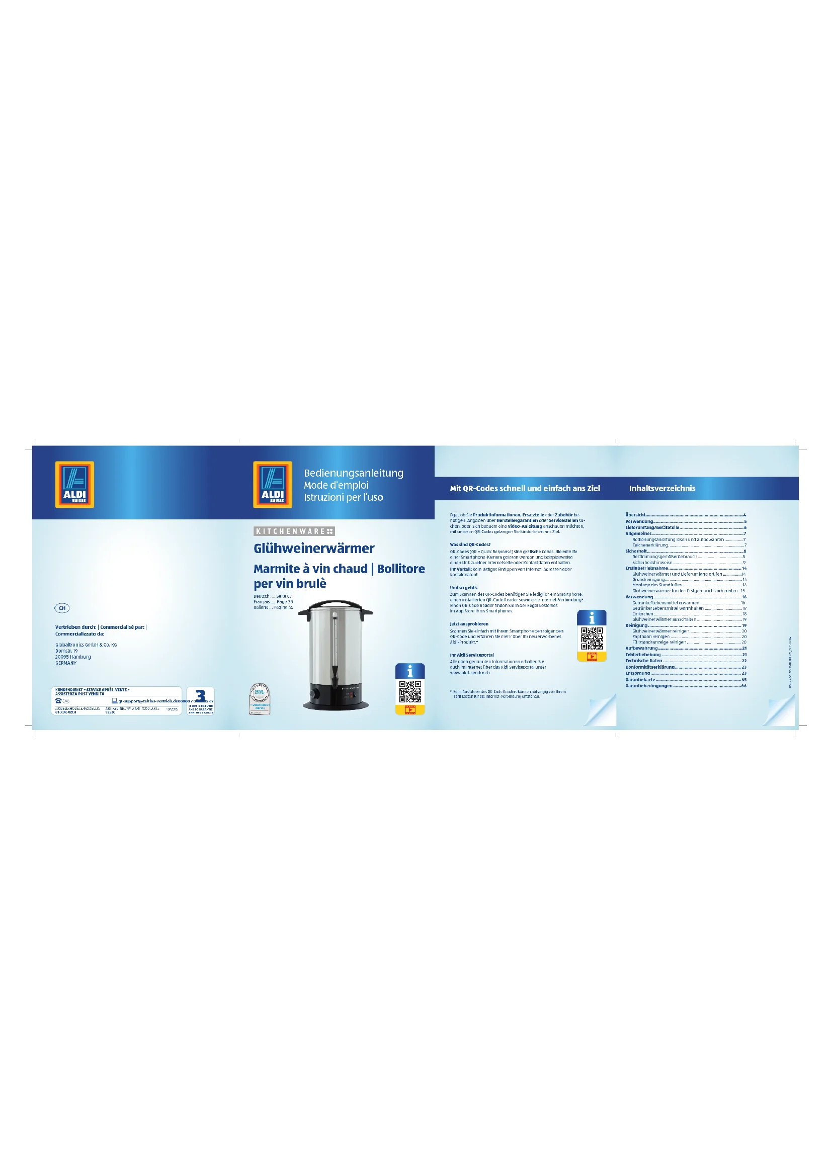Allgemeines Allgemeines Bedienungsanleitung lesen und aufbewahren Diese Bedienungsanleitung gehört zu diesem Glühweinerwärmer. Sie enthält wichtige Informationen zur Inbetriebnahme und Handhabung. Lesen Sie die Bedienungsanleitung, insbesondere die Sicherheitshin- weise, sorgfältig durch, bevor Sie den Glühweinerwärmer einsetzen. Die Nichtbeachtung dieser Bedienungsanleitung kann zu schweren Verletzungen oder Schäden am Glühweinerwärmer führen. Die Bedienungsanleitung basiert auf den in der Europäischen Union gültigen Normen und Regeln. Beachten Sie im Ausland auch landesspe- zifische Richtlinien und Gesetze. Bewahren Sie die Bedienungsanleitung für die weitere Nutzung auf. Wenn Sie den Glühweinerwärmer an Dritte weitergeben, geben Sie un- bedingt diese Bedienungsanleitung mit. Diese Bedienungsanleitung können Sie auch von unserem Service- Center im PDF-Format anfordern. Die Kontaktdaten finden Sie auf der Garantiekarte am Ende dieser Anleitung. Zeichenerklärung Die folgenden Symbole und Signalworte werden in dieser Bedienungsanleitung, auf dem Glühweinerwärmer oder auf der Verpackung verwendet. GEFAHR! Dieses Signalwort bezeichnet eine Gefährdung mit einem ho- hen Risikograd, die, wenn sie nicht vermieden wird, den Tod oder eine schwere Verletzung zur Folge hat. WARNUNG! Dieses Signalsymbol bezeichnet eine Gefährdung mit einem mittleren Risikograd, die, wenn sie nicht vermieden wird, den Tod oder eine schwere Verletzung zur Folge haben kann. VORSICHT! Dieses Signalsymbol bezeichnet eine Gefährdung mit einem niedrigen Risikograd, die, wenn sie nicht vermieden wird, eine gering- fügige oder mäßige Verletzung zur Folge haben kann. HINWEIS! Dieses Signalsymbol warnt vor möglichen Sachschäden oder gibt Ihnen nützliche Zusatzinformationen zum Zusammenbau oder zum Betrieb.Sicherheit