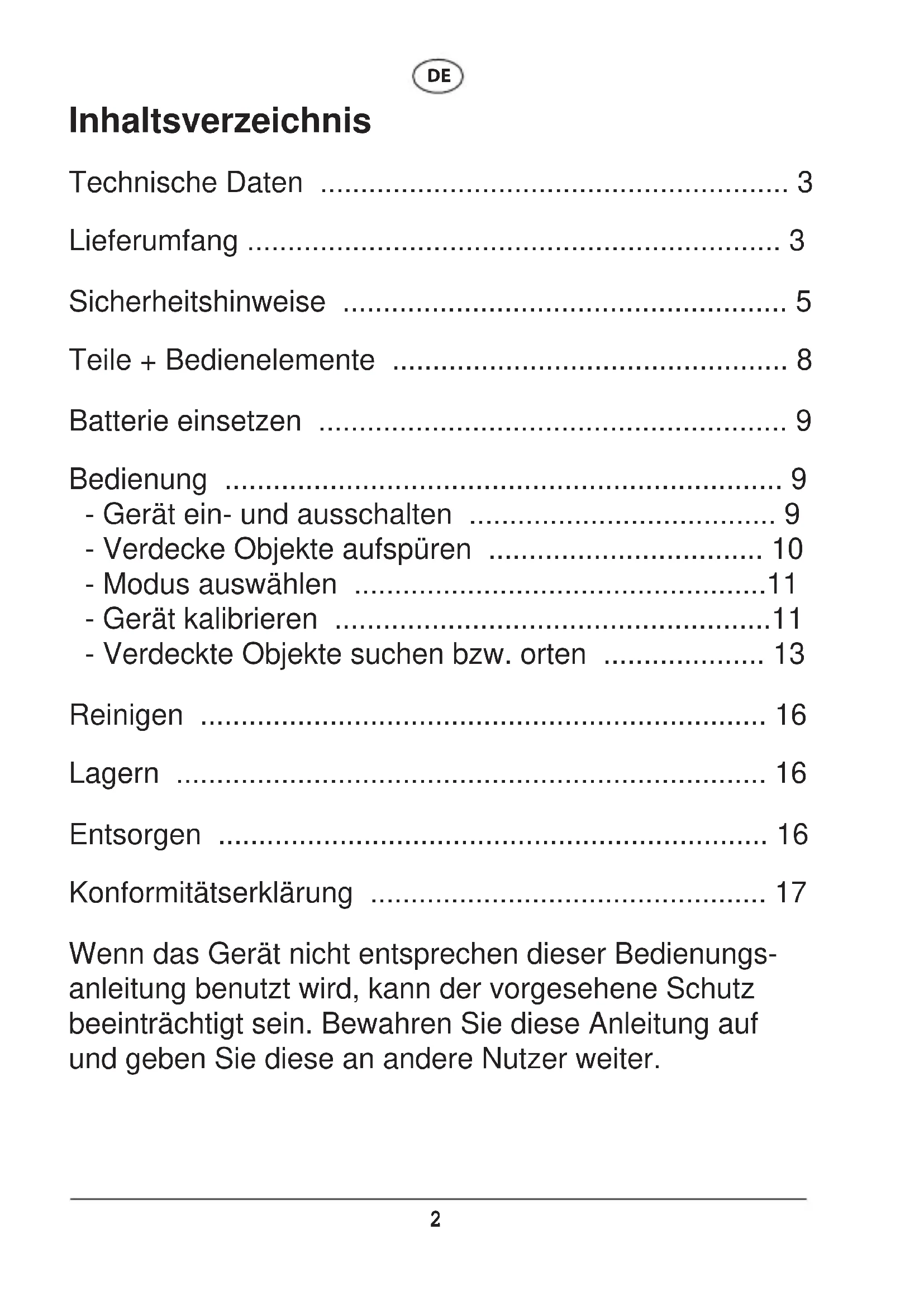 - Notice d’utilisation (34-49) DETETOR Manual de instruções (50-64)2 Inhaltsverzeichnis Technische Daten p. 3