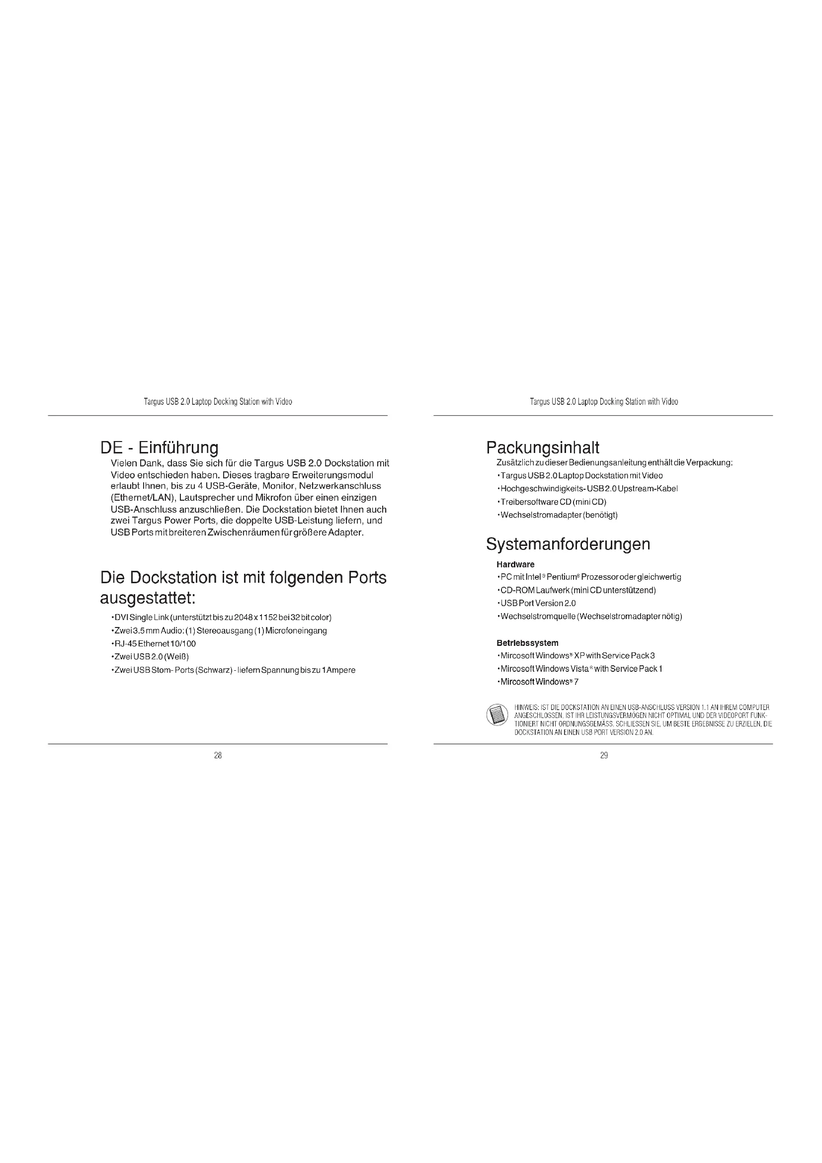 Gerät und Treiber installieren Um die Targus Dockstation nutzen zu können, müssen Sie zuerst den Treiber auf Ihrem Computer installieren. Schließen Sie die Dockstation an Ihren Computer an, und Windows Plug-and-Play wird die Hardwaretreiber für jeden Port installieren. WARNUNG: SIE MÜSSEN DIE SOFTWARE FÜR DIE DOCKSTATION INSTALLIEREN, BEVOR SIE SIE AN DEN COMPUTER ANSCHLIESSEN. ANDERNFALLS ARBEITET DIE DOCKSTATION NICHT ORDNUNGSGEMÄSS. Treiber für Dockstation installieren Die Installation der Dockstation-Treiber ermöglicht es Ihrem Betriebssystem, die Dockstation und ihre Ports zu erkennen, wenn sie angeschlossen ist. 1 Schalten Sie Ihren Computer ein. 2 Legen Sie die CD mit der Treibersoftware in das CD-ROM-Laufwerk Ihres Computers ein. Sollte die Einrichtung nicht automatisch beginnen, klicken Sie Start, Ausführen und und rufen Sie D:\Setup.exe auf (wenn D: der Pfad Ihres CD-ROM-Laufwerks ist), und klicken Sie dann OK. 3 Folgen Sie den Anweisungen auf dem Bildschirm, um die Installation fertig zu stellen. 4 Klicken Sie Fertigstellen und starten Sie den Computer neu, wenn Sie dazu aufgefordert werden. Anschluss der Dockstation an den Computer Nach der Installation der Dockstation-Software können Sie die Docksta- tion an den Computer anschliessen. Um das zu tun: 1 Schließen Sie den mitgelieferten Wechselstromadapter an die Wechsel- strombuchse der Dockstation an. 2 Verbinden Sie das eine Ende des USB-Kabels mit der Dockstation, und das andere Ende mit einem freien USB Port an Ihrem Computer. WARNUNG: DIE DOCKSTATION WIRD NICHT ORDNUNGSGEMÄSS ARBEITEN, WENN DER WECHSELSTROMADAPTER NICHT IN EINE WECHSELSTROMSTECK- DOSE EINGESTECKT IST. SCHLIESSEN SIE KEINE GERÄTE AN DIE DOCKSTATION AN, BEVOR DIE INSTAL- LATION FERTIGGESTELLT IST.Targus USB 2.0 Laptop Docking Station with Video