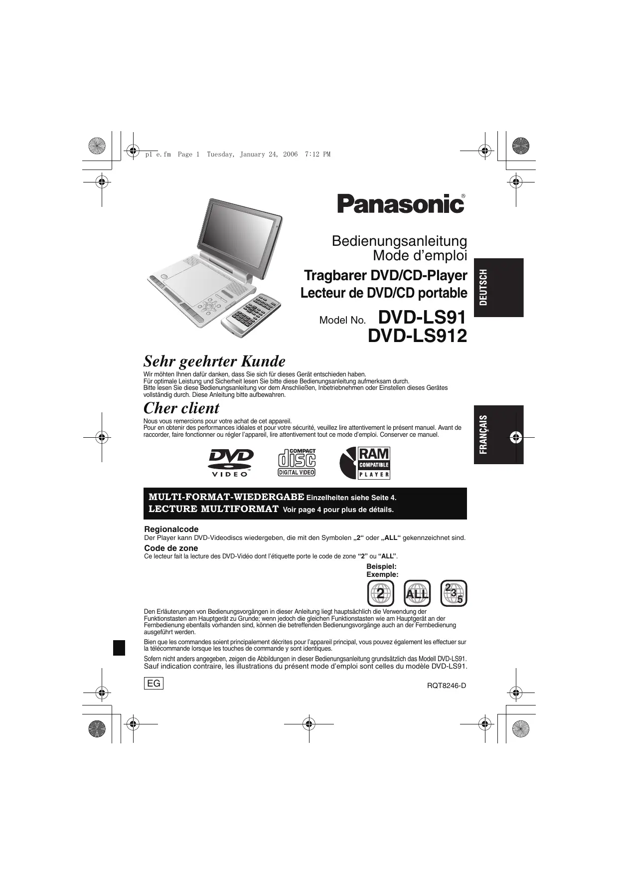 p1 e.fm Page 1 Tuesday, January 24, 2006 7:12 PM Bedienungsanleitung Mode d’emploi Tragbarer DVD/CD-Player Lecteur de DVD/CD portable Model No. DVD-LS91 DVD-LS912 Sehr geehrter Kunde Wir möhten Ihnen dafür danken, dass Sie sich für dieses Gerät entschieden haben. Für optimale Leistung und Sicherheit lesen Sie bitte diese Bedienungsanleitung aufmerksam durch. Bitte lesen Sie diese Bedienungsanleitung vor dem Anschließen, Inbetriebnehmen oder Einstellen dieses Gerätes vollständig durch. Diese Anleitung bitte aufbewahren. Cher client Nous vous remercions pour votre achat de cet appareil. Pour en obtenir des performances idéales et pour votre sécurité, veuillez lire attentivement le présent manuel. Avant de raccorder, faire fonctionner ou régler l’appareil, lire attentivement tout ce mode d’emploi. Conserver ce manuel. MULTI-FORMAT-WIEDERGABE Einzelheiten siehe Seite 4. LECTURE MULTIFORMAT Voir page 4 pour plus de détails. Regionalcode Der Player kann DVD-Videodiscs wiedergeben, die mit den Symbolen „2“ oder „ALL“ gekennzeichnet sind. Code de zone Ce lecteur fait la lecture des DVD-Vidéo dont l’étiquette porte le code de zone “2” ou “ALL”. Beispiel: Exemple: