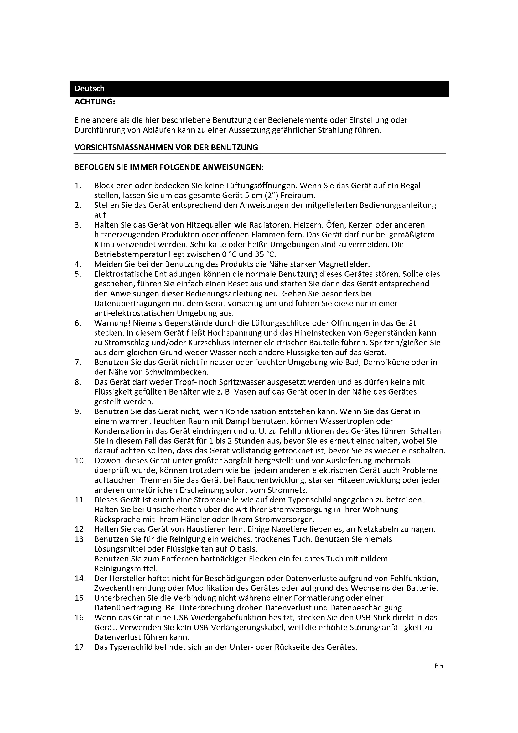 14. Der Hersteller haftet nicht für Beschädigungen oder Datenverluste aufgrund von Fehlfunktion,