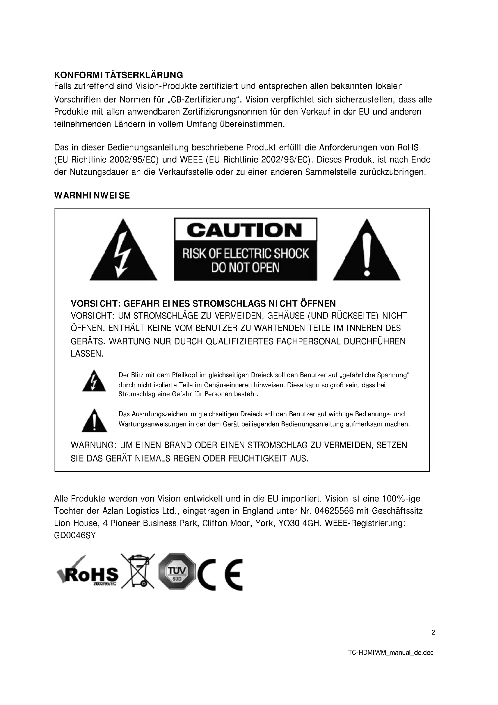 VORSICHT: UM STROMSCHLÄGE ZU VERMEIDEN, GEHÄUSE (UND RÜCKSEITE) NICHT ÖFFNEN. ENTHÄLT KEINE VOM BENUTZER ZU WARTENDEN TEILE IM INNEREN DES GERÄTS. WARTUNG NUR DURCH QUALIFIZIERTES FACHPERSONAL DURCHFÜHREN LASSEN. Der Blitz mit dem Pfeilkopf im gleichseitigen Dreieck soll den Benutzer auf „gefährliche Spannung” durch nicht isolierte Teile im Gehäuseinneren hinweisen. Diese kann so groß sein, dass bei Stromschlag eine Gefahr für Personen besteht. Das Ausrufungszeichen im gleichseitigen Dreieck soll den Benutzer auf wichtige Bedienungs- und Wartungsanweisungen in der dem Gerät beiliegenden Bedienungsanleitung aufmerksam machen. WARNUNG: UM EINEN BRAND ODER EINEN STROMSCHLAG ZU VERMEIDEN, SETZEN SIE DAS GERÄT NIEMALS REGEN ODER FEUCHTIGKEIT AUS. Alle Produkte werden von Vision entwickelt und in die EU importiert. Vision ist eine 100%-ige Tochter der Azlan Logistics Ltd., eingetragen in England unter Nr. 04625566 mit Geschäftssitz Lion House, 4 Pioneer Business Park, Clifton Moor, York, YO30 4GH. WEEE-Registrierung: GD0046SY3 TC-HDMIWM_manual_de.doc