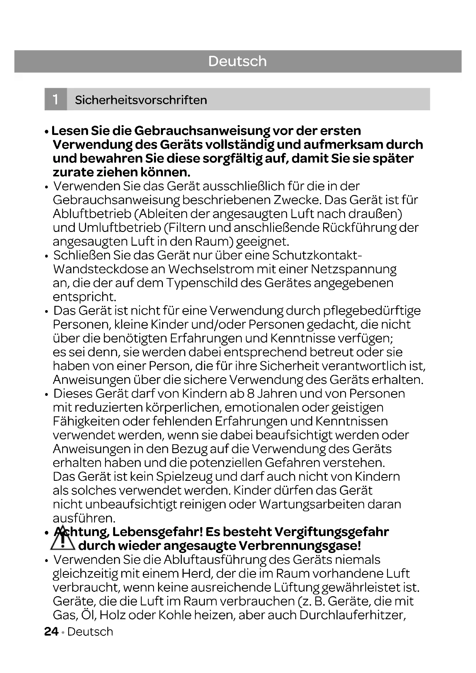 - Verwenden Sie die Abluftausführung des Geräts niemals gleichzeitig mit einem Herd, der die im Raum vorhandene Luft verbraucht, wenn keine ausreichende Lüftung gewährleistet ist. Geräte, die die Luft im Raum verbrauchen (z.B. Geräte, die mit Gas, Öl, Holz oder Kohle heizen, aber auch Durchlauferhitzer, 24 • DeutschDeutsch • 25 Warmwassergeräte), entziehen dem Raum, in dem sie aufgestellt sind, die Verbrennungsluft und leiten die Gase über eine Abfuhr (z.B. einen Schornstein) ins Freie. In Kombination mit einer eingeschalteten Abzugshaube wird in solchen Fällen Luft aus der Küche und den daneben gelegenen Räumen angesaugt. Ohne eine ausreichende Luftzufuhr entsteht dadurch Unterdruck. Giftige Gase aus dem Schornstein oder dem Abfuhrkanal werden durch diesen Unterdruck wieder in den Wohnbereich gesaugt. Sorgen Sie daher immer für eine ausreichende Lüftung!